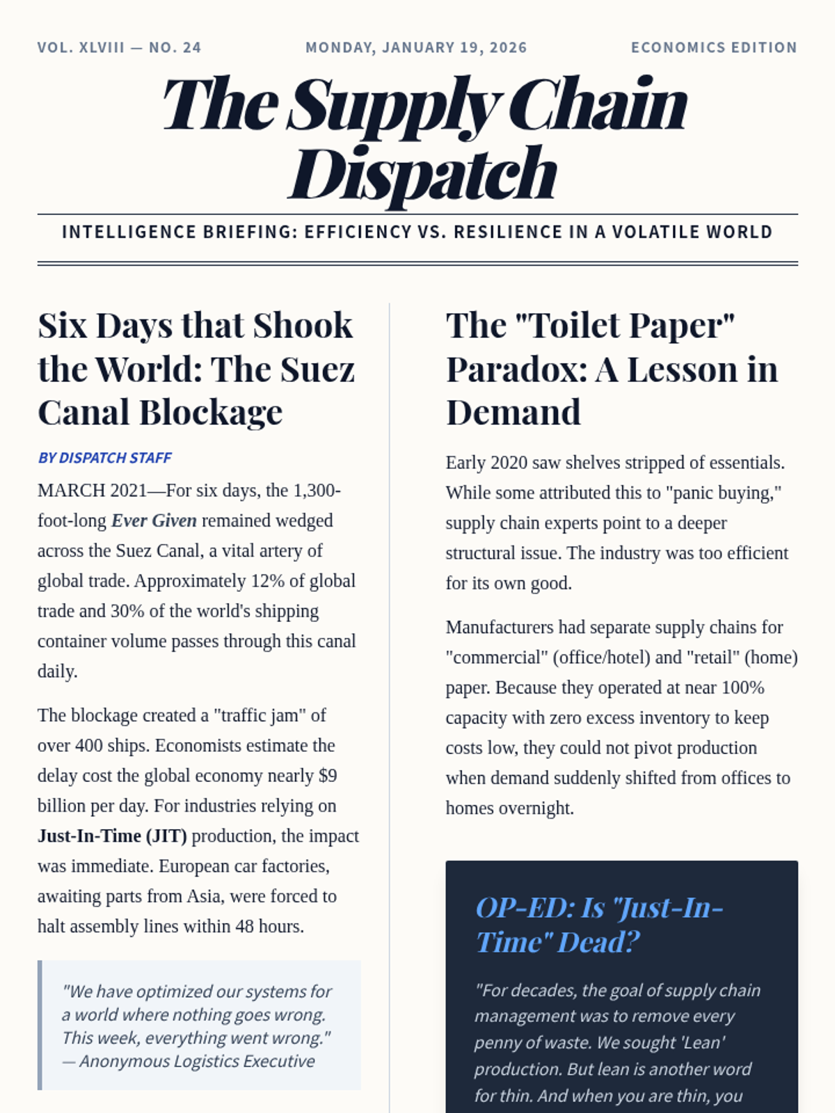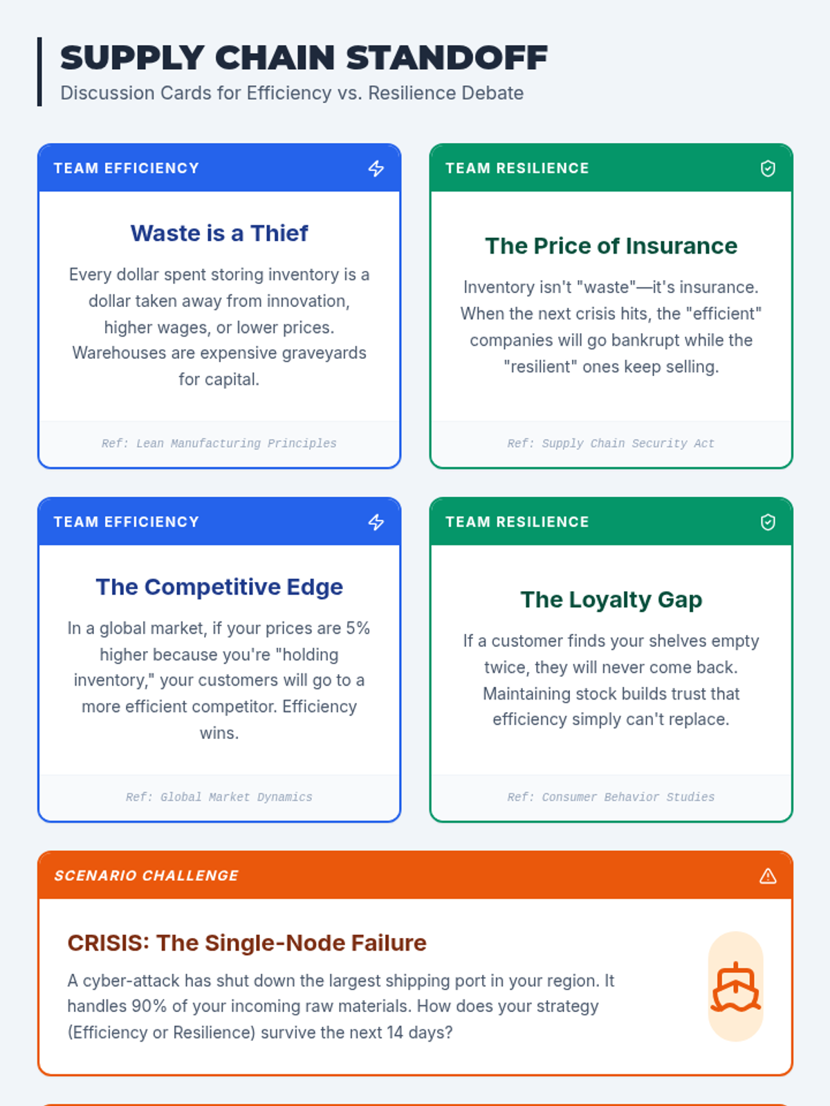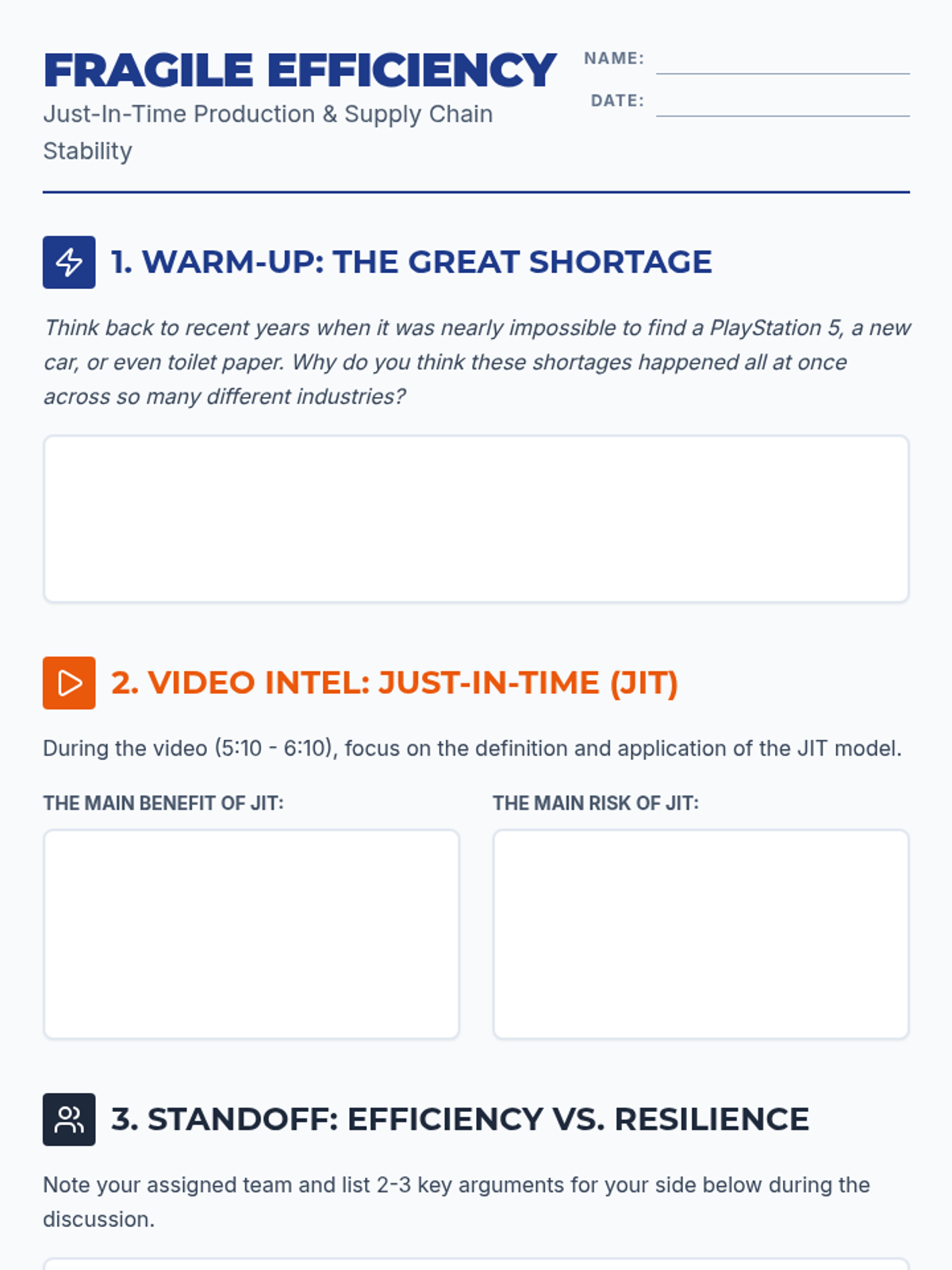 This lesson explores the trade-offs of Just-In-Time production, analyzing how the drive for maximum efficiency can lead to systemic fragility in global supply chains. Students will debate the merits of lean manufacturing versus resilient inventory management using real-world case studies like the COVID-19 pandemic and the Suez Canal blockage.
