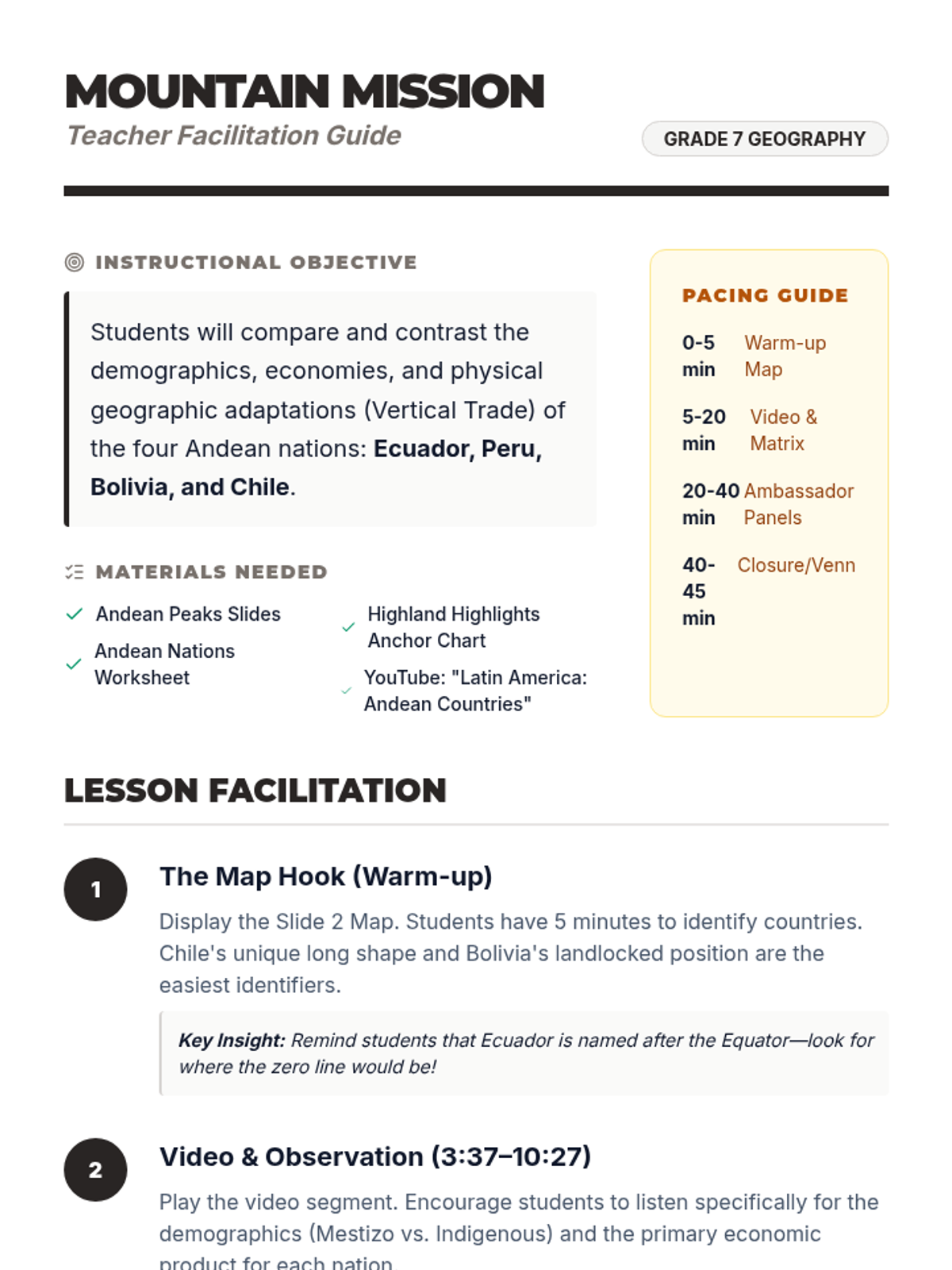 Students explore the diverse geography, cultures, and economies of the Andean nations (Ecuador, Peru, Bolivia, and Chile) through a travel-planning lens. The lesson features a documentary on the region, vertical trade concepts, and a creative travel brochure project.