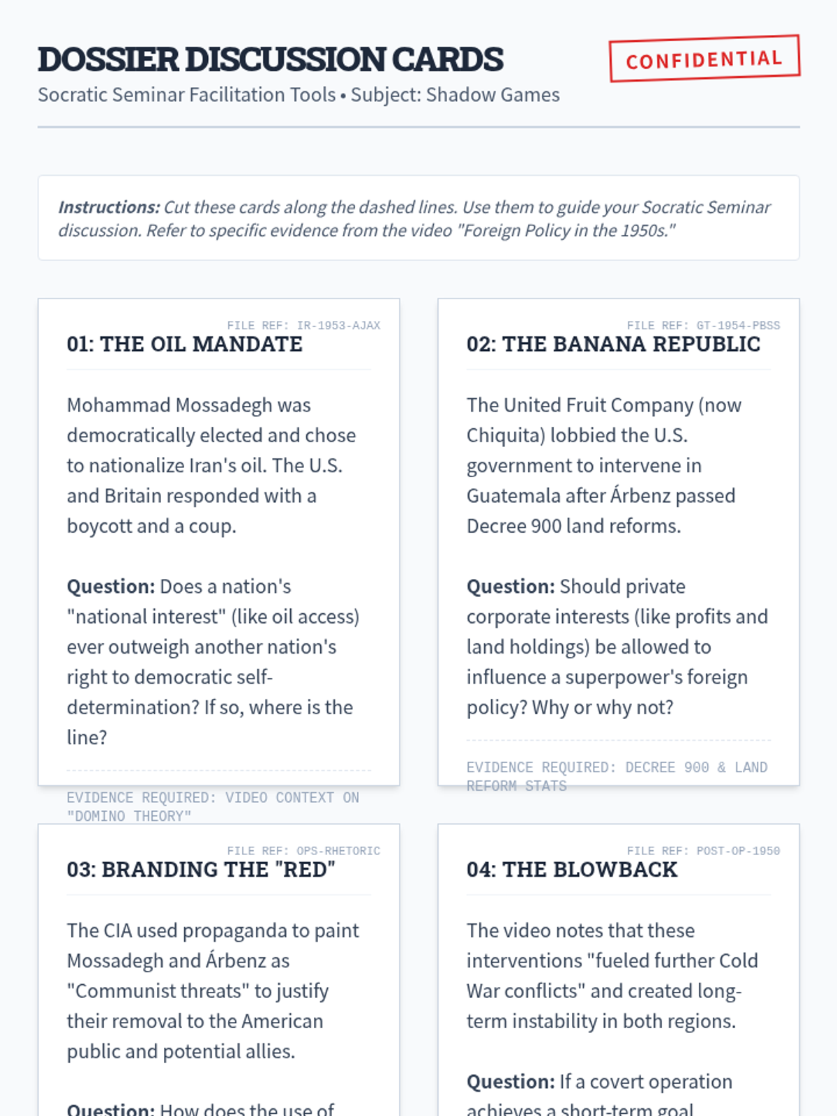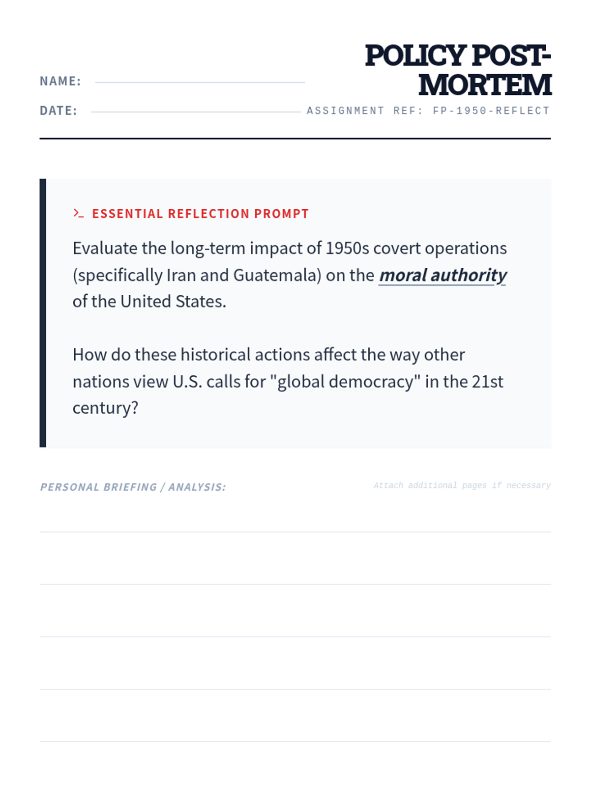 A 45-minute 11th Grade Civics lesson evaluating the ethical implications of 1950s covert operations in Iran and Guatemala, focusing on the tension between national security, economic interests, and democratic values.
