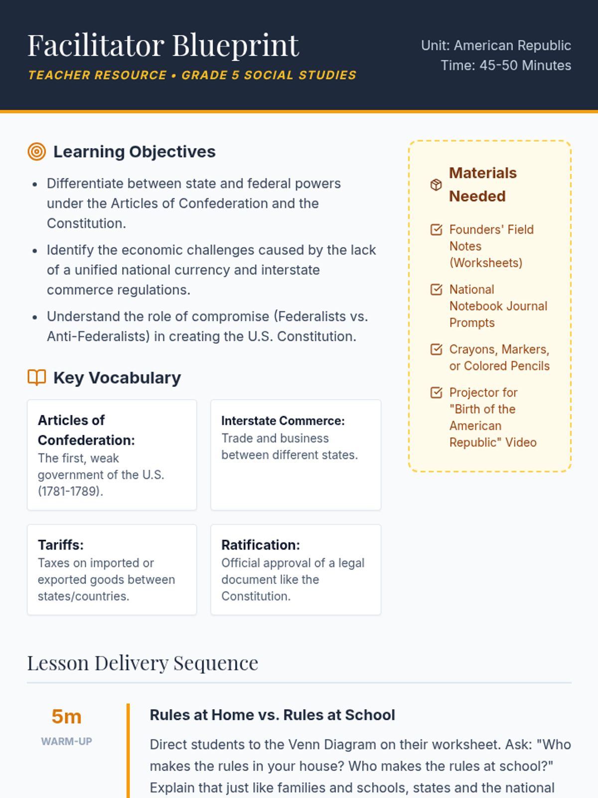 A 45-60 minute lesson exploring the weaknesses of the Articles of Confederation, the impact of Shays' Rebellion, and the eventual call for a constitutional convention. The lesson uses high-engagement strategies like Think-Pair-Share and Stop-and-Jot to support all learners.
