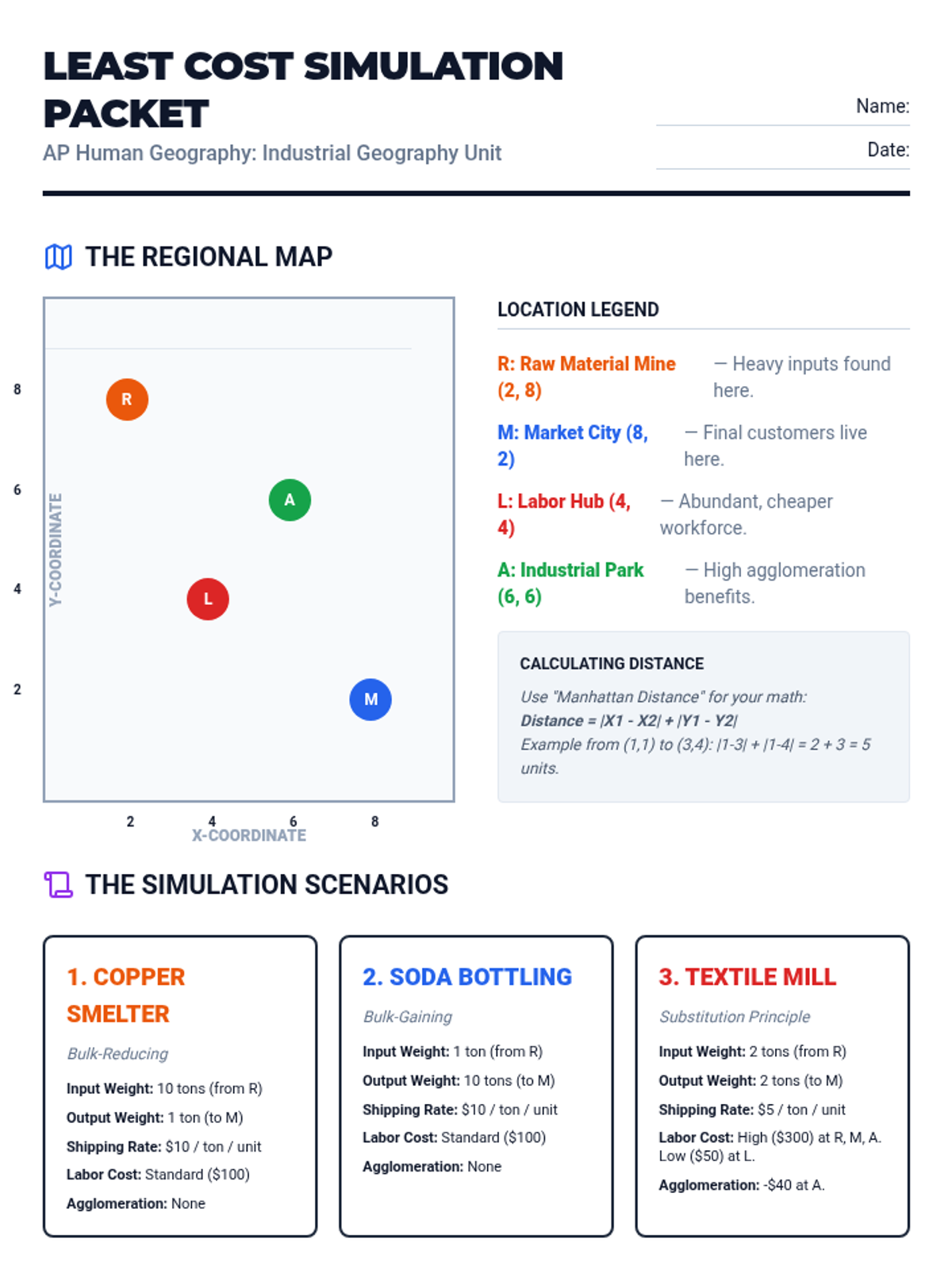 Students explore Alfred Weber's Least Cost Theory through a hands-on simulation. They will analyze bulk-gaining and bulk-reducing industries, watch a Crash Course Geography video, and calculate optimal factory locations based on transportation, labor, and agglomeration costs.