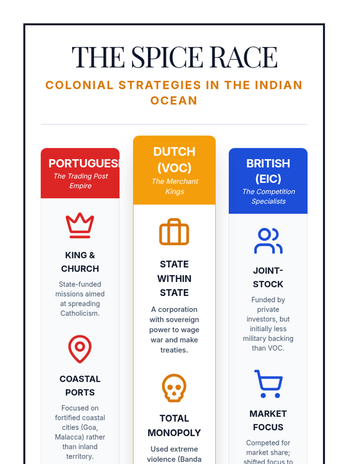 A 10th-grade World History lesson comparing the innovative and ruthless corporate-state model of the Dutch East India Company (VOC) with the colonization strategies of the Portuguese and British in the Indian Ocean.
