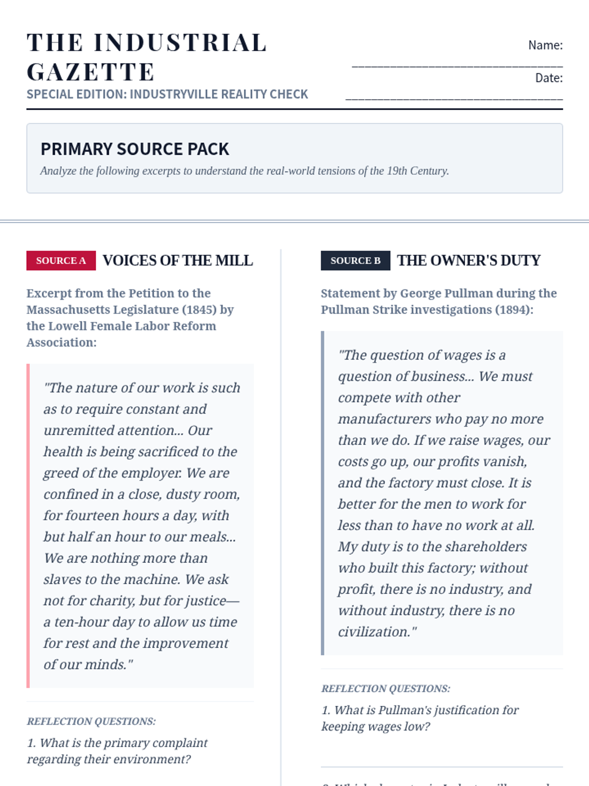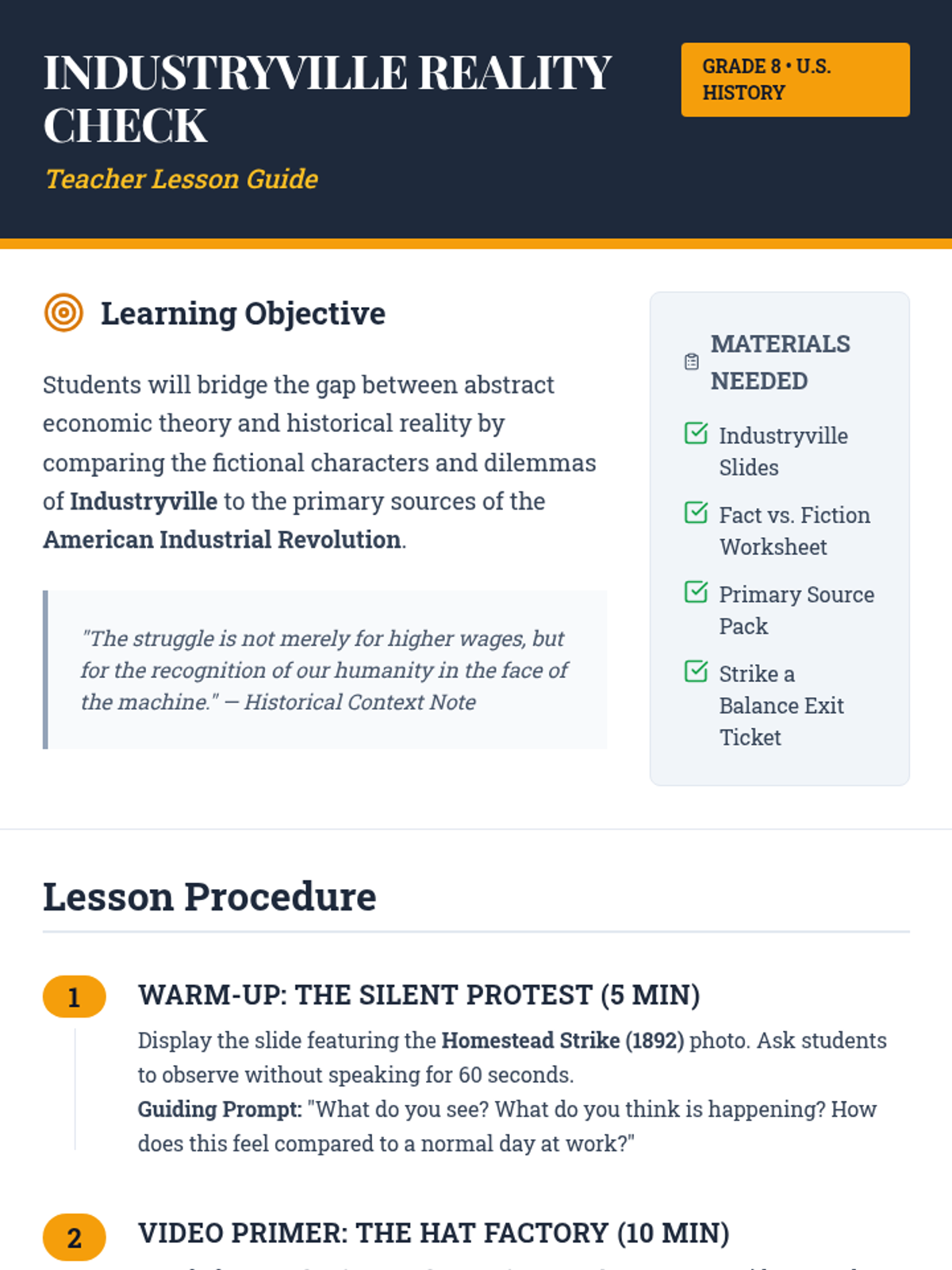 This lesson connects the fictional economic concepts of 'Industryville' to the real-world historical context of the American Industrial Revolution, focusing on the conflicting interests of labor, business, and government.