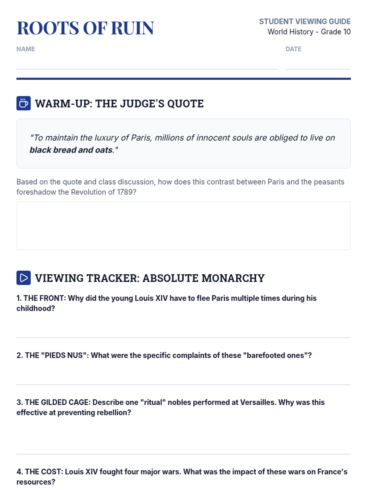 A 10th-grade lesson exploring how Louis XIV's absolute rule, lavish spending at Versailles, and constant warfare sowed the seeds of the French Revolution nearly a century later. Students analyze primary source visuals and track economic and social consequences.