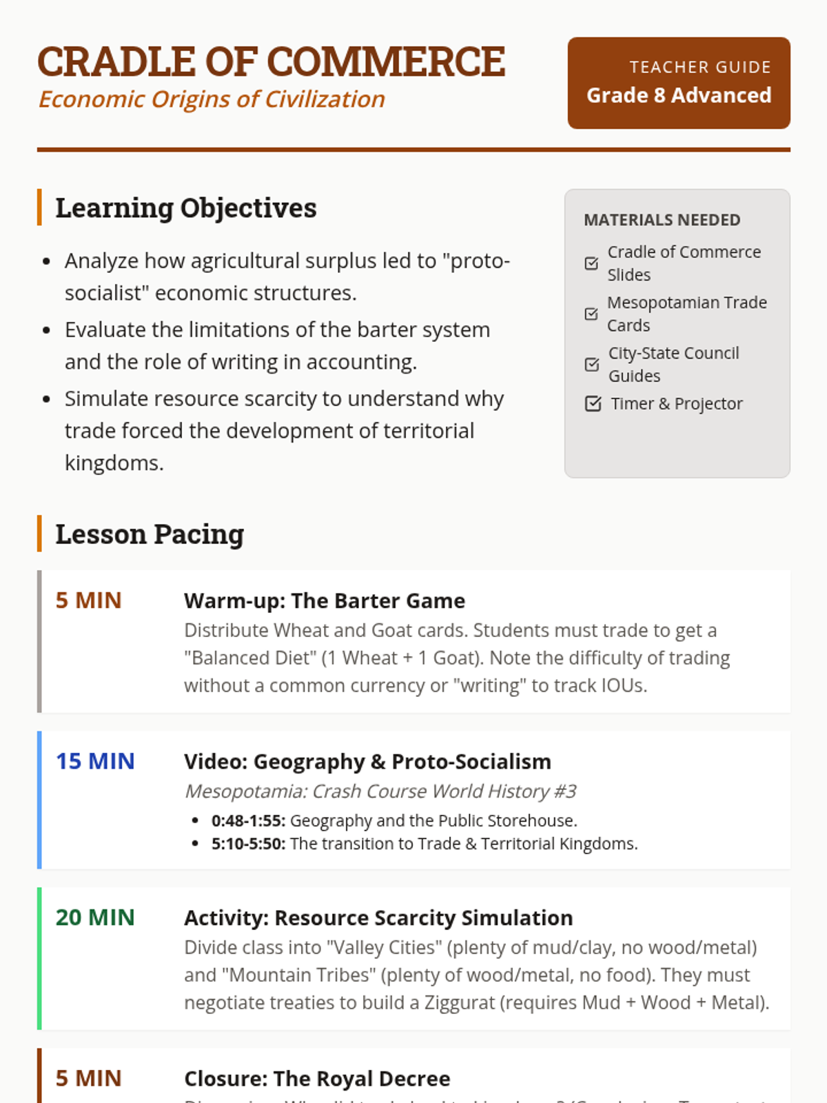 An exploration of the economic drivers that led to the rise of civilization in Mesopotamia, focusing on agricultural surplus, the barter system, and the necessity of long-distance trade. Students participate in a scarcity simulation to understand how resource needs drove the creation of territorial kingdoms.