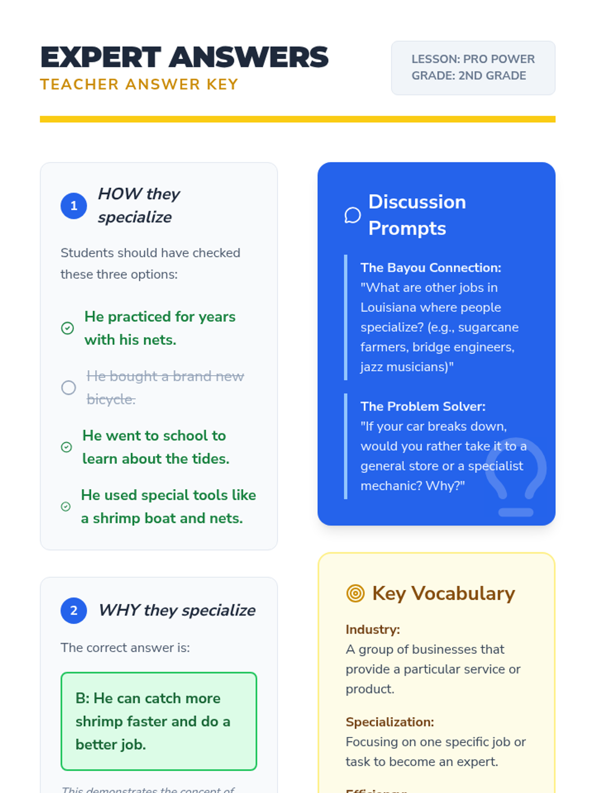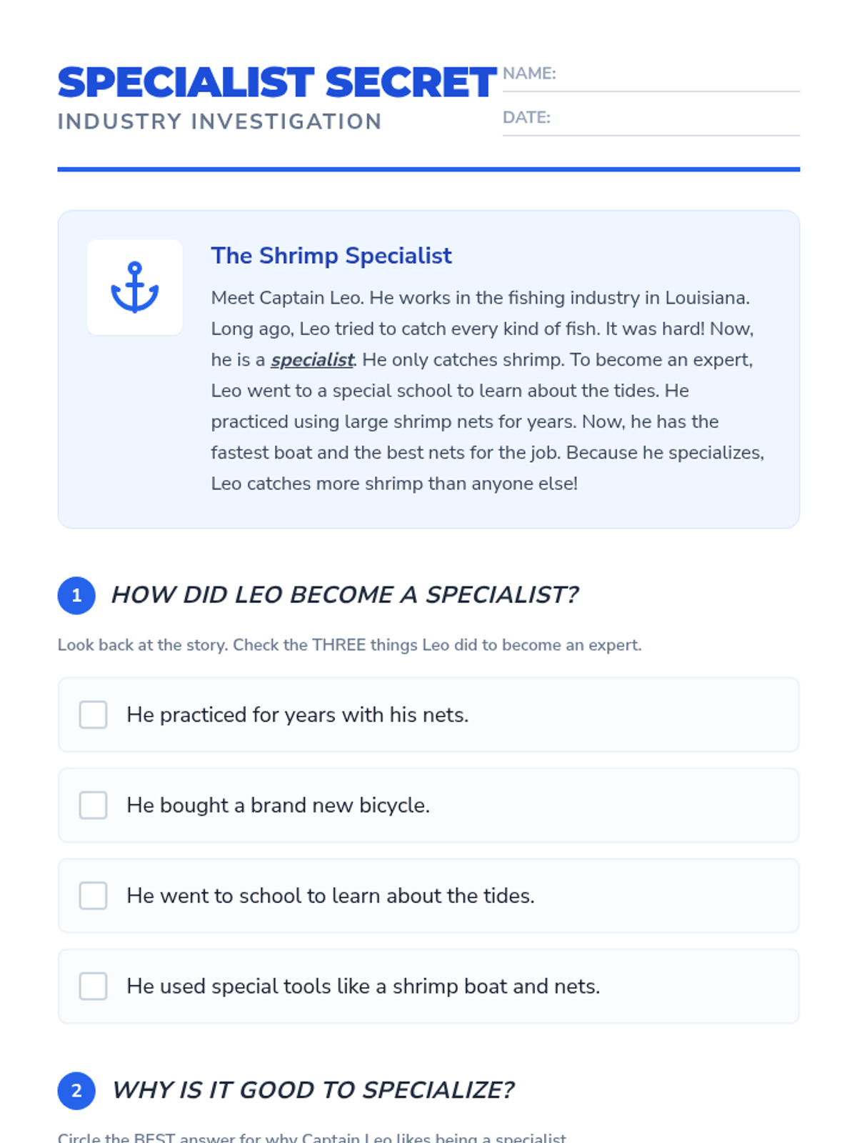 Students will explore the concept of specialization in industry, learning how workers become experts in specific tasks and why this helps businesses succeed.