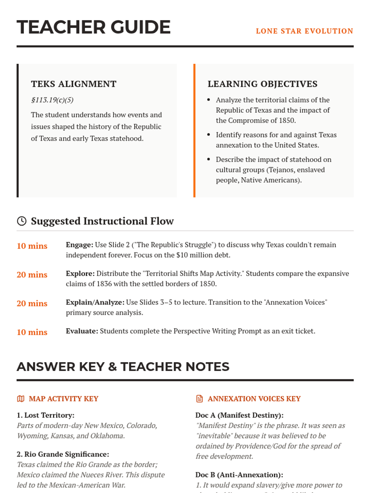 A comprehensive lesson on the Republic of Texas (1836-1845) and the transition to US statehood, focusing on territorial changes, the annexation debate, and the impact on diverse cultural groups.