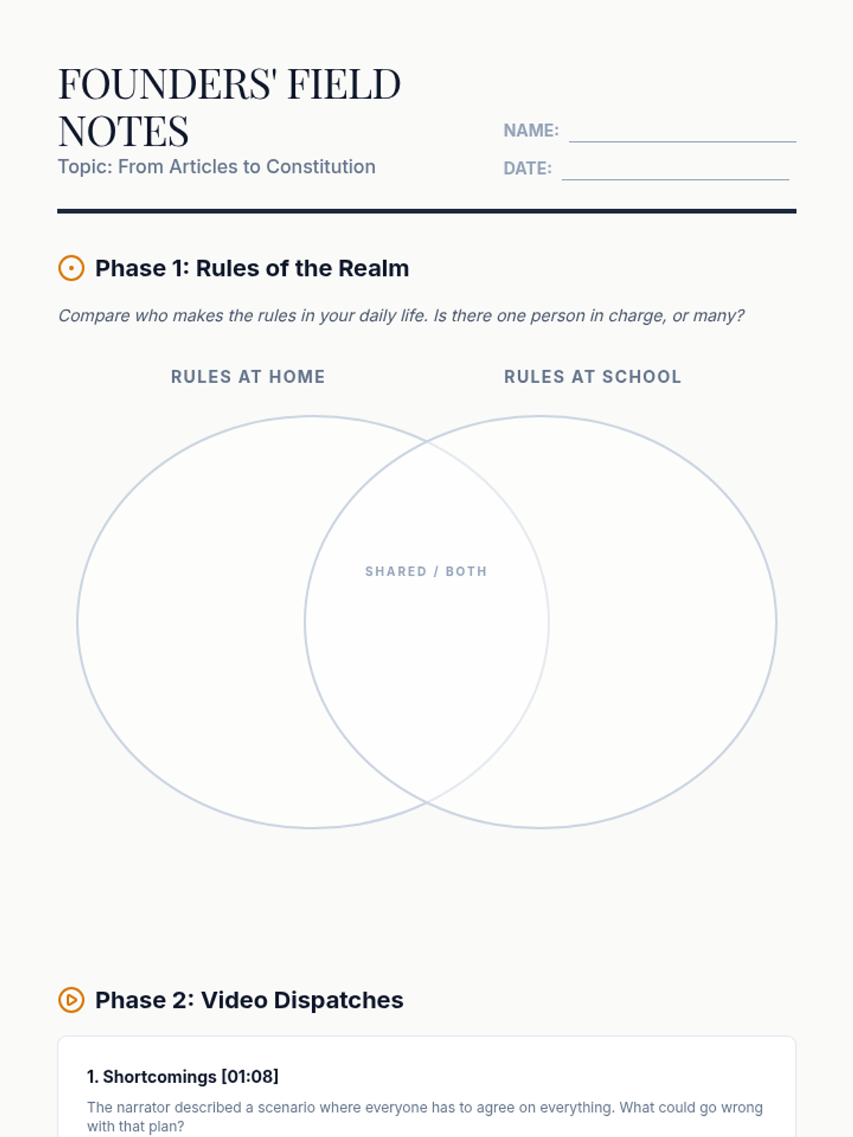 This lesson explores the transition from the Articles of Confederation to the U.S. Constitution, focusing on the challenges of state-led commerce and the need for a unified federal system. Students will watch a guided video, design their own state currencies in a hands-on activity, and reflect on the benefits of a single national economy.