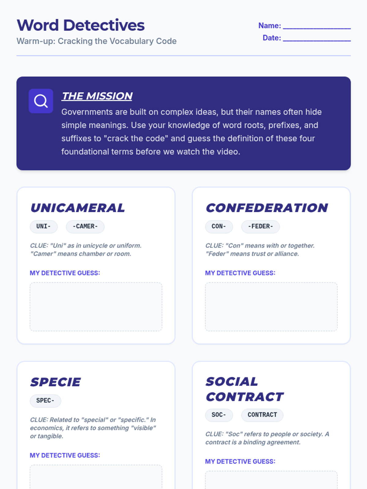 A lesson focused on identifying and analyzing different forms of government through scenario-based assessments and critical thinking exercises.