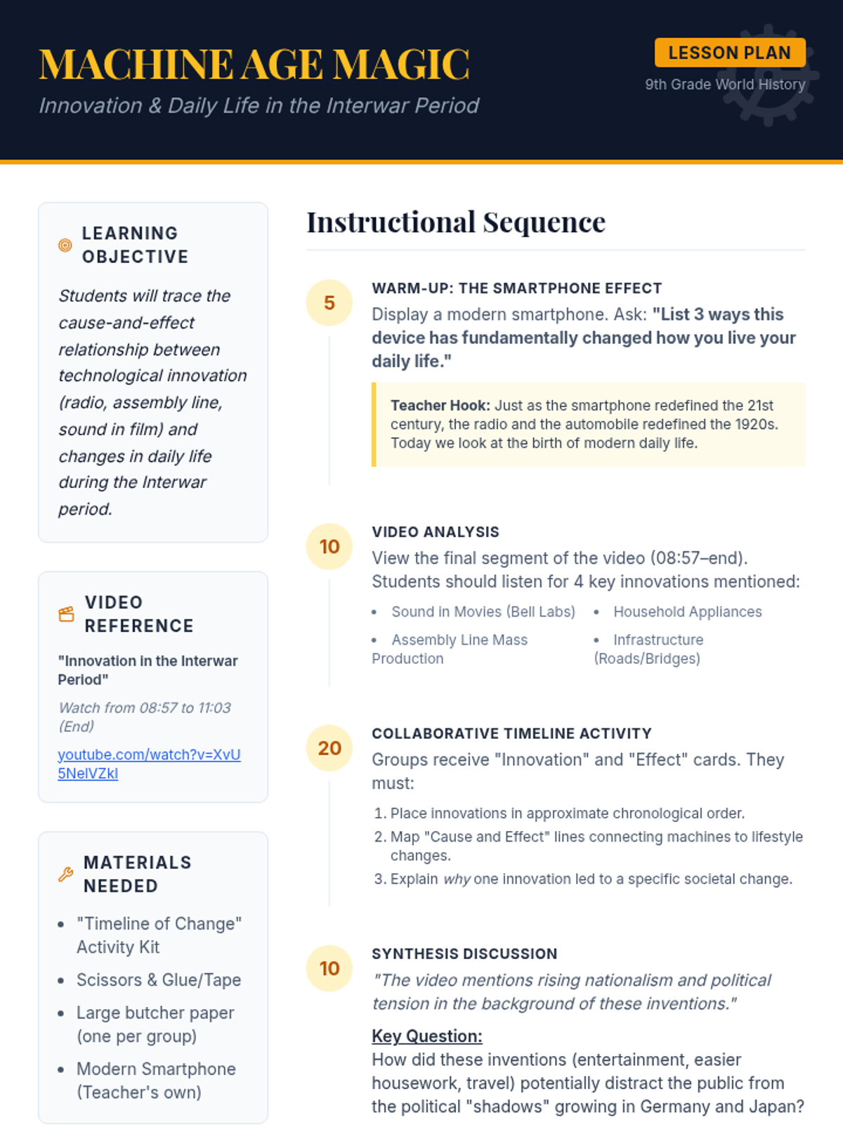 A 9th-grade history lesson exploring how 1920s technological innovations like the assembly line and talking movies fundamentally changed daily life, while potentially masking the era's growing political tensions.