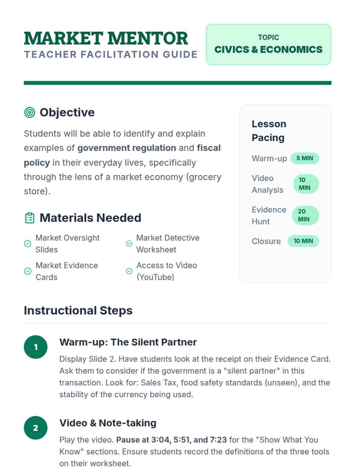 Students will explore how the government influences the economy through fiscal policy, monetary policy, and regulation using the relatable context of a grocery store. The lesson includes a video analysis, a hands-on 'evidence hunt' with food packaging, and a reflective discussion on the visibility of government in daily life.
