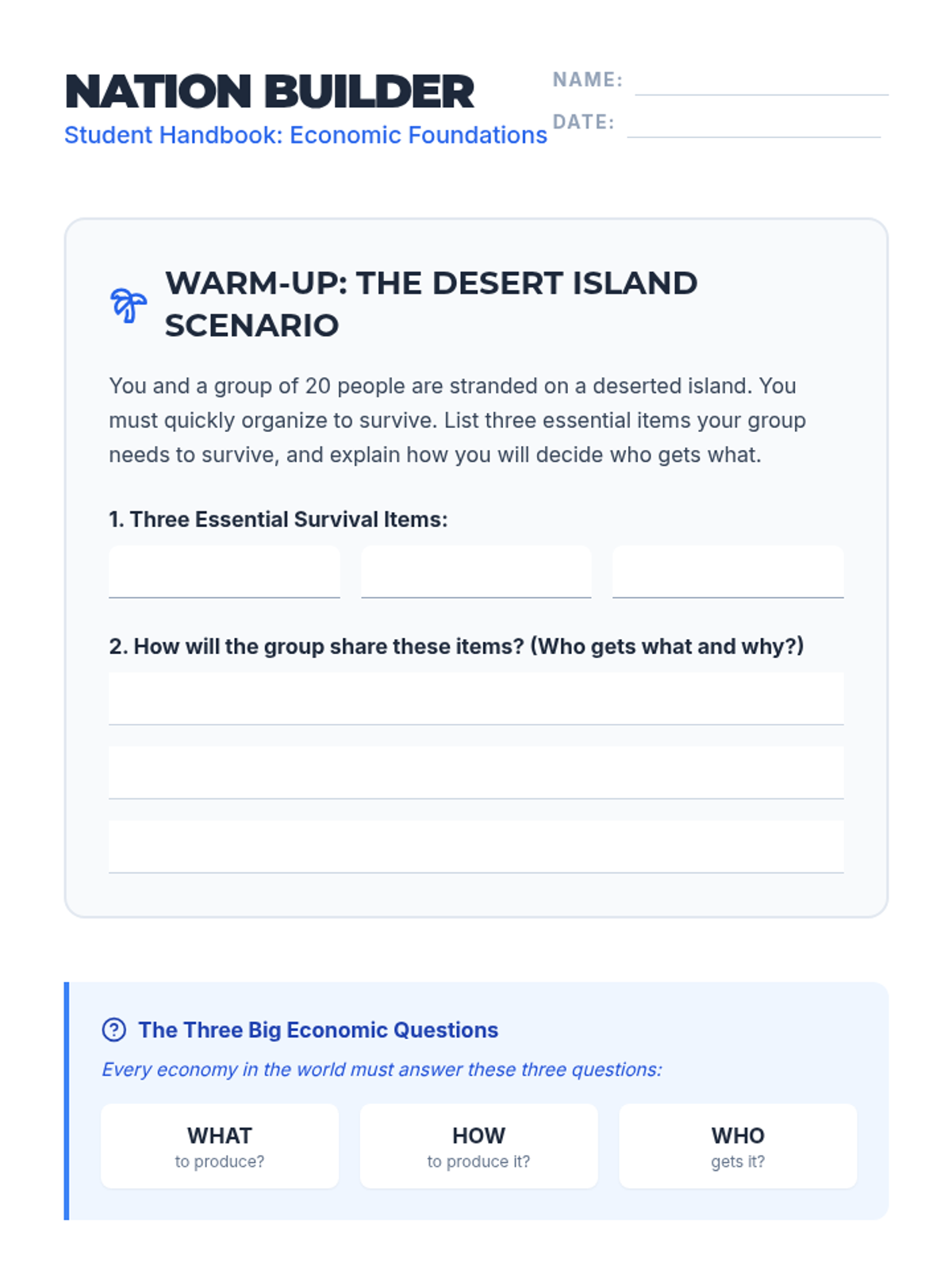 A Middle School Social Studies lesson exploring Traditional, Command, Market, and Mixed economic systems through a 'Nation Builder' lens. Students analyze the three fundamental economic questions and design their own country's constitution.