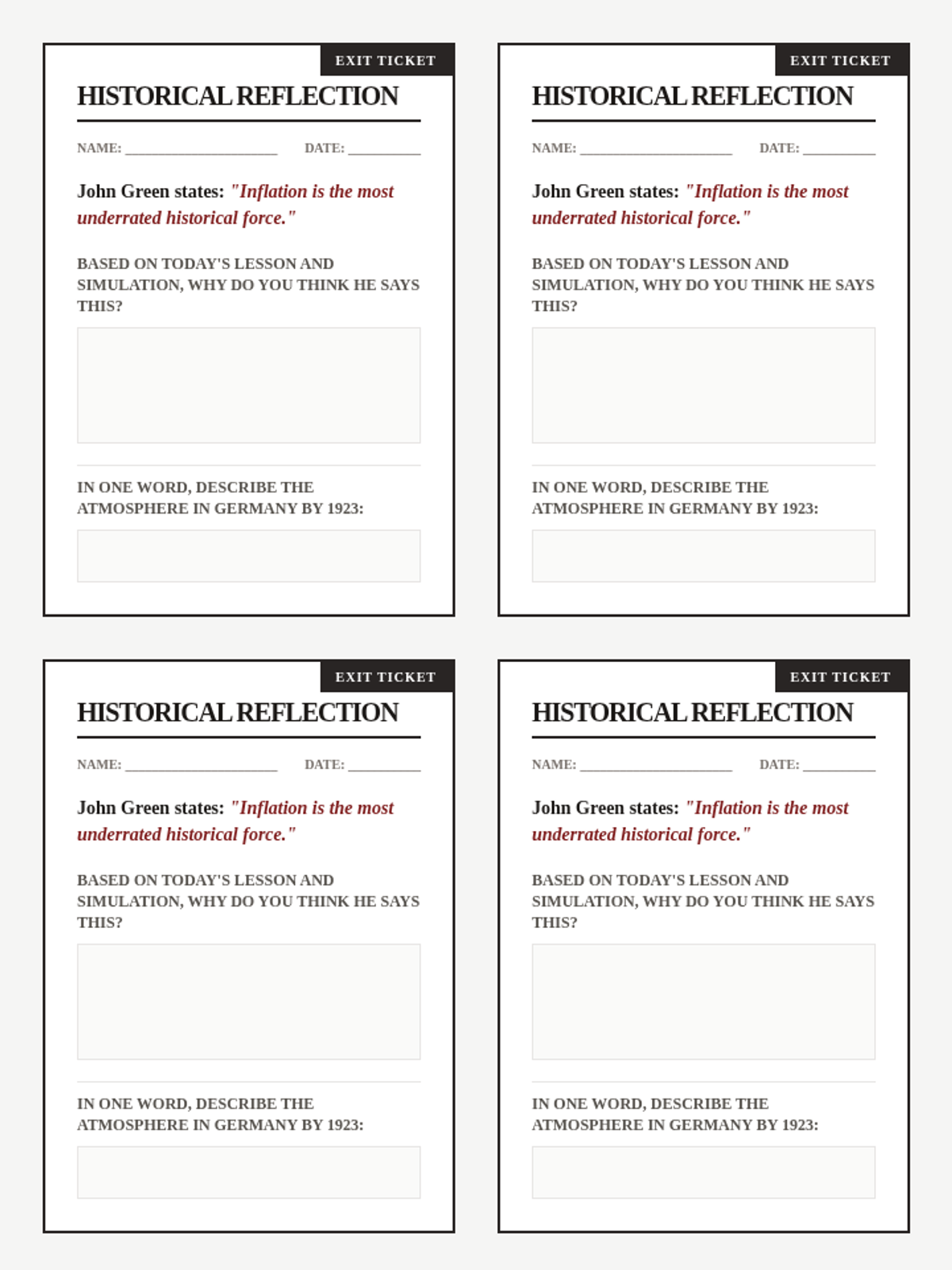A lesson focusing on the distinction between inflation and hyperinflation using the historical context of 1923 Germany. Students watch a video on the Weimar Republic and then graph the exponential collapse of the German Mark.