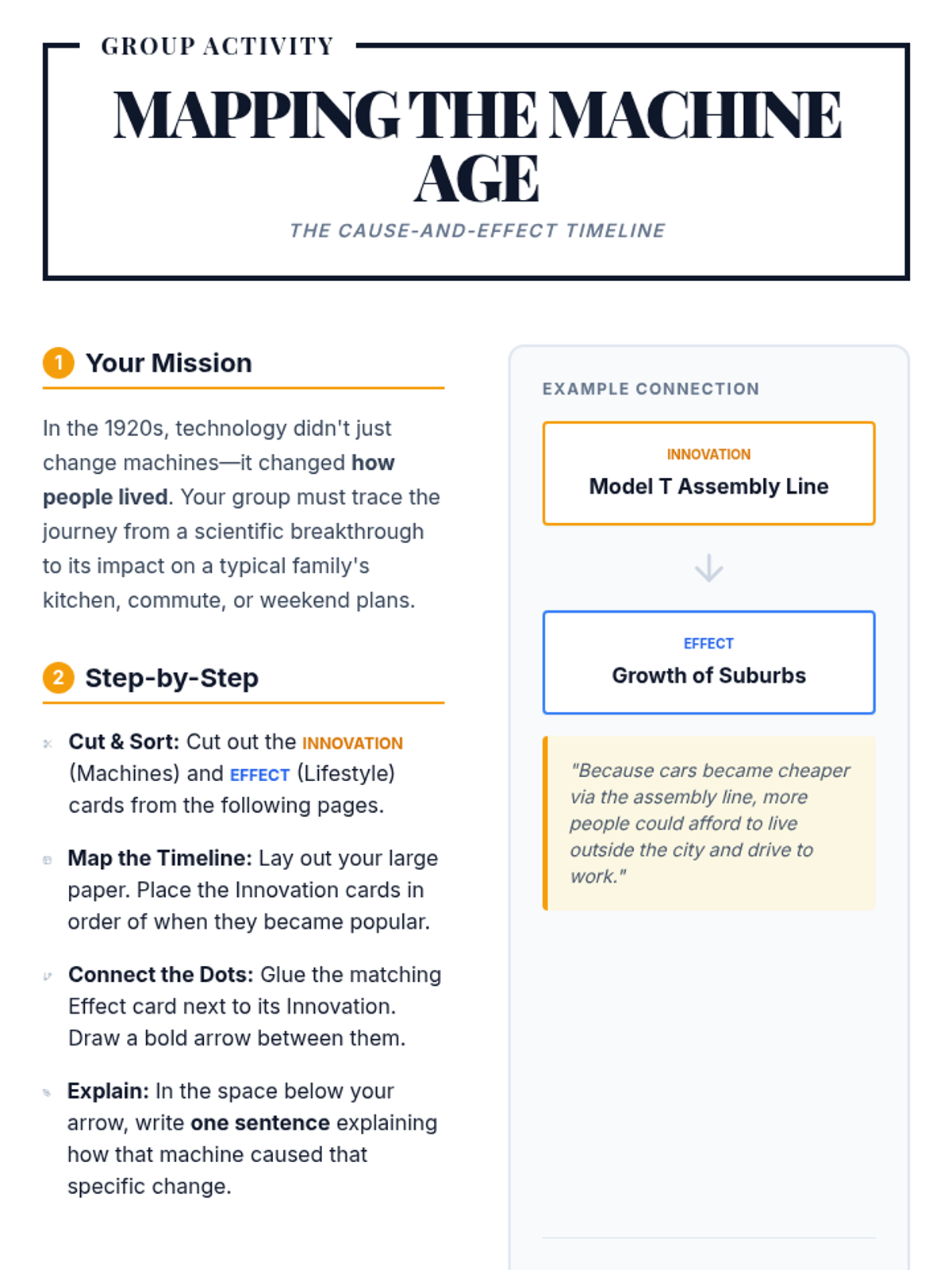A comprehensive 1-day station-based lesson comparing the social, political, and cultural shifts between the 1920s and the 1950s. Students rotate through five stations exploring gender roles, political paranoia, minority experiences, suburbanization, and the political climate.