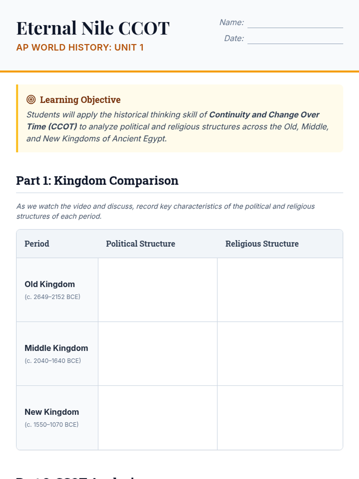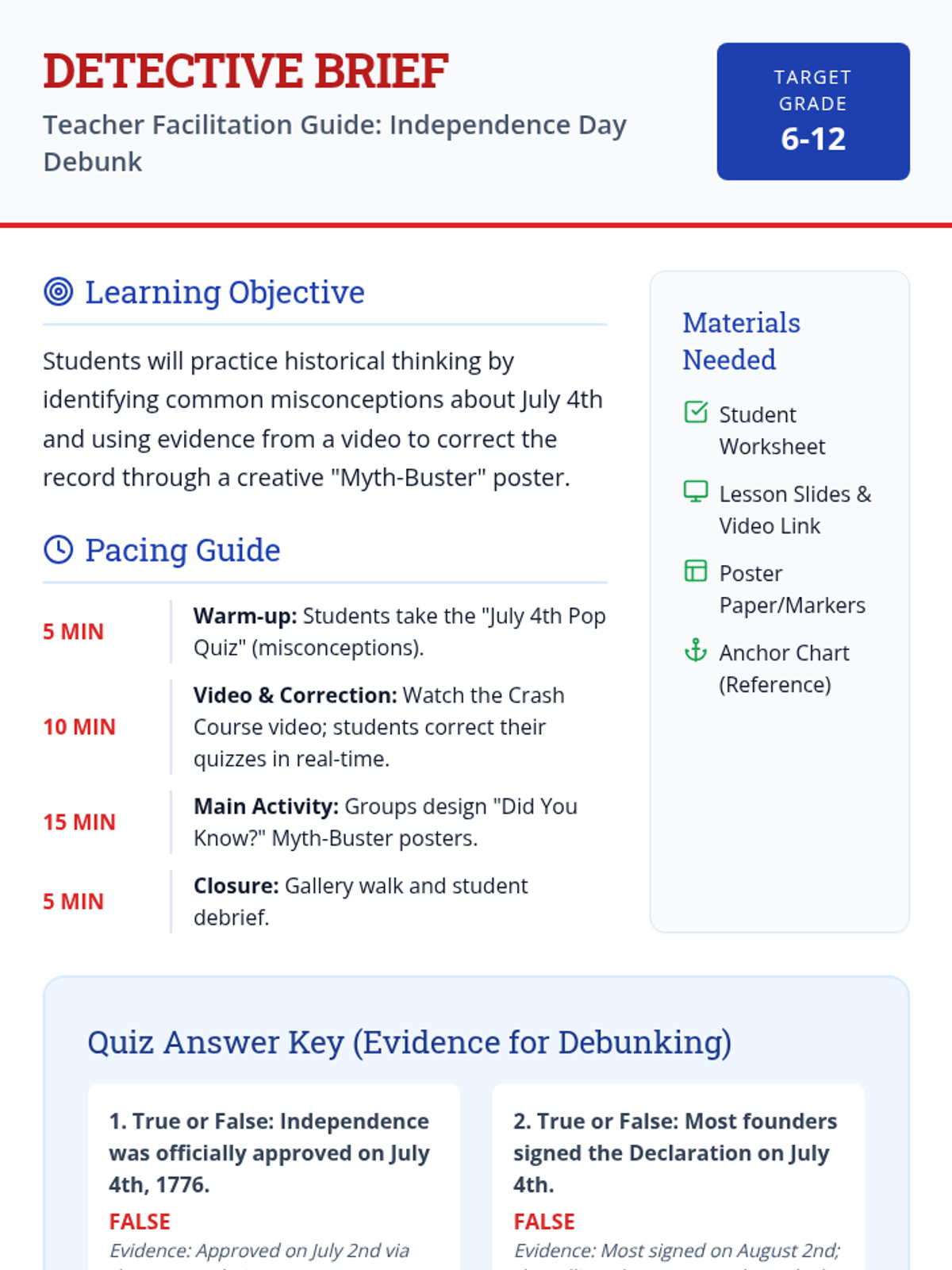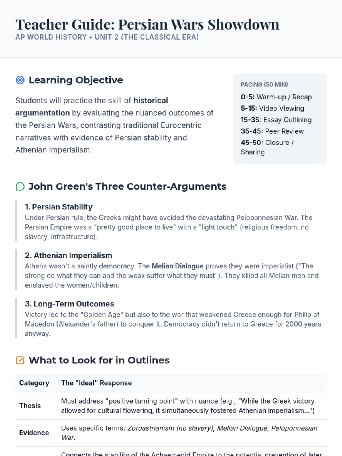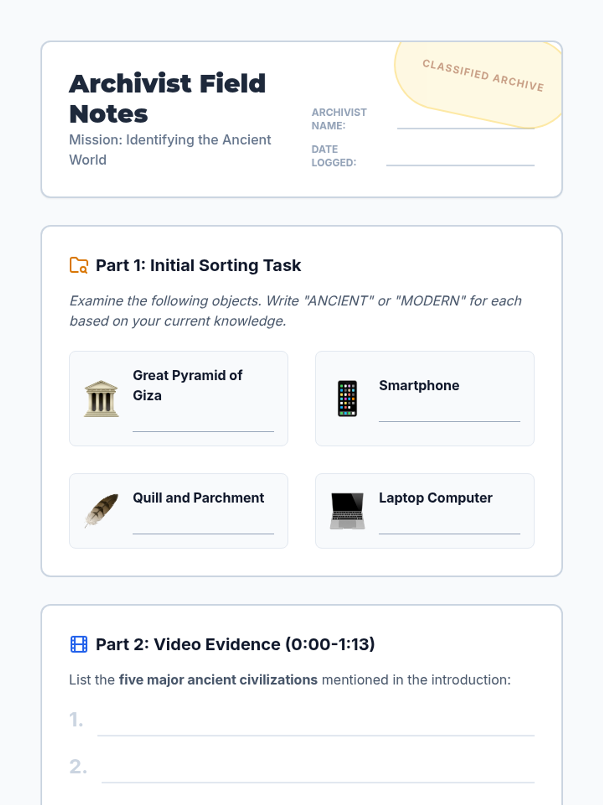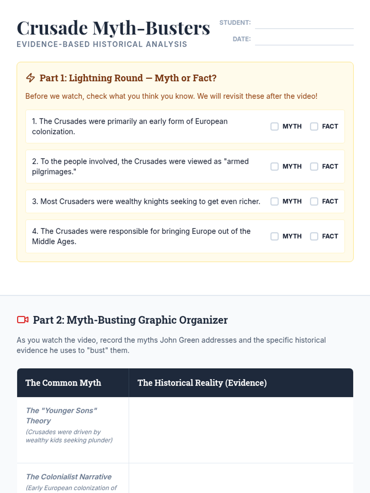 Students will practice historical thinking by identifying and debunking common misconceptions about Ancient Egypt using evidence from John Green's Crash Course World History. The lesson culminates in a creative 'Fact-Check Campaign' where students design posters to correct historical myths.
