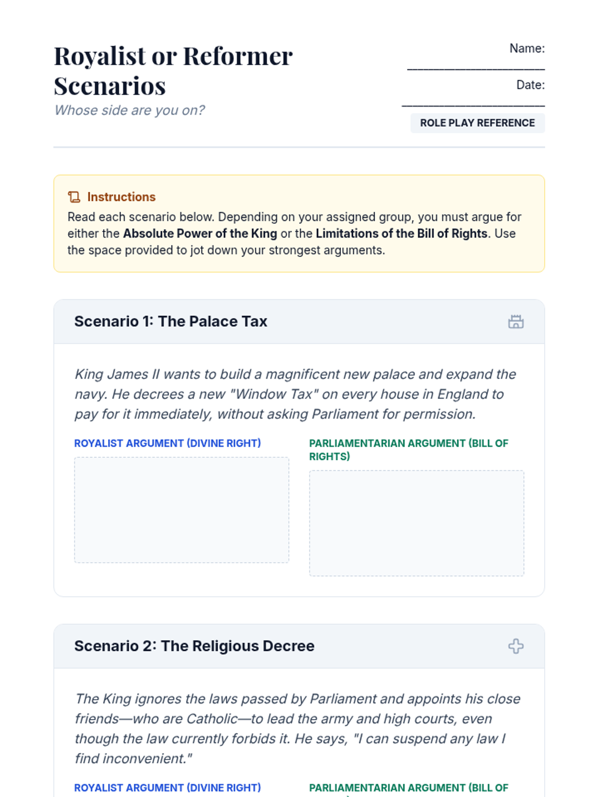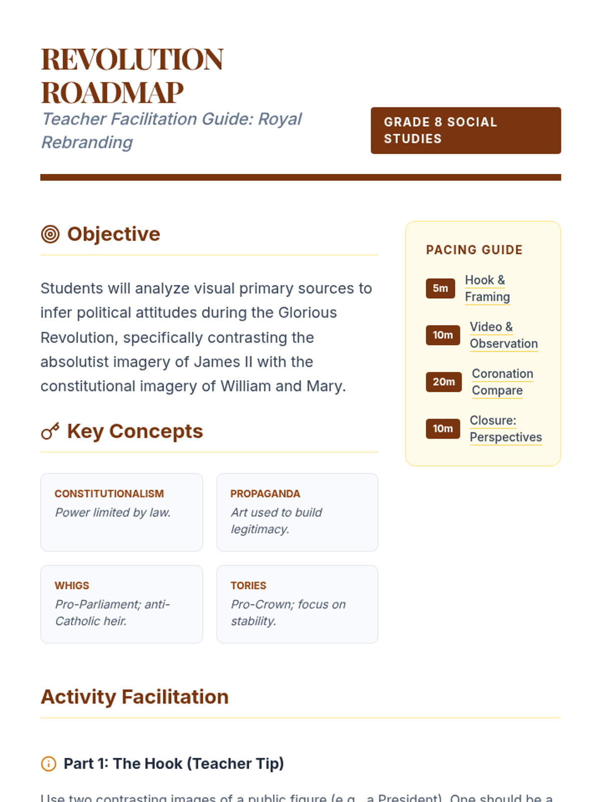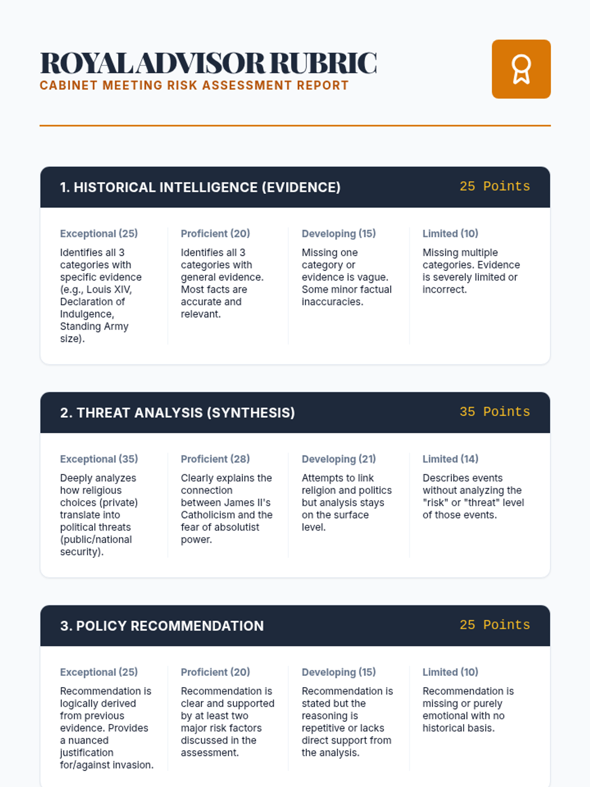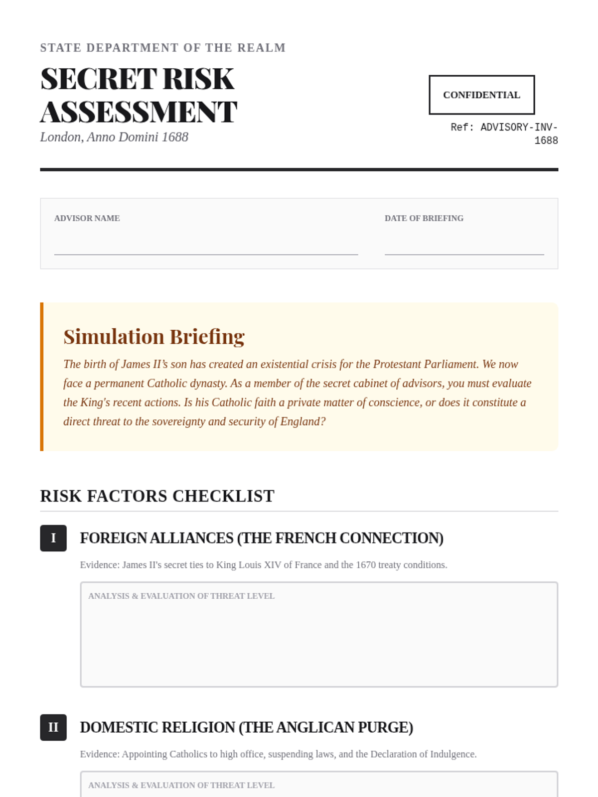 Students investigate the intersection of religion and politics during the Glorious Revolution. They analyze the reign of James II through a risk-assessment simulation, deciding whether his Catholic faith constituted a personal choice or a threat to English national security.