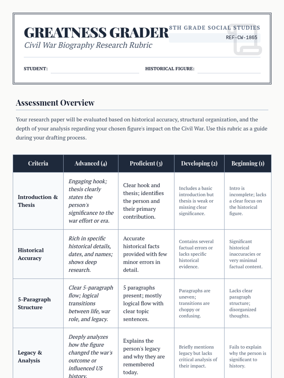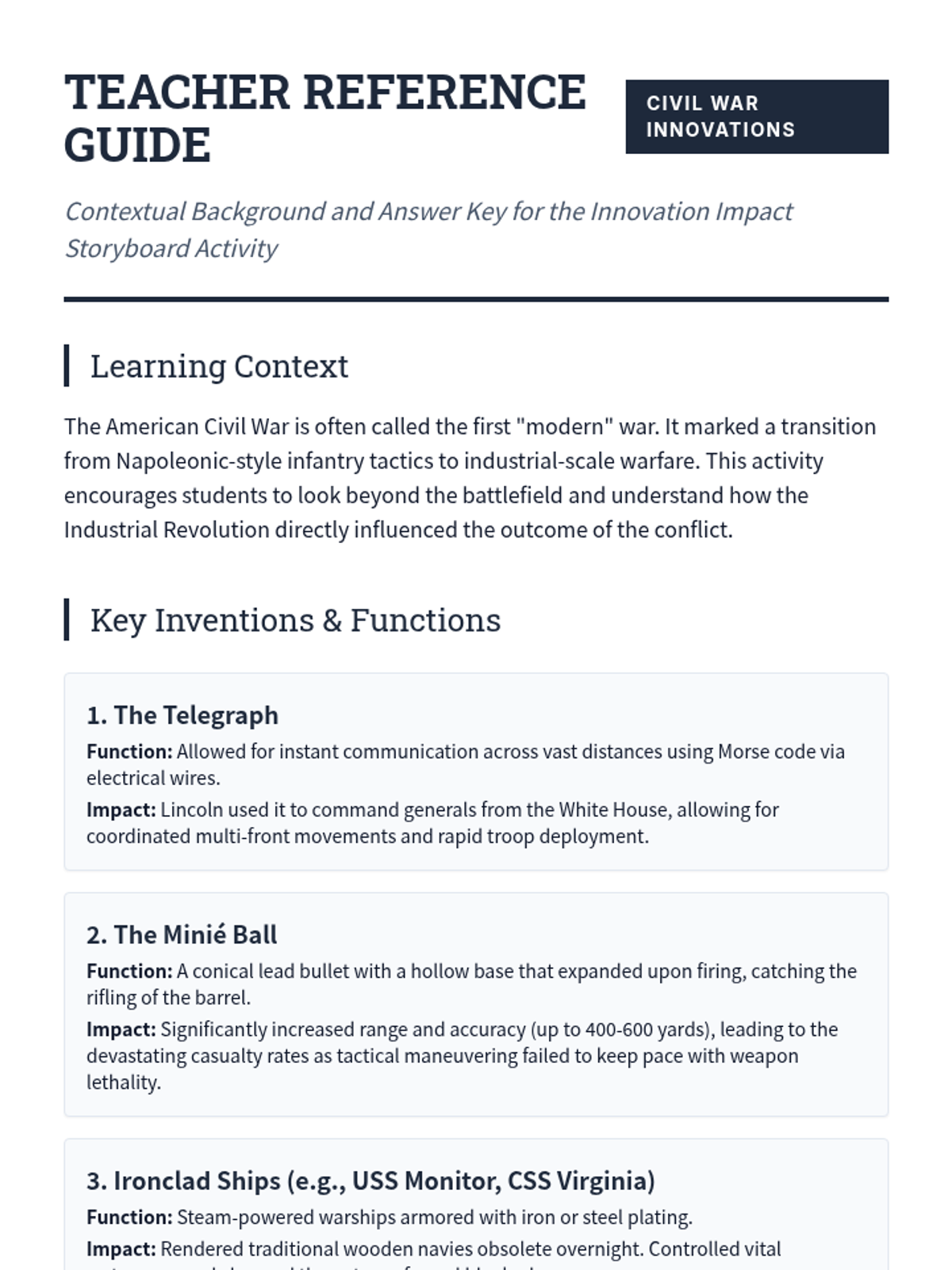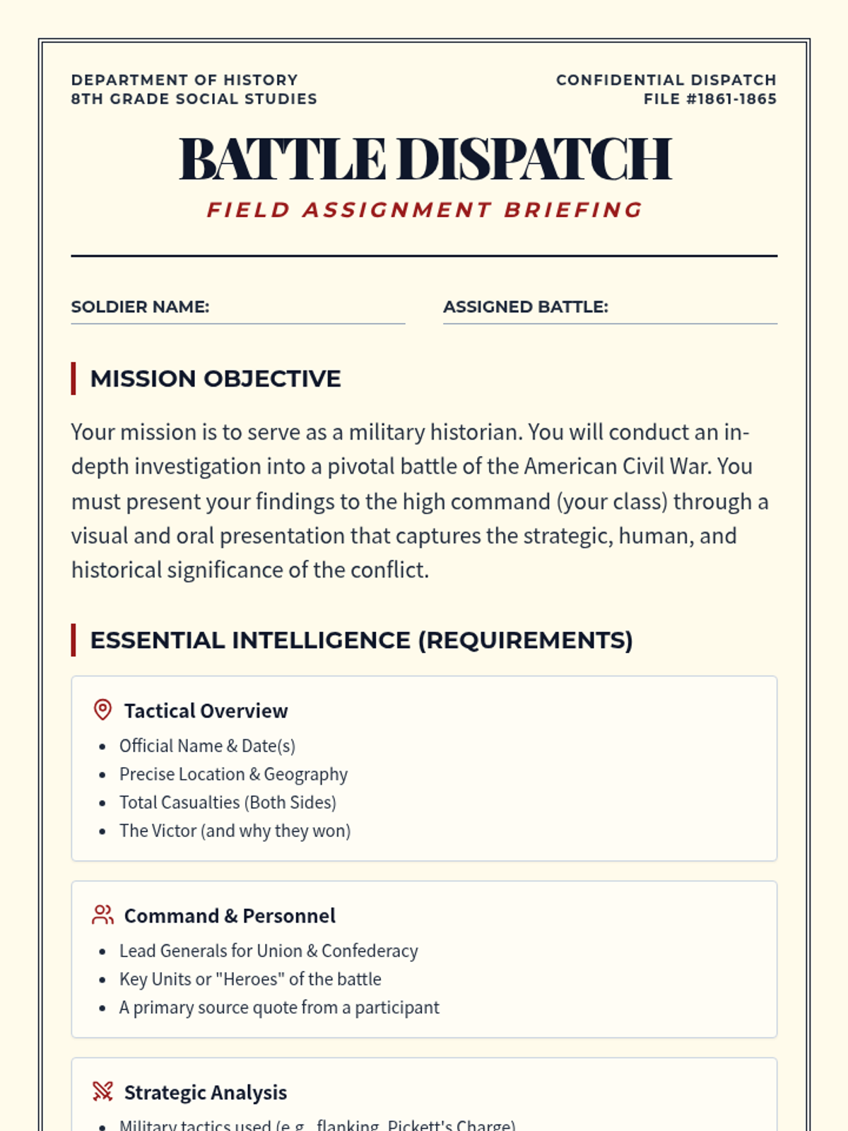 US Civil WarExamines secession origins, major military campaigns, and political leadership of the Union and Confederacy. Addresses the impact of the Emancipation Proclamation and early Reconstruction efforts.