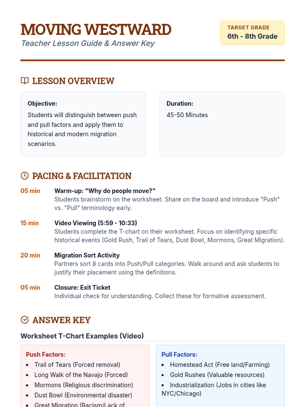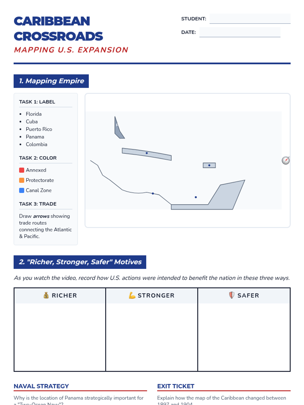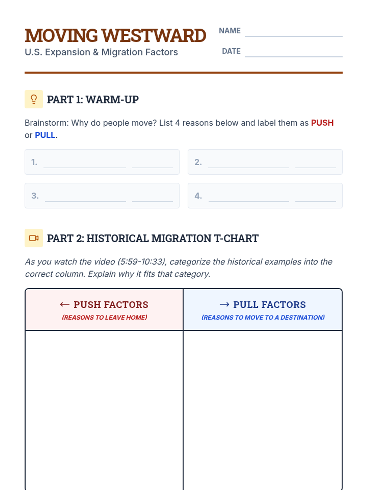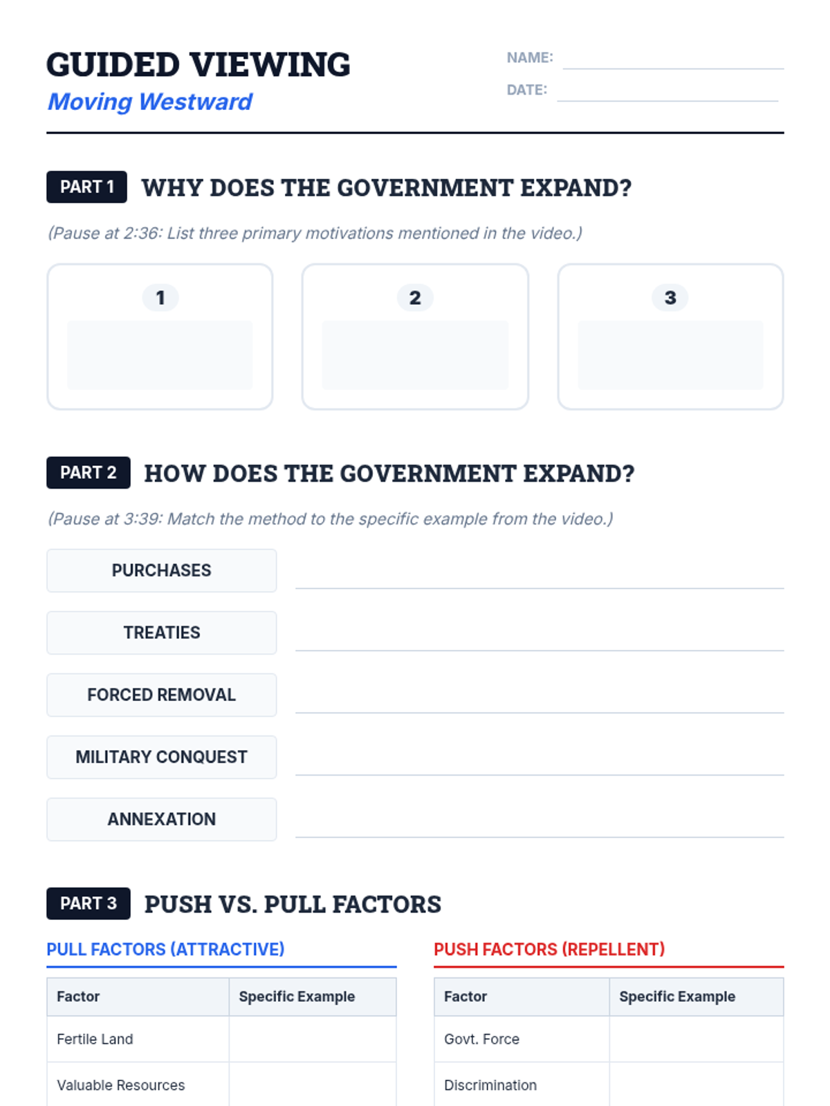 A comprehensive lesson on U.S. territorial expansion from 1783 to 1853, covering the methods of acquisition (purchase, war, treaty) and the human impact of migration. Includes a video-guided mapping activity and a timeline construction challenge.