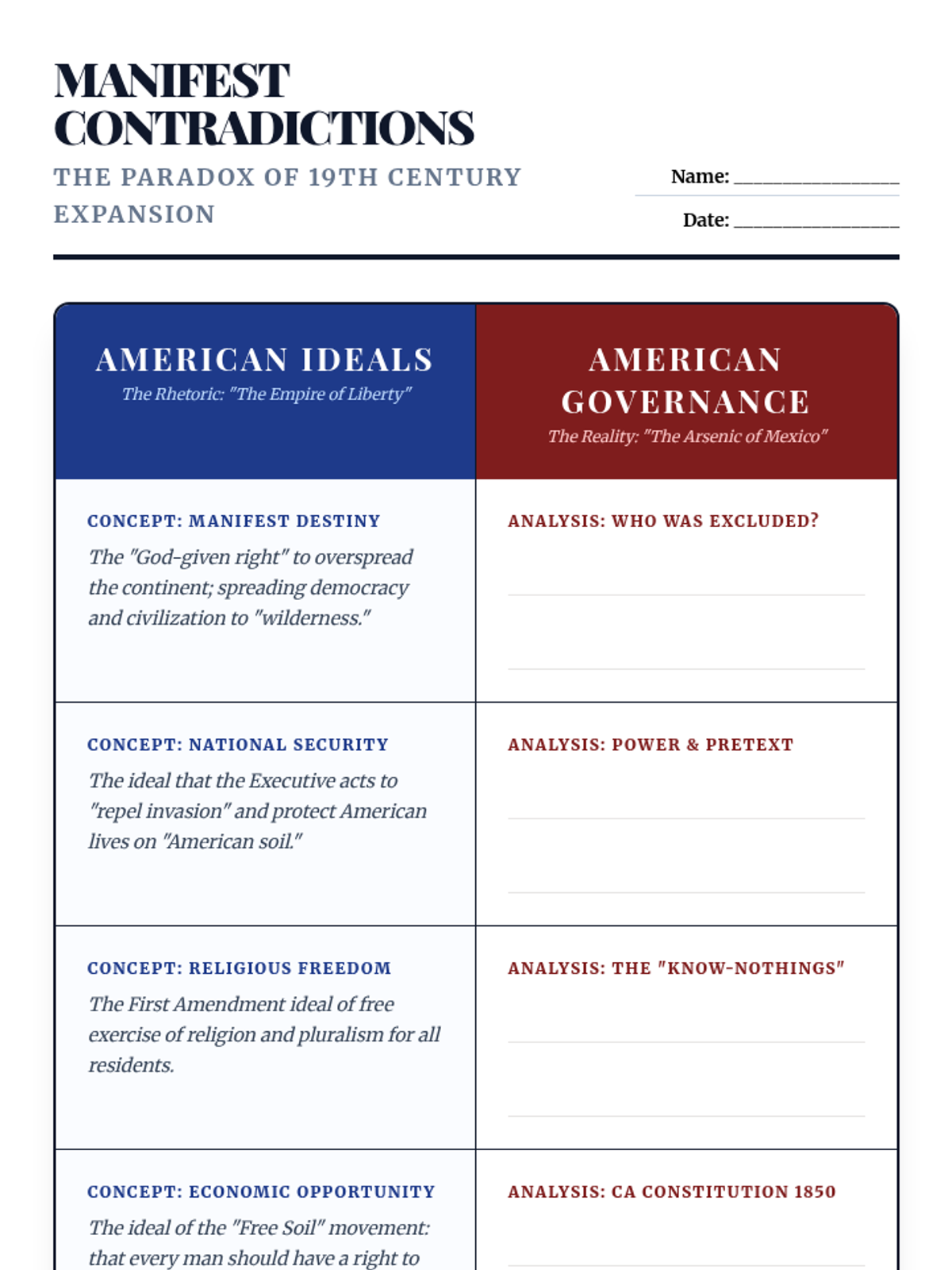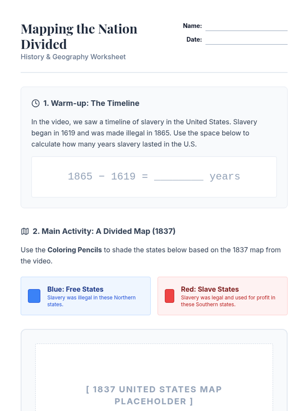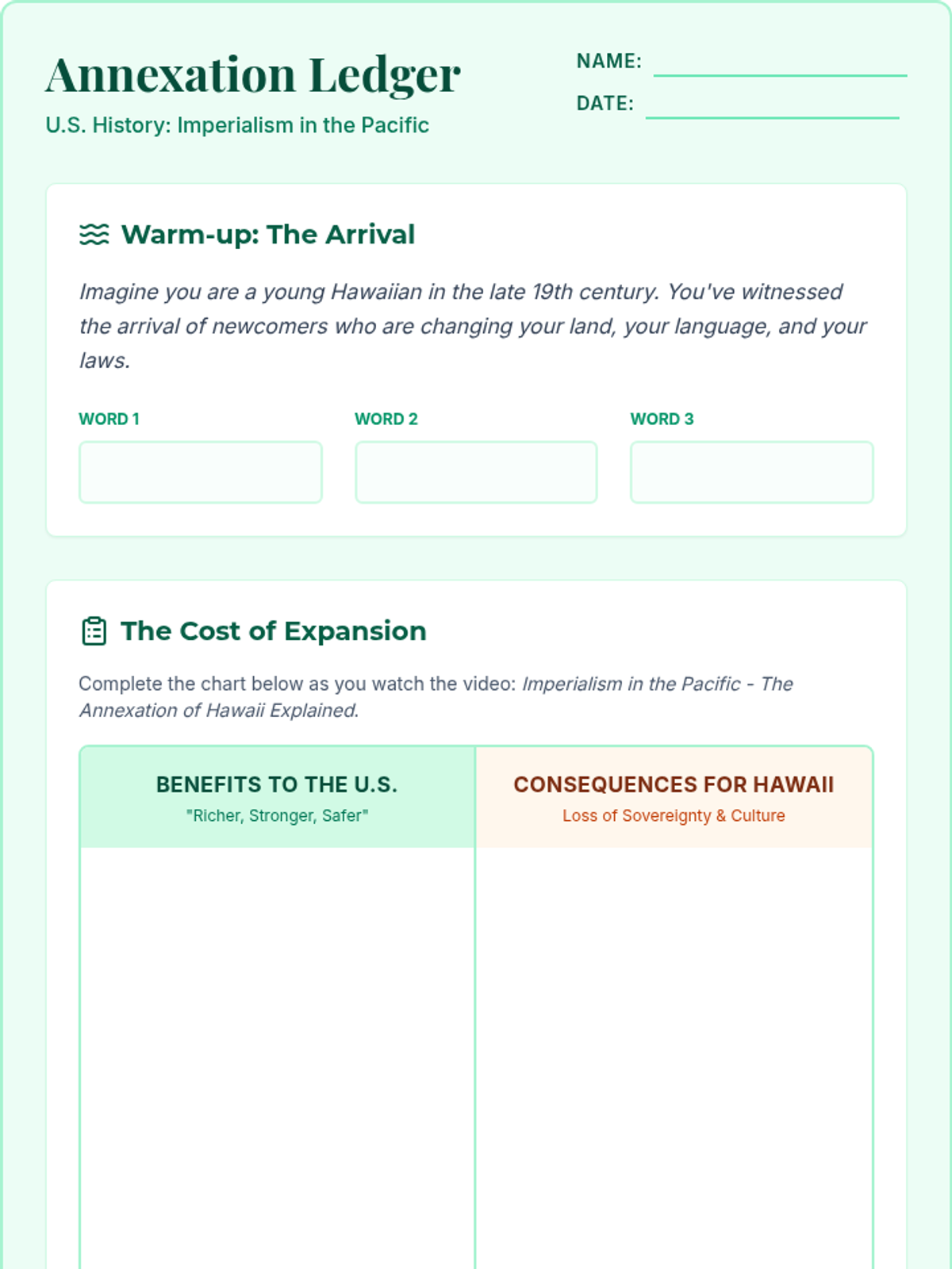 A comprehensive lesson on U.S. territorial expansion from 1783 to 1853, covering the methods of acquisition (purchase, war, treaty) and the human impact of migration. Includes a video-guided mapping activity and a timeline construction challenge.