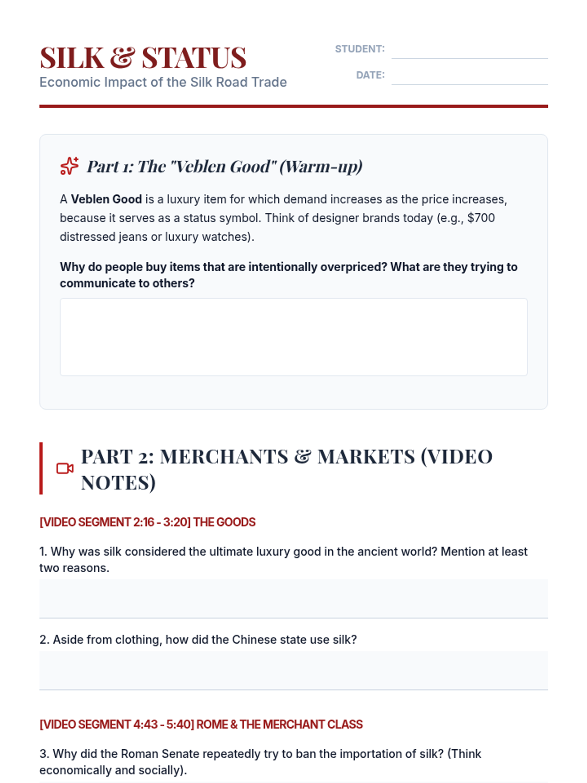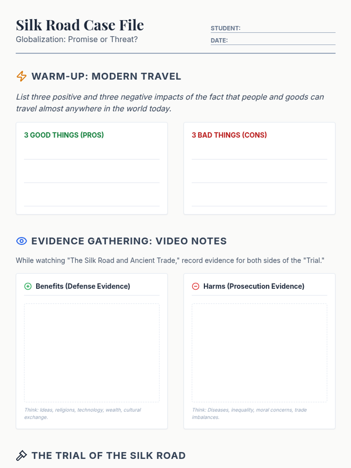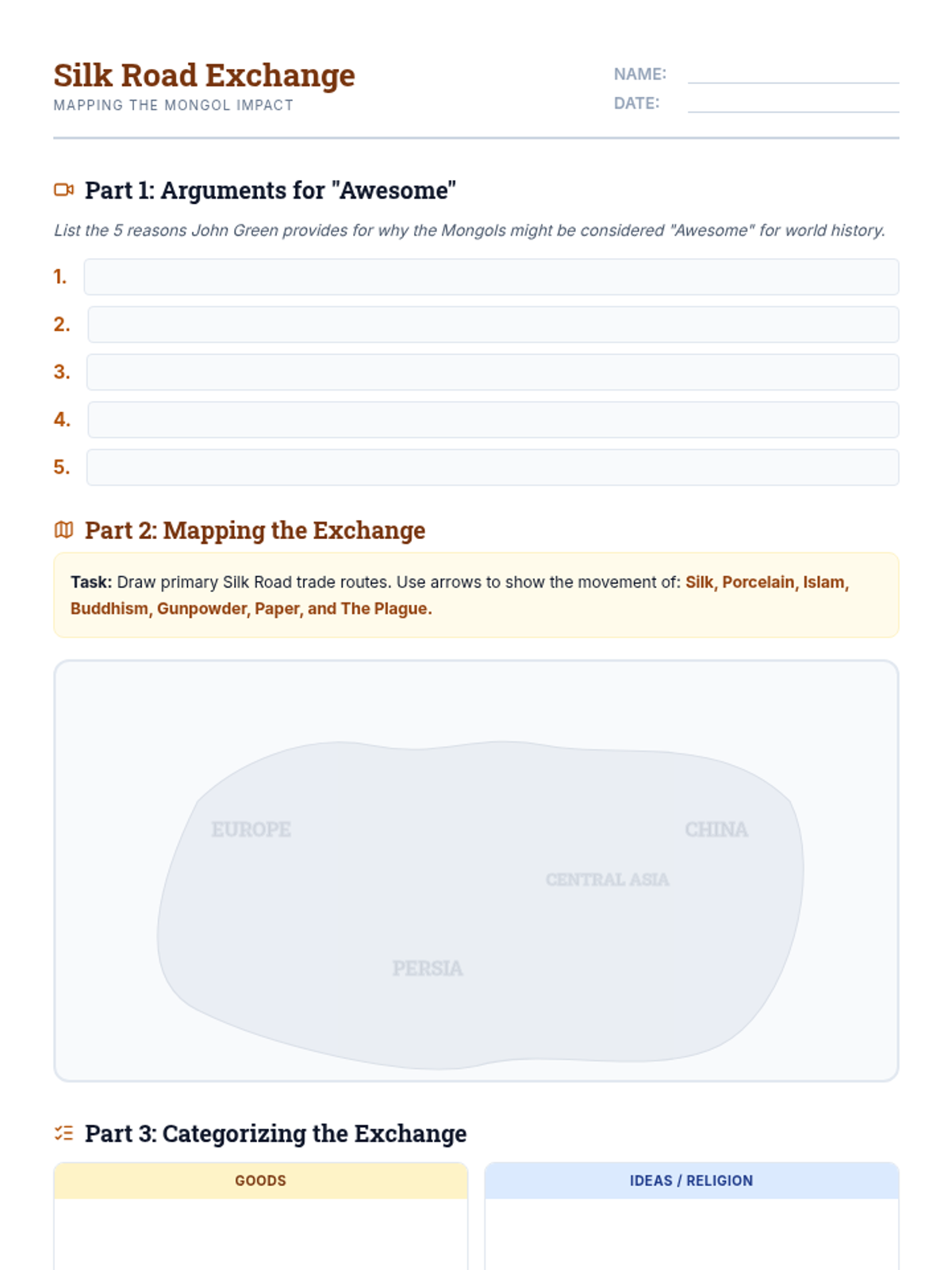 The Silk RoadAncient transcontinental trade networks linking East Asia with the Mediterranean. Examines the exchange of silk, spices, and cultural ideologies between diverse civilizations.