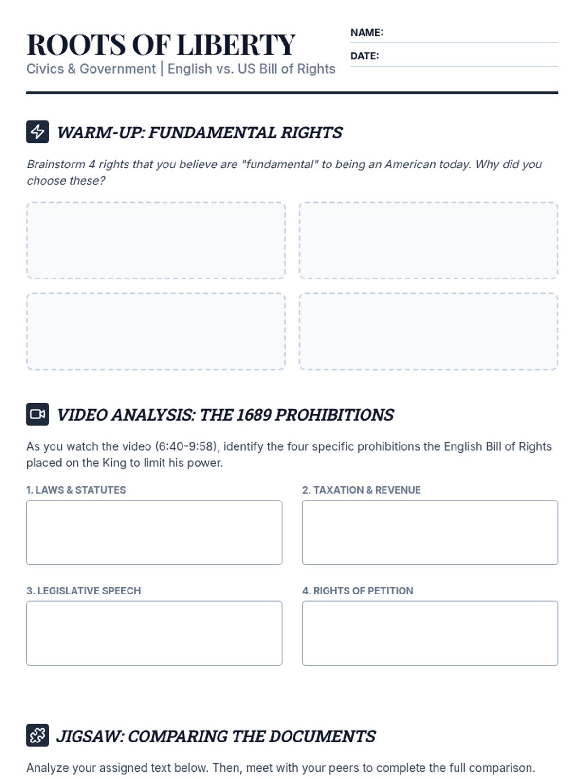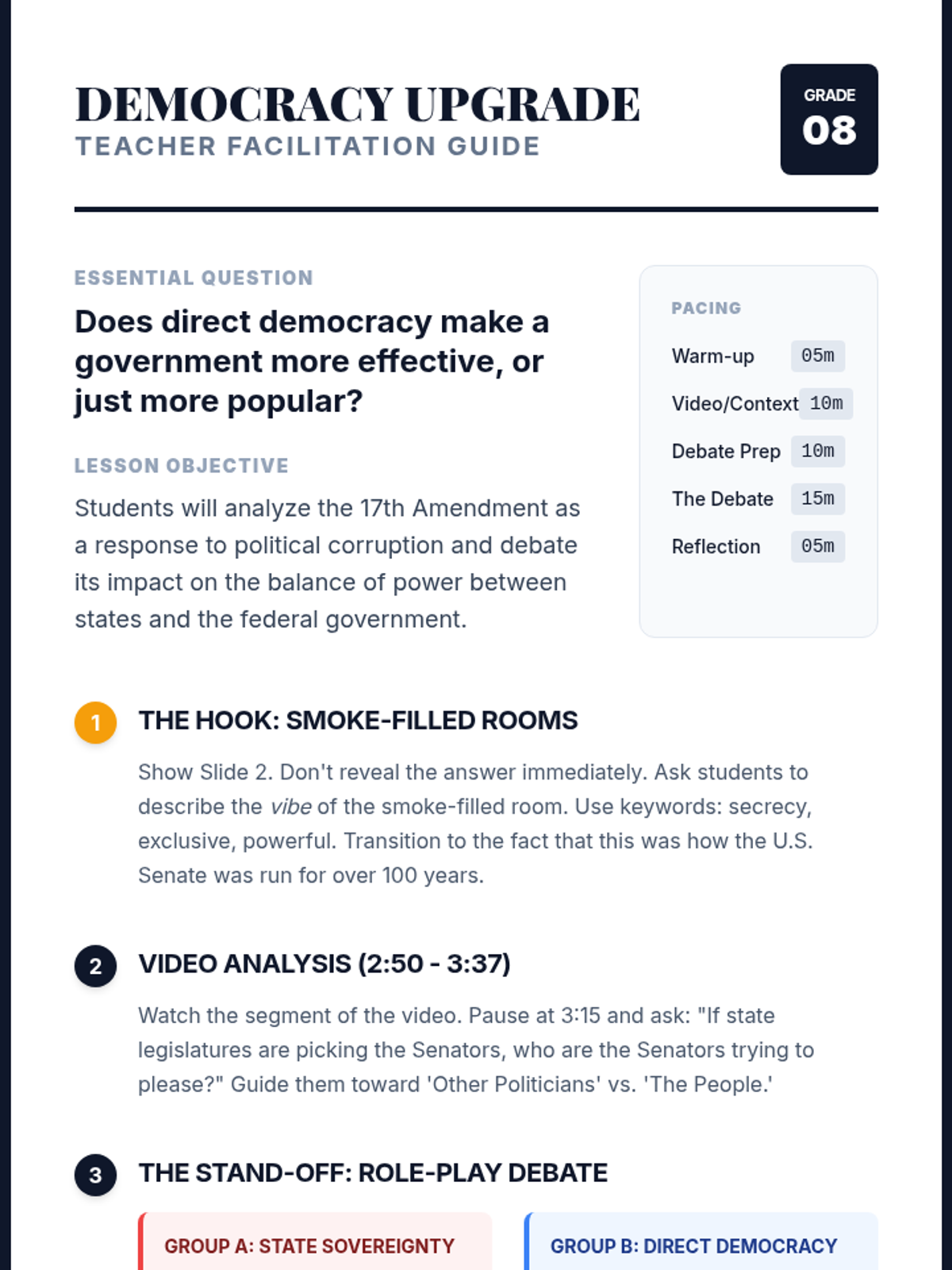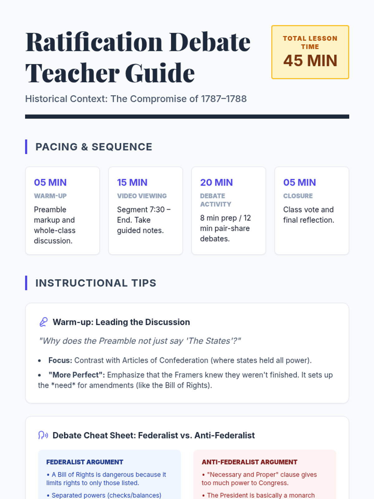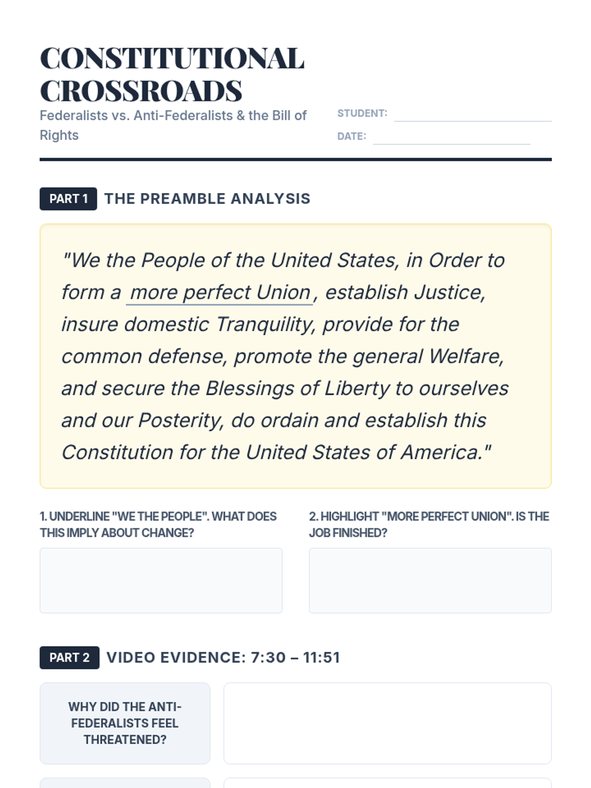 Students will analyze the conflict between Federalists and Anti-Federalists, focusing on the debate over the Bill of Rights and the role of compromise in the ratification process. This lesson uses a high-quality video to explore the 'more perfect union' concept and culminates in a structured debate activity.
