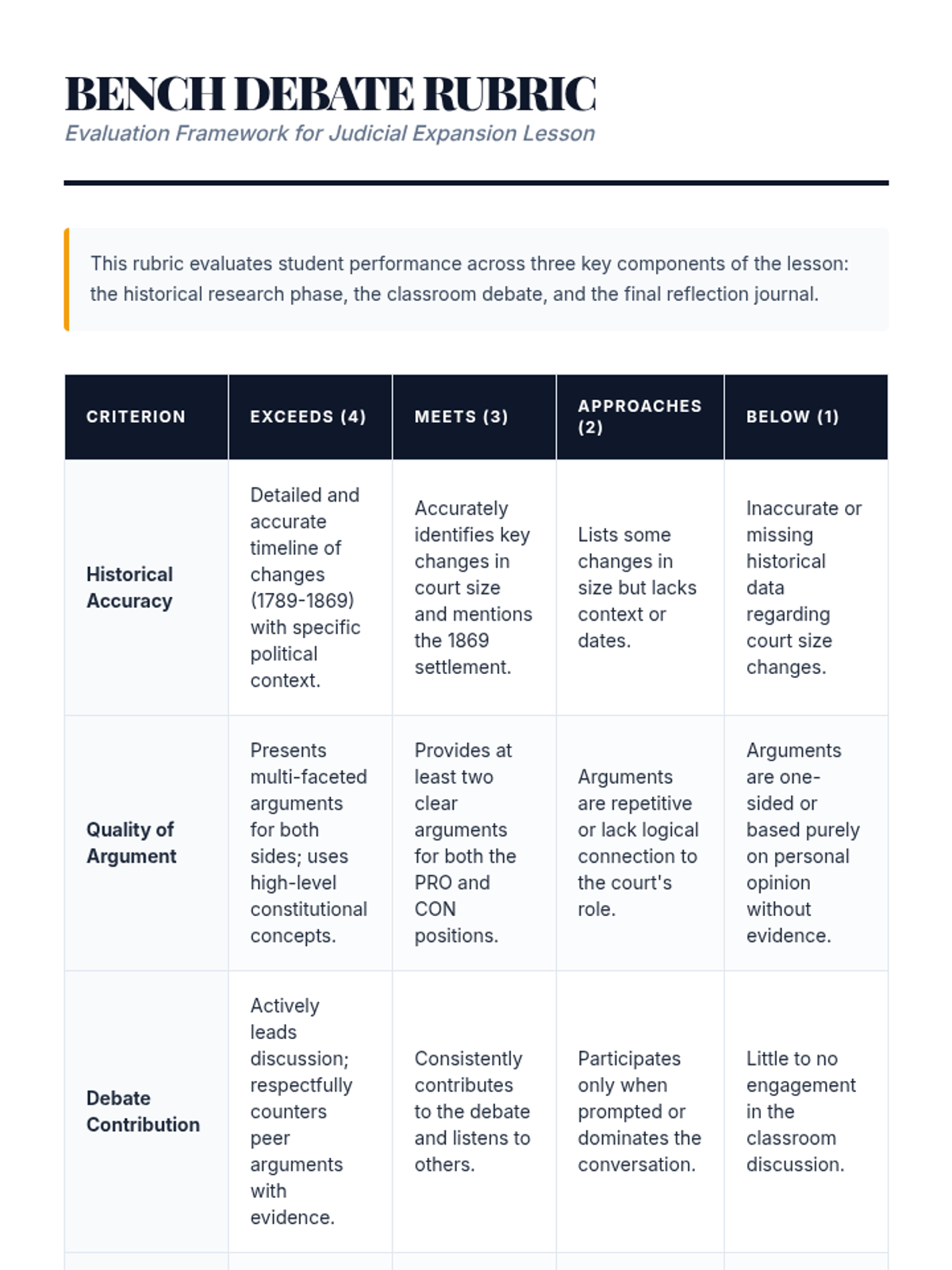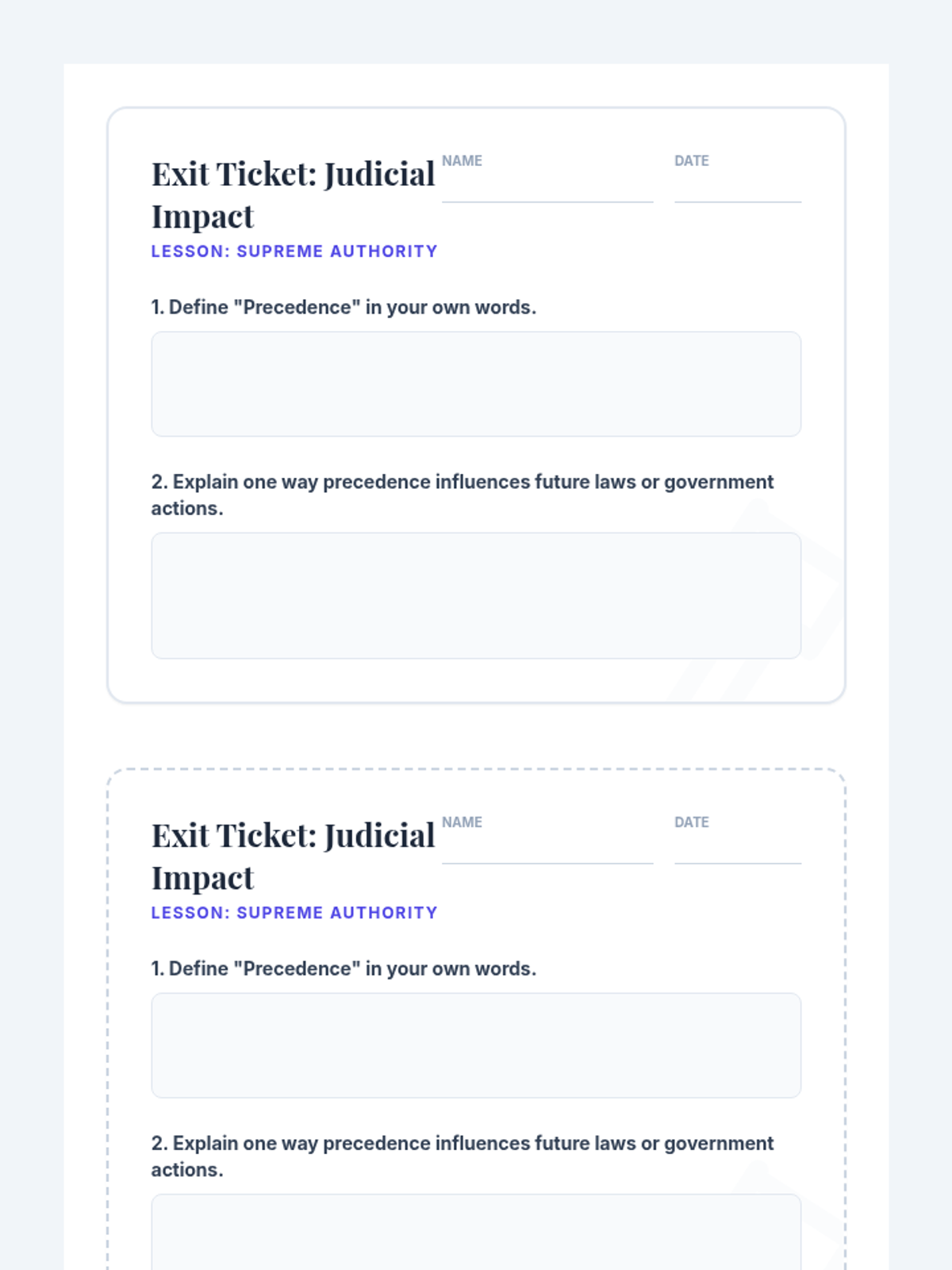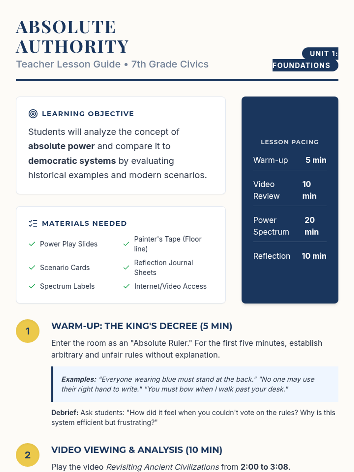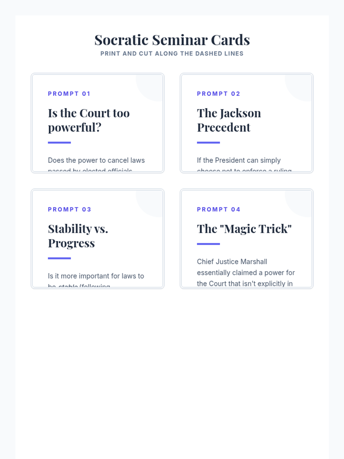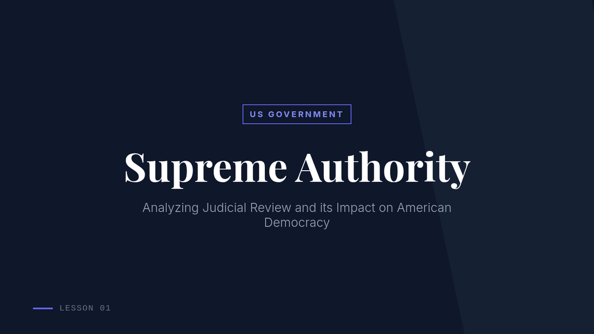 This lesson explores the power of Judicial Review, its origins in Marbury v. Madison, and the democratic tensions between unelected judges and elected representatives. Students will analyze the Supreme Court's role in checks and balances through video analysis and a Socratic Seminar.