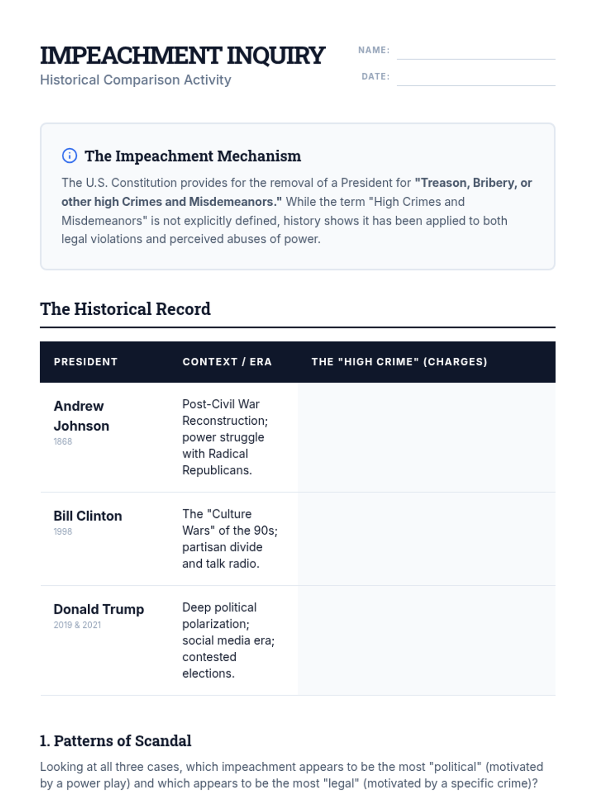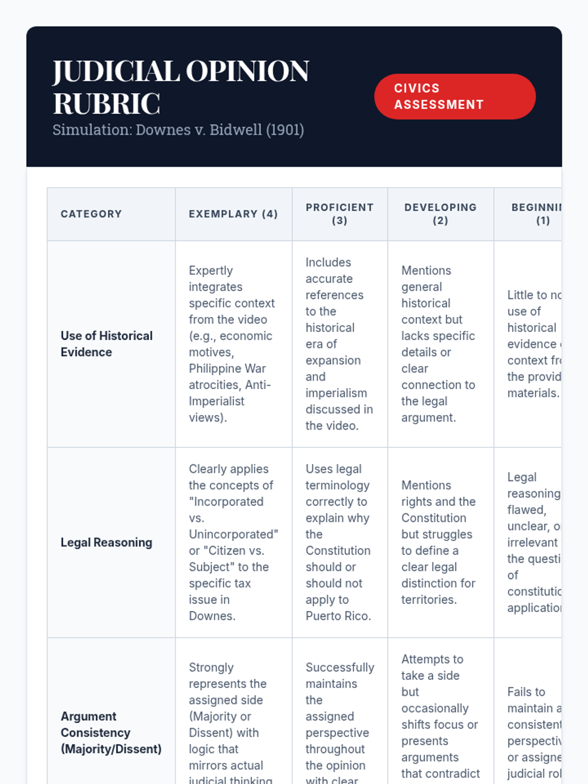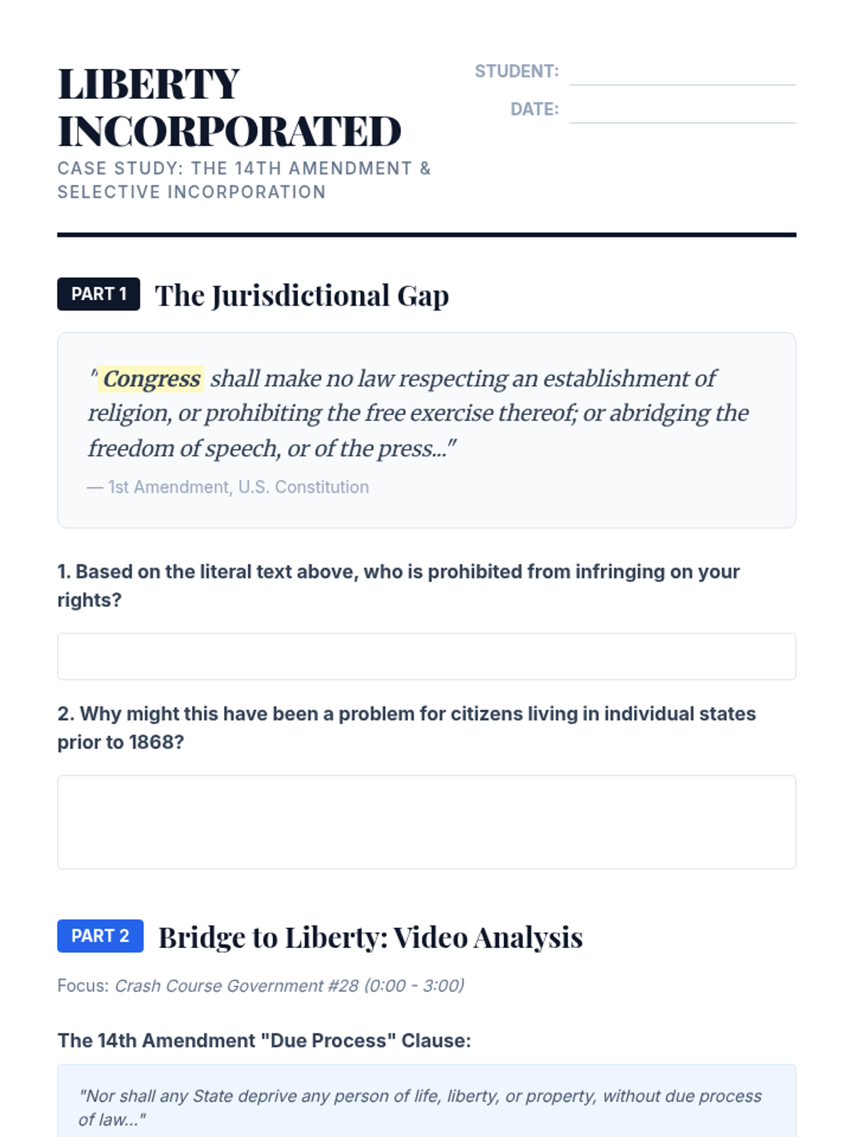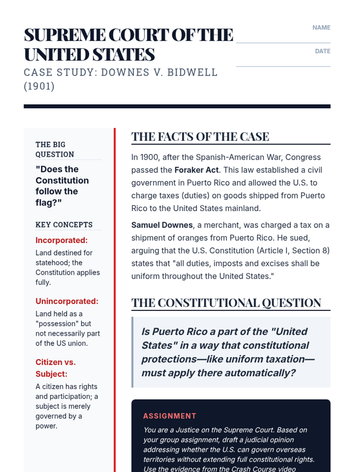 This lesson explores the power of Judicial Review, its origins in Marbury v. Madison, and the democratic tensions between unelected judges and elected representatives. Students will analyze the Supreme Court's role in checks and balances through video analysis and a Socratic Seminar.