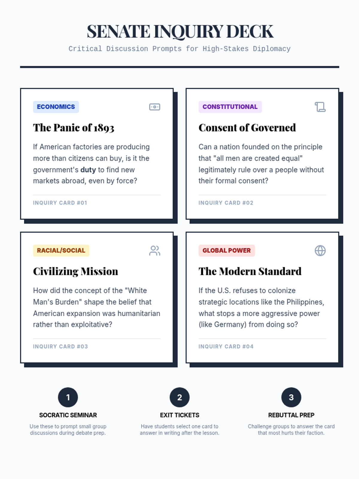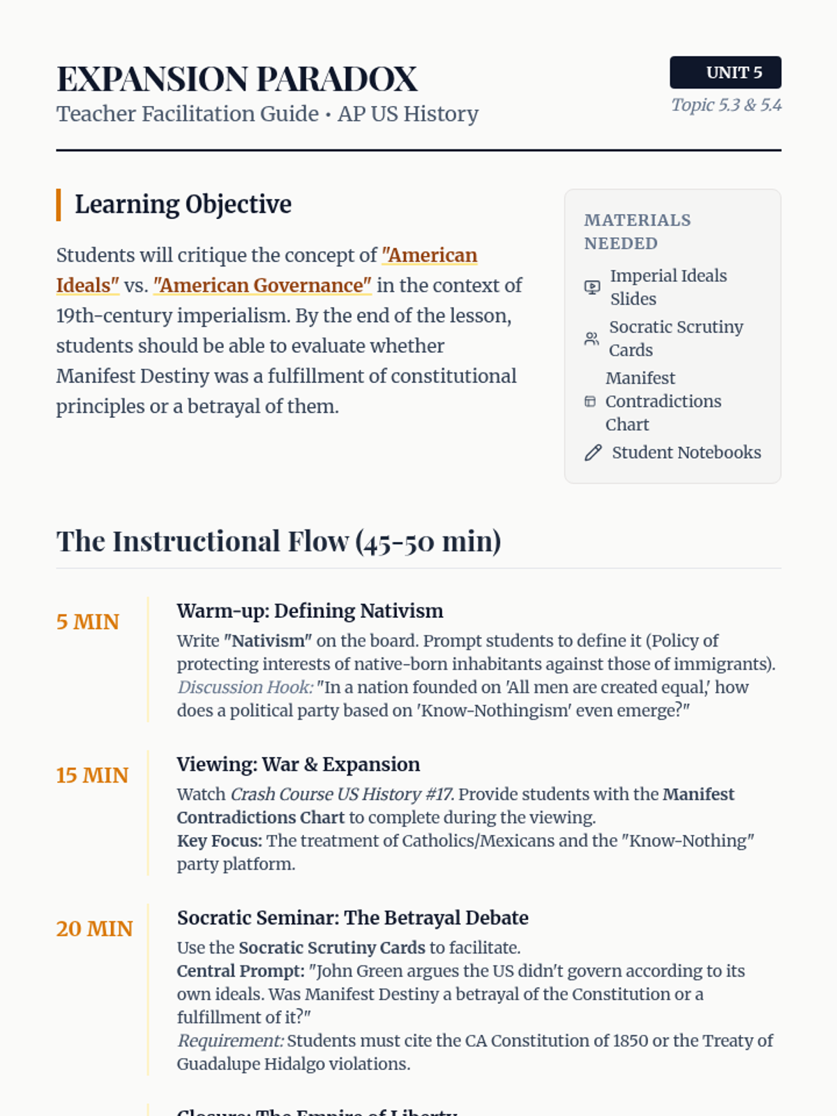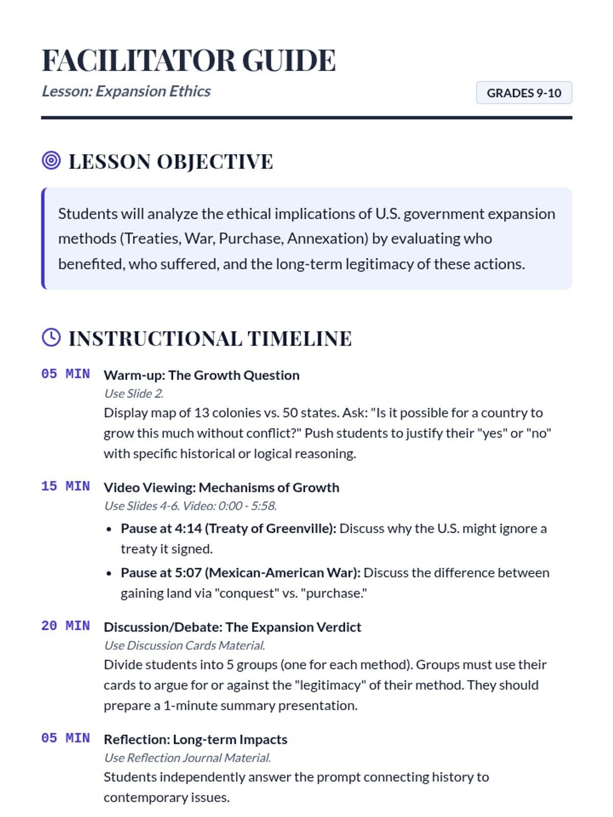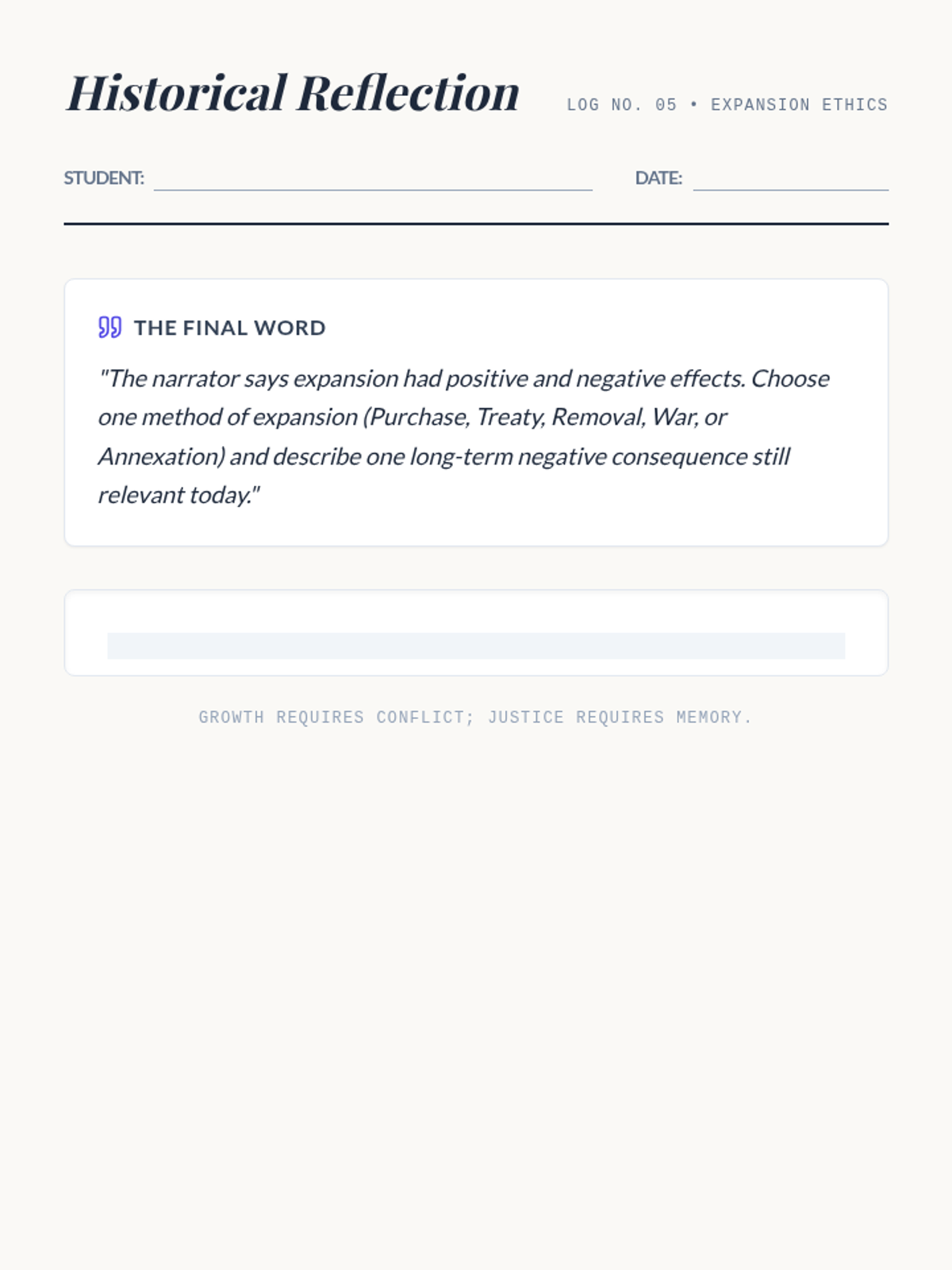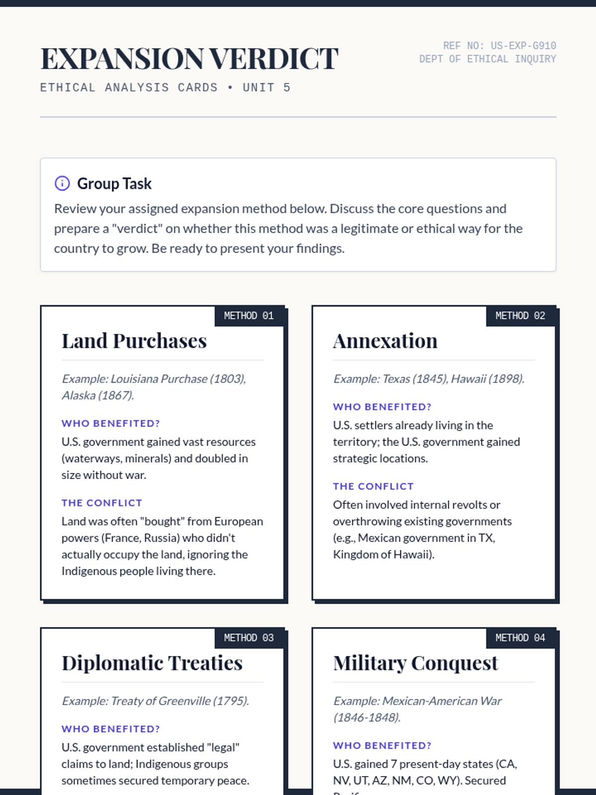 A high school history lesson exploring the ethical implications of U.S. westward expansion through the lens of treaties, war, purchases, and annexation. Students analyze government motivations and human consequences to determine the legitimacy of various expansion methods.