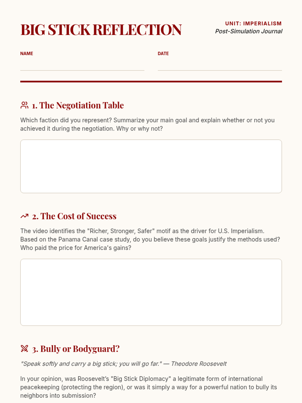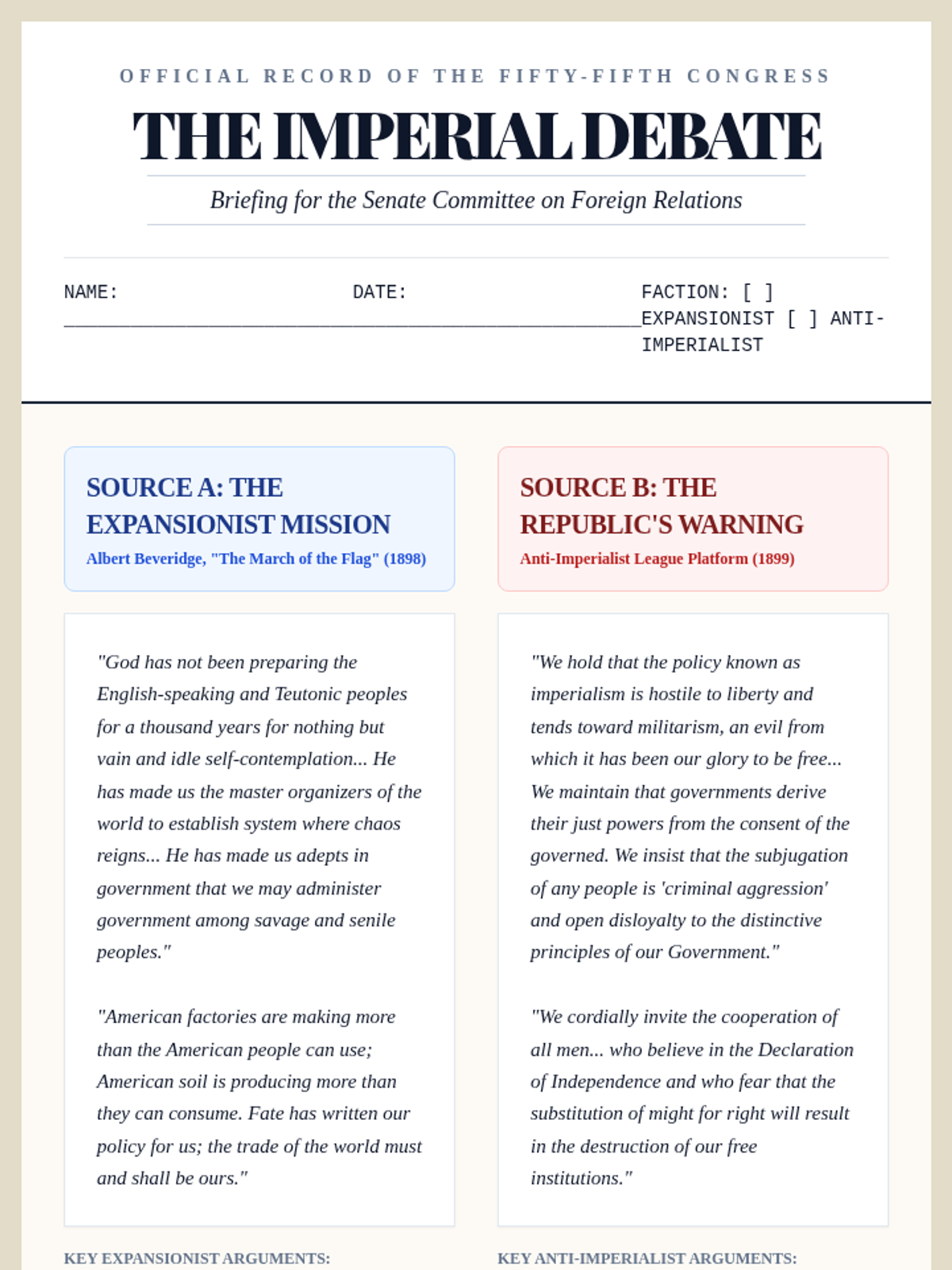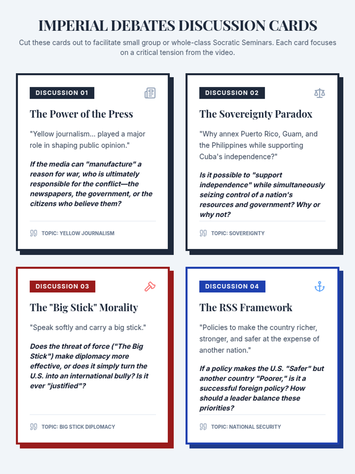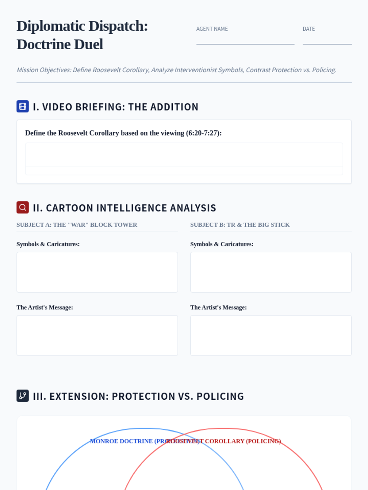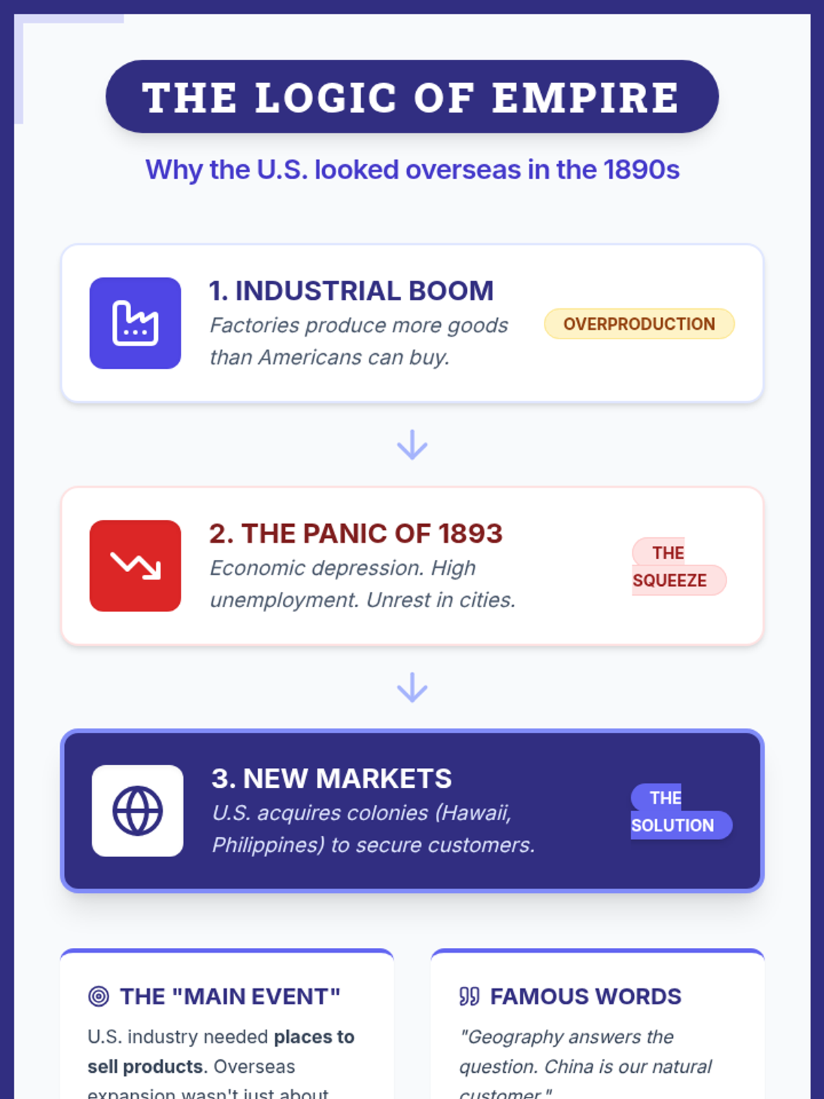 US ImperialismLate 19th-century expansionism, including the Spanish-American War, the annexation of Hawaii, and interventionist policies in Latin America and Asia. Examines the economic, strategic, and ideological motivations behind American territorial acquisition.