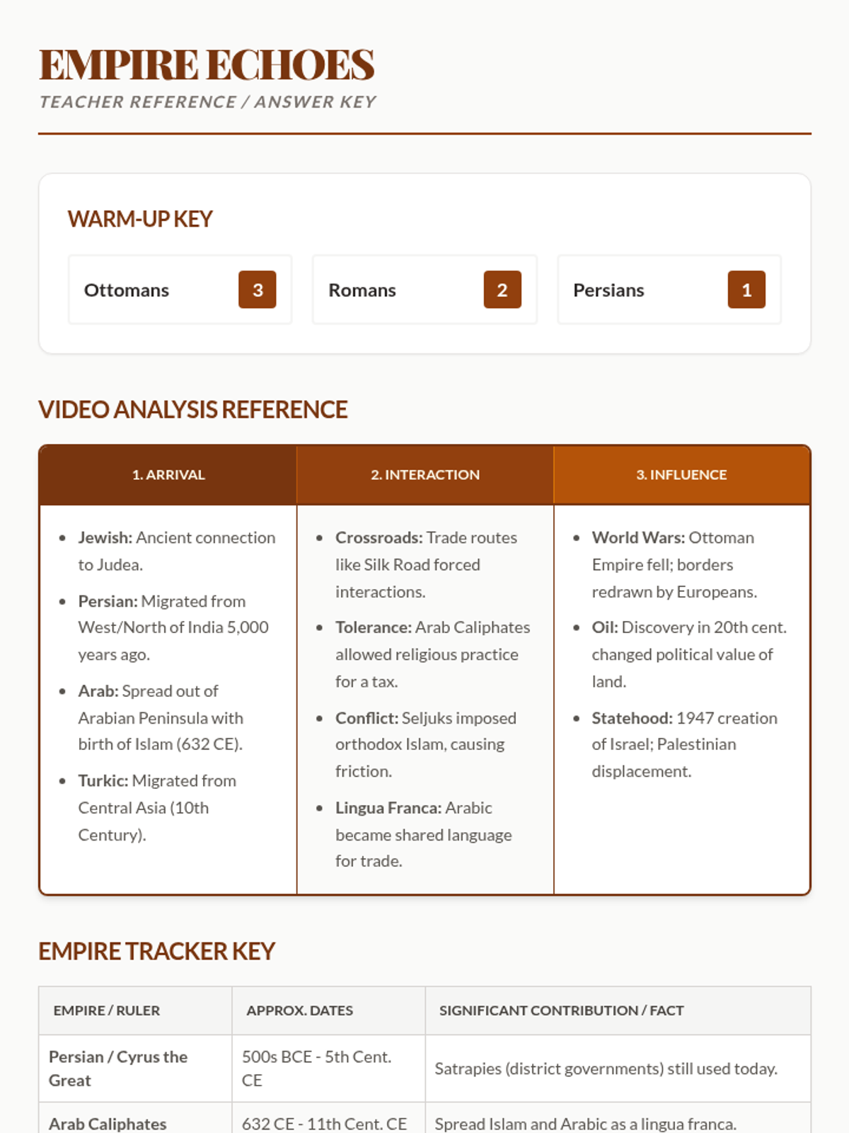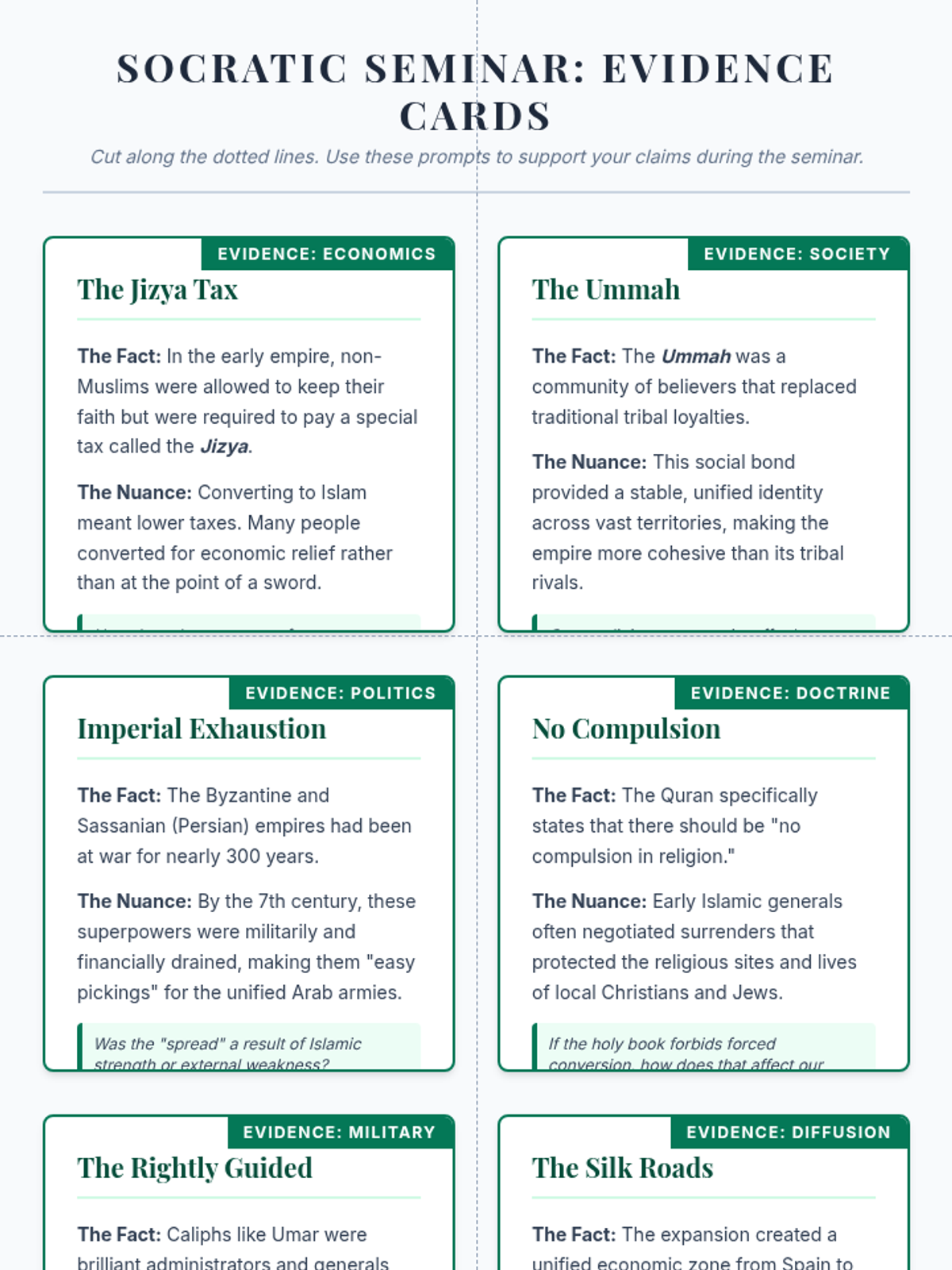 Islamic EmpiresExpansion and administration of the Umayyad, Abbasid, and Ottoman caliphates. Examines the Islamic Golden Age's contributions to science, philosophy, and global trade networks.