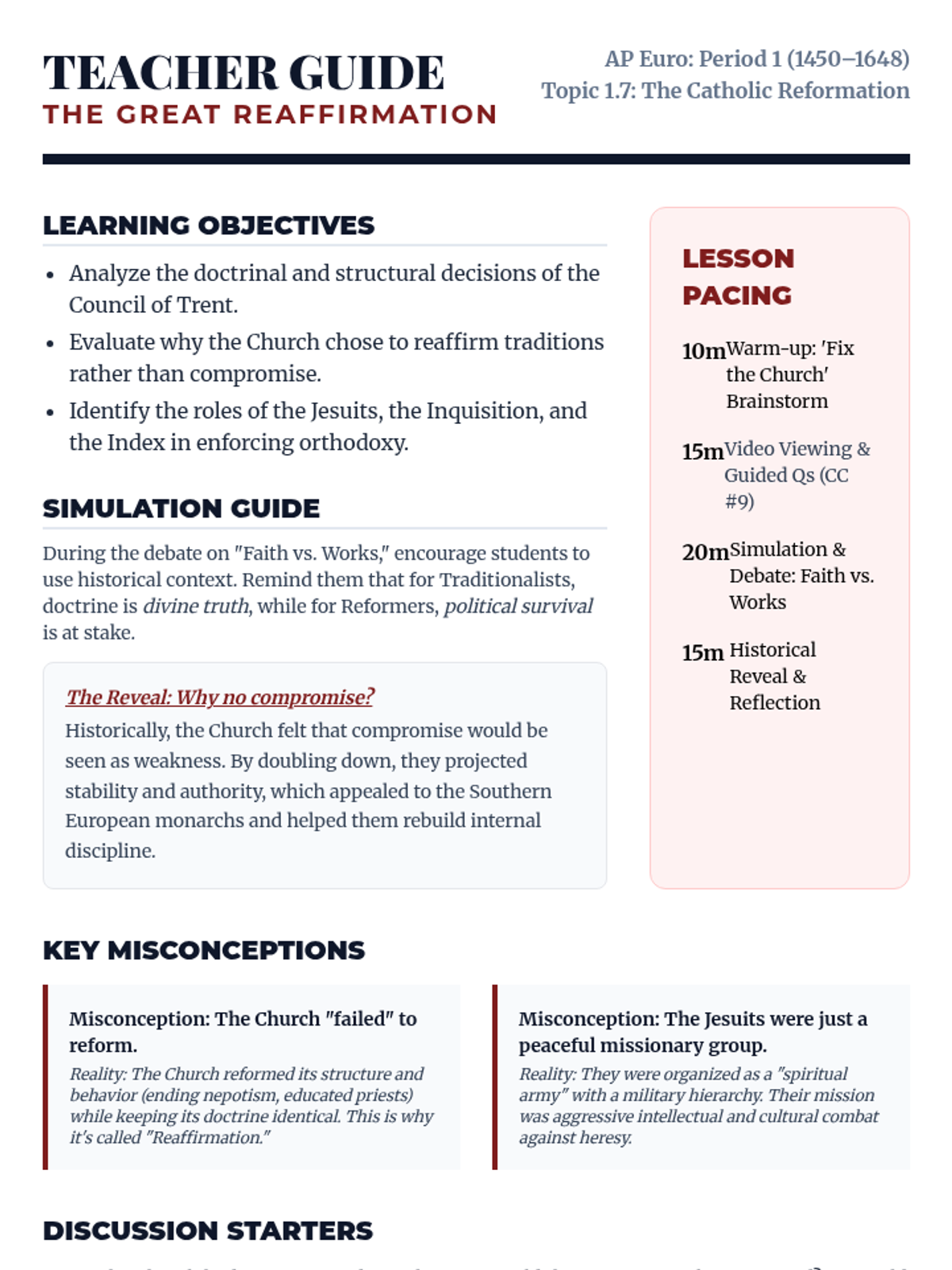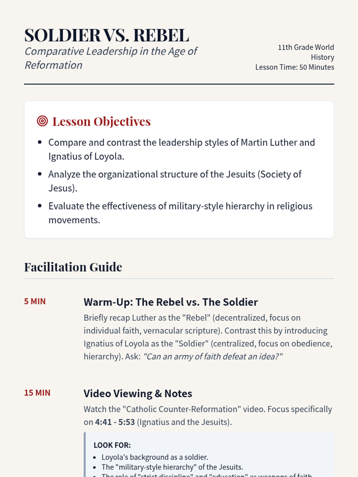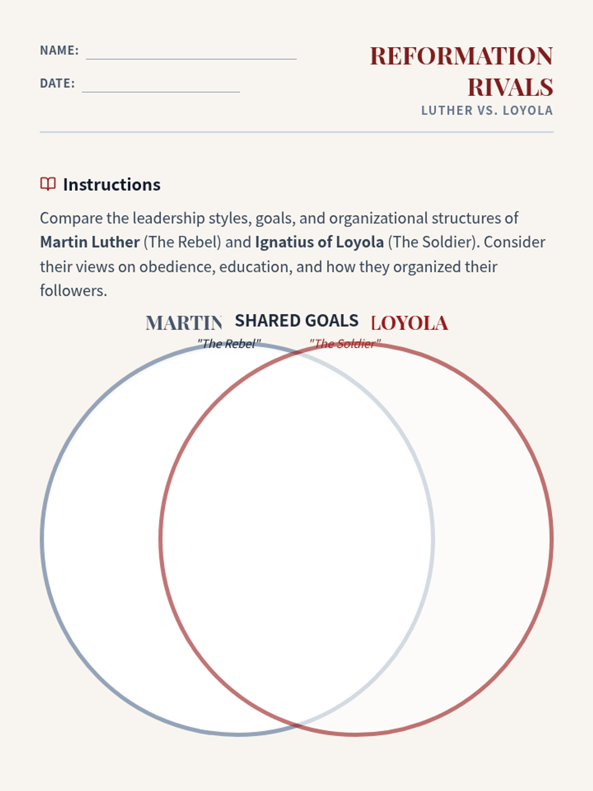 A comparative study of the Protestant Reformation and the Catholic Counter-Reformation through the lens of two pivotal leaders: Martin Luther and Ignatius of Loyola. Students analyze leadership styles, organizational strategies, and the global impact of the Society of Jesus.