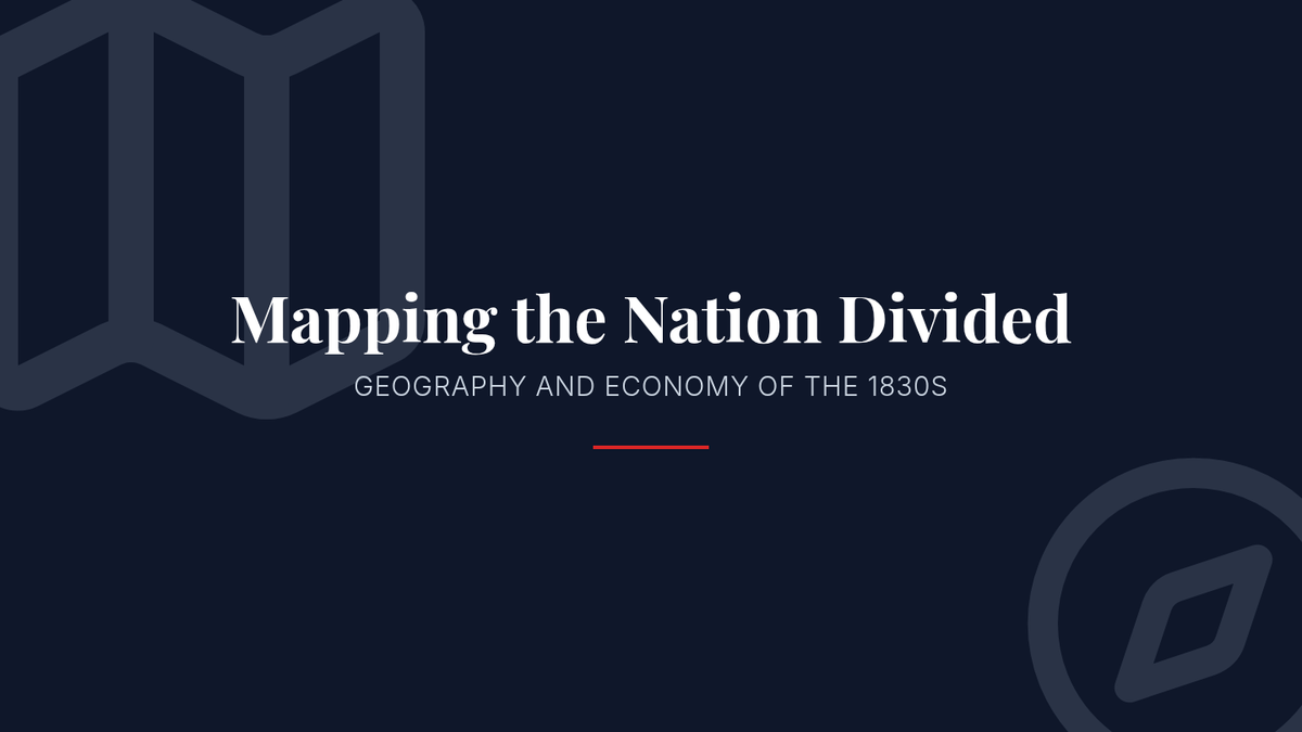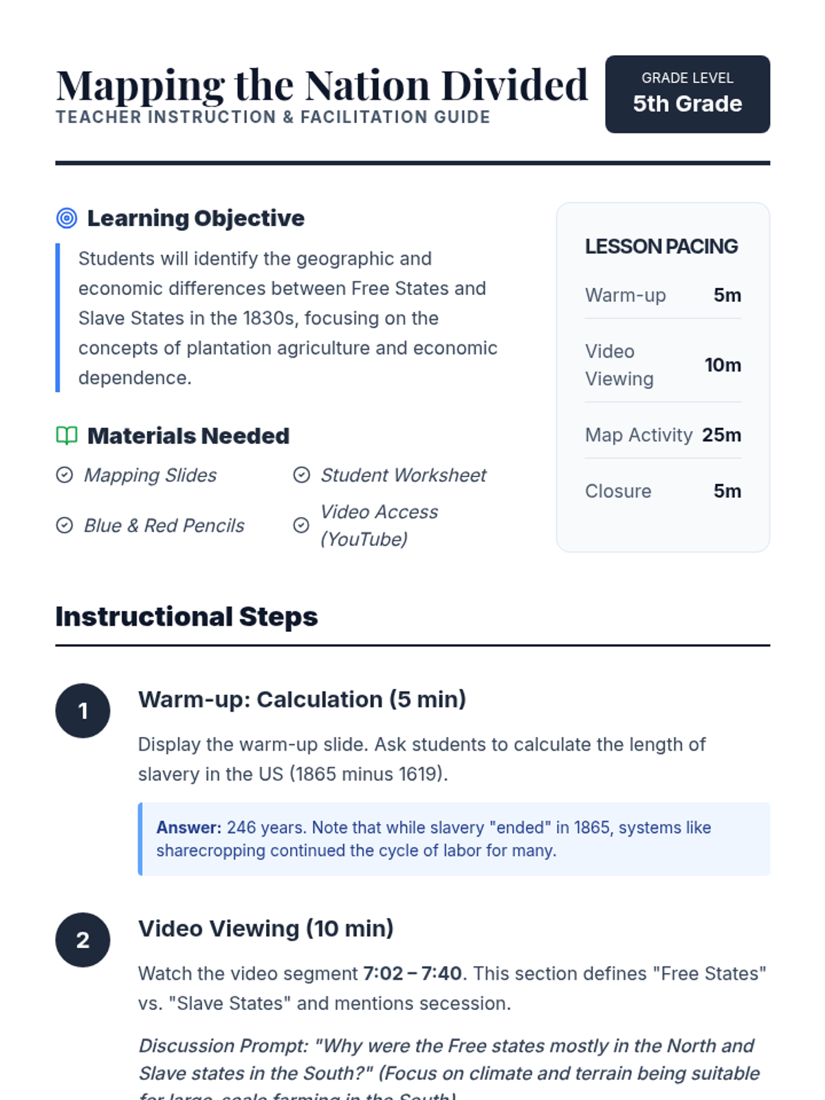 A 5th-grade history lesson focused on the geographic and economic divisions of the United States in the 1830s, specifically examining the differences between Free and Slave states and the Southern dependence on plantation agriculture.