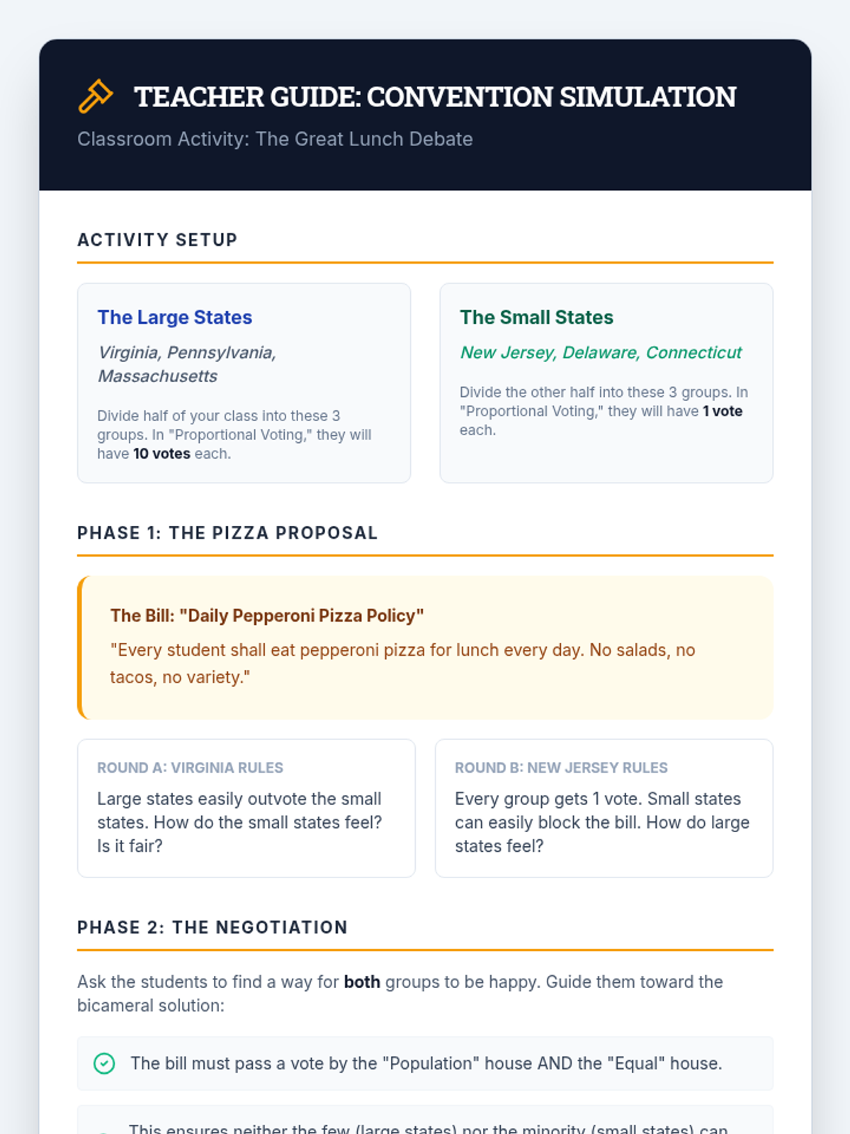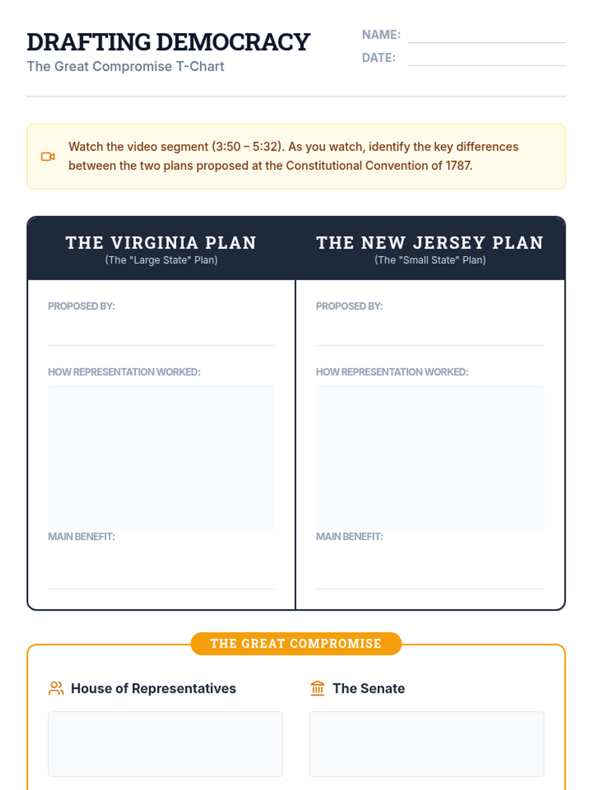 Students will explore the conflict between large and small states during the 1787 Constitutional Convention, analyzing the Virginia and New Jersey Plans and the resulting Great Compromise.
