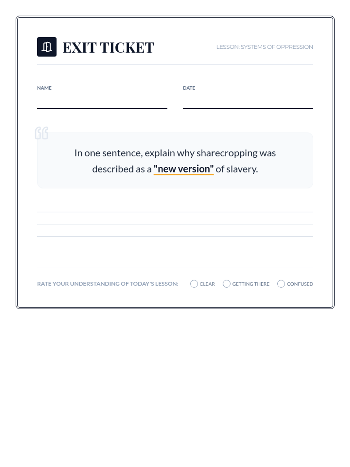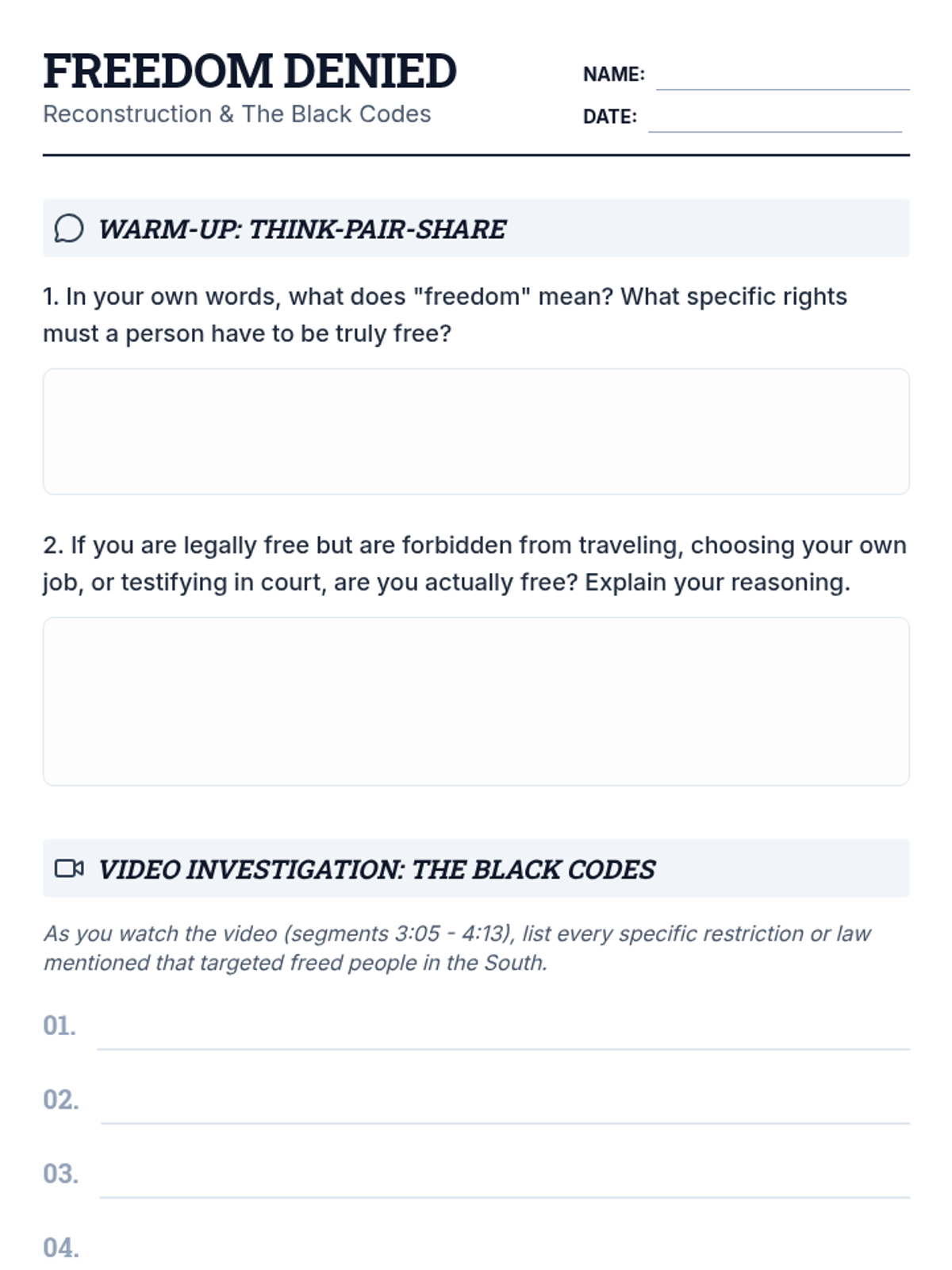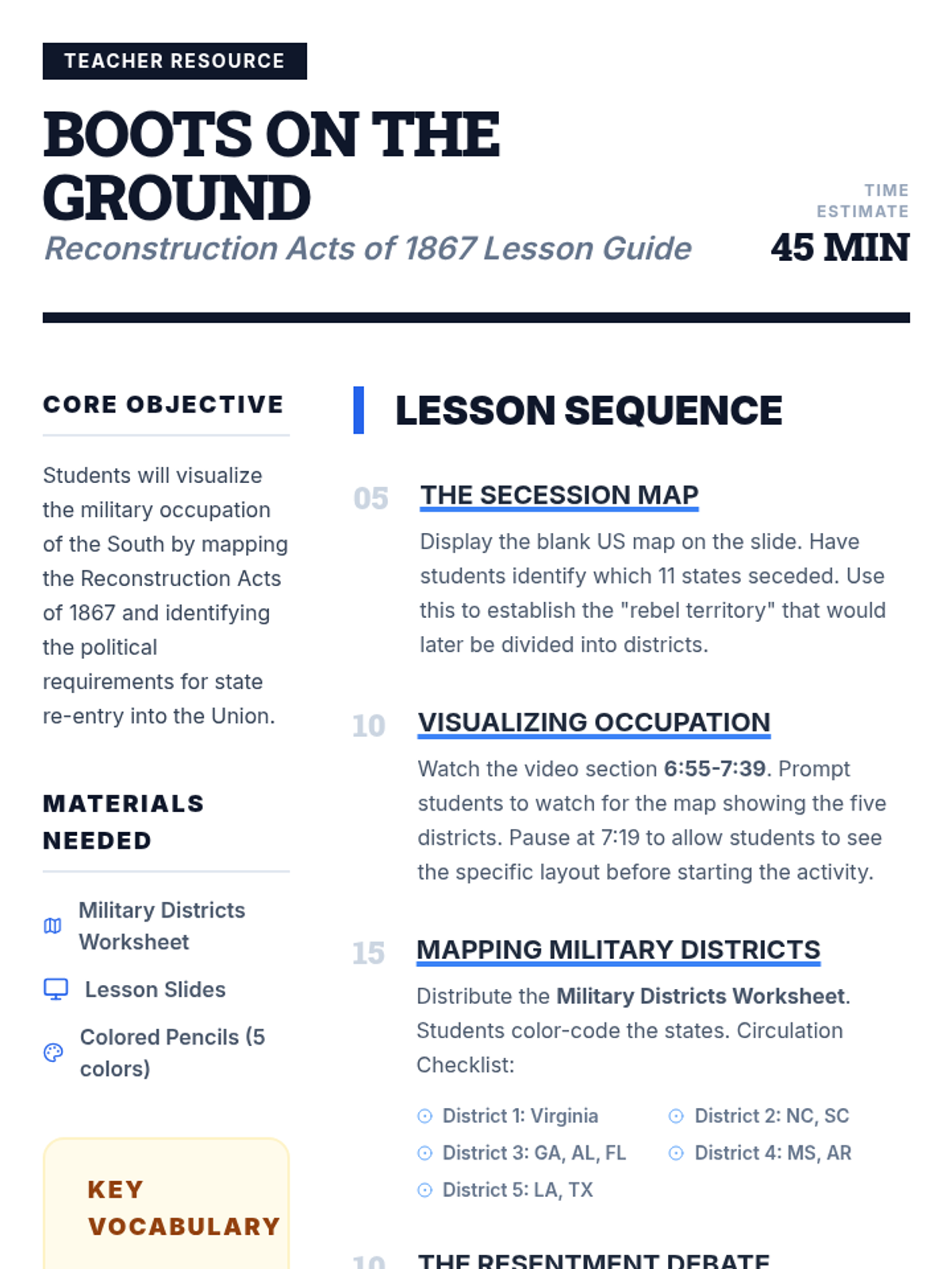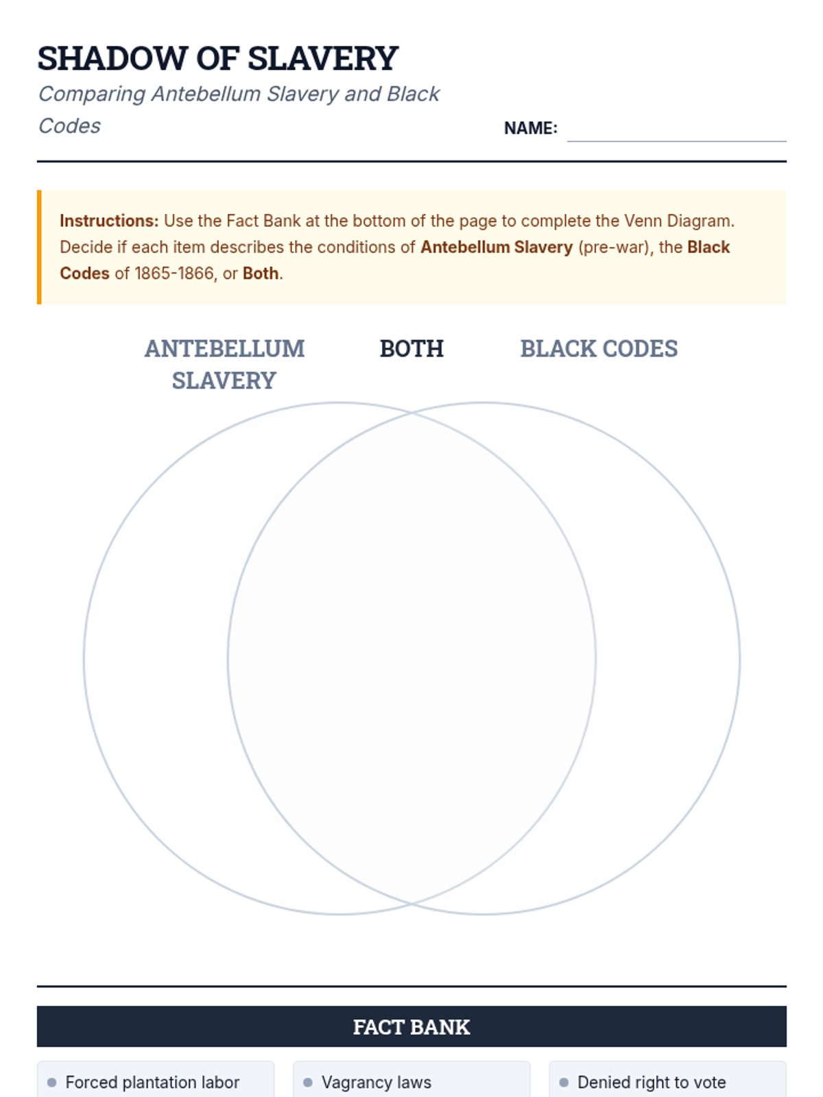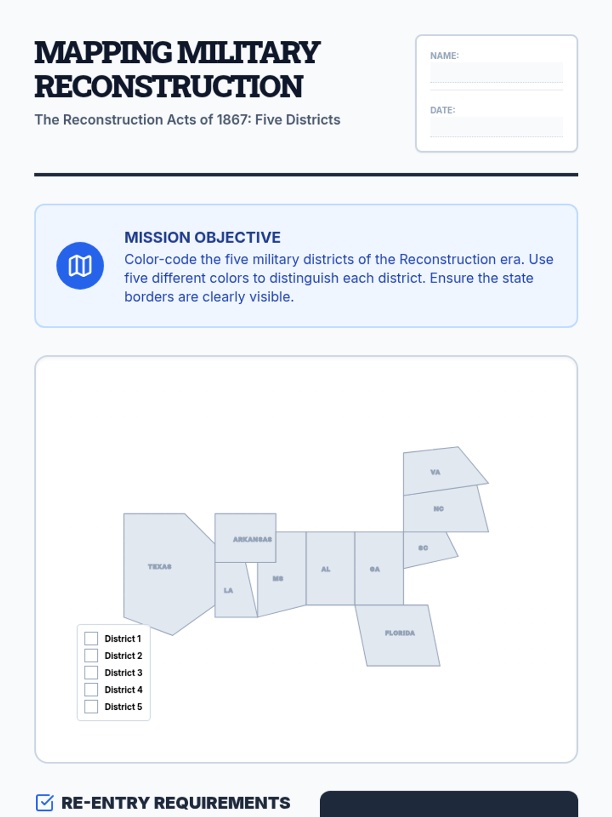 Reconstruction PeriodExamines the political and social restructuring of the United States following the Civil War. Addresses the implementation of the 13th, 14th, and 15th Amendments, the role of the Freedmen's Bureau, and the eventual rise of Jim Crow laws.