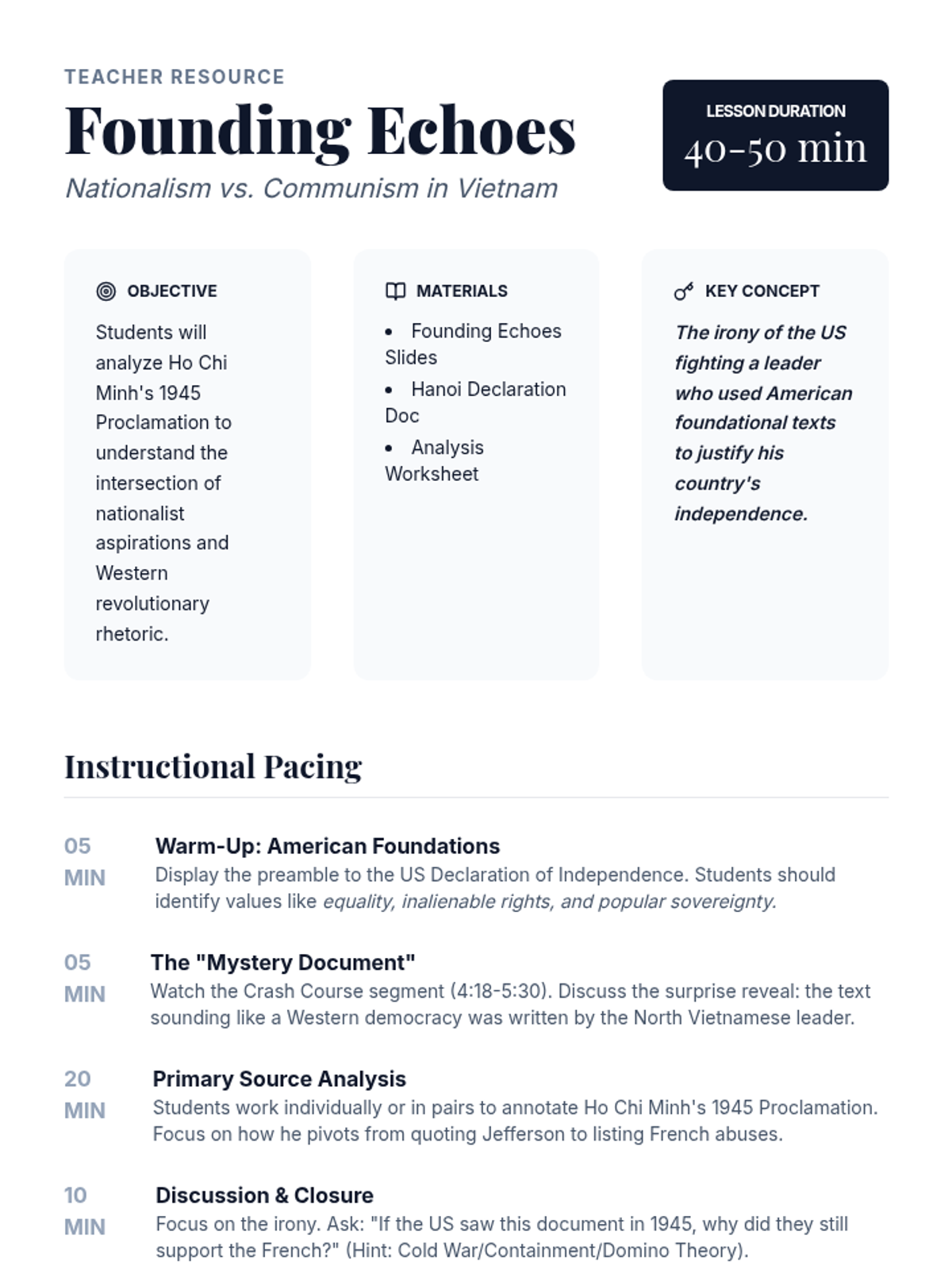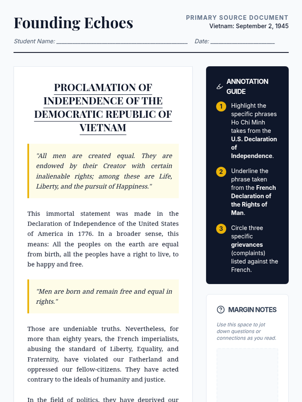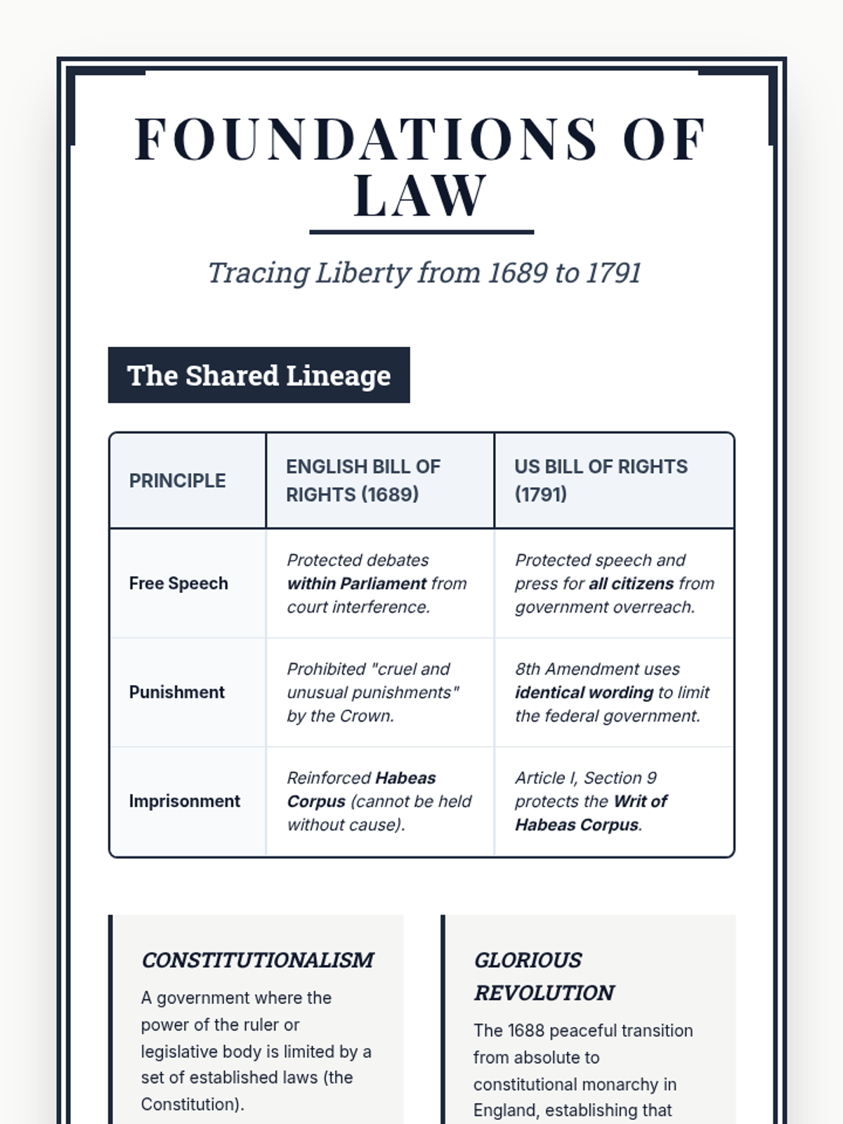 Founding of the United StatesExamines the drafting of the Declaration of Independence, the Revolutionary War's impact, and the creation of the U.S. Constitution. Connects Enlightenment ideals to the development of early American democratic institutions and federalism.