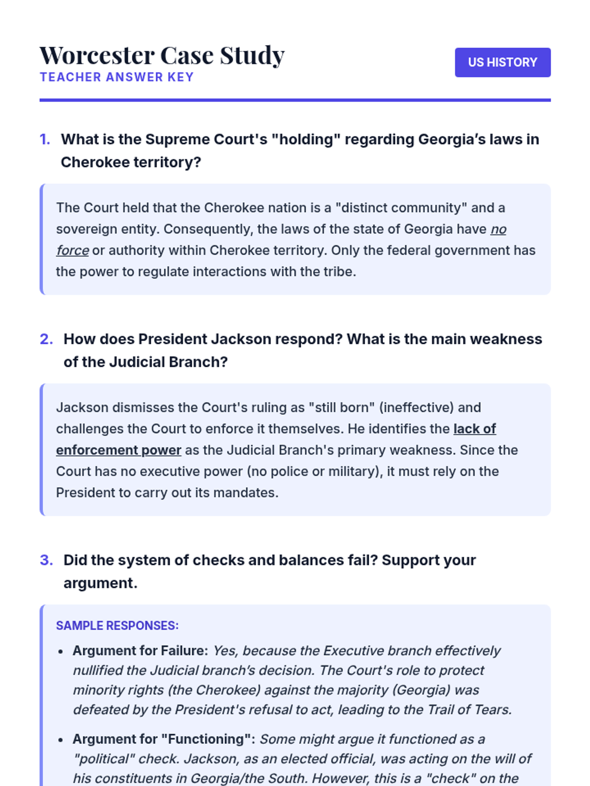 A US History lesson evaluating the effectiveness of the checks and balances system through the landmark case of Worcester v. Georgia and Andrew Jackson's refusal to enforce the ruling.