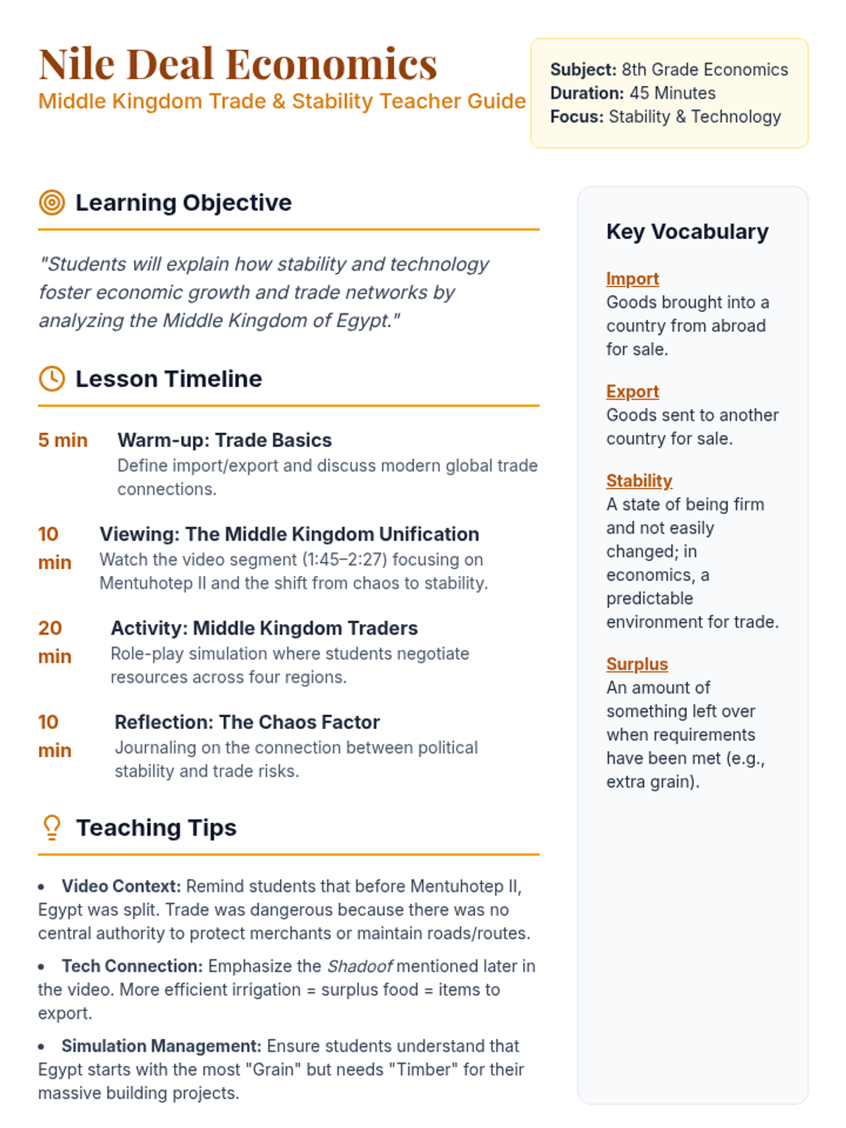 A comprehensive lesson on the Old, Middle, and New Kingdoms of Ancient Egypt, focusing on political stability, social structures, and geographical influence using the Crash Course World History series.