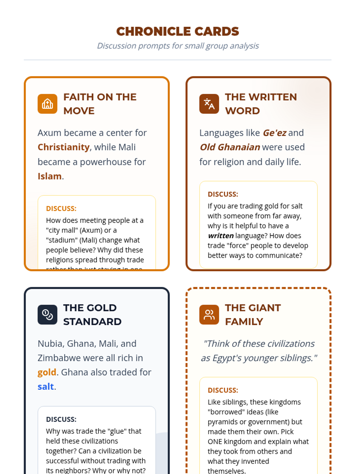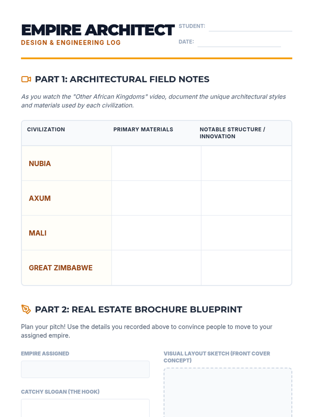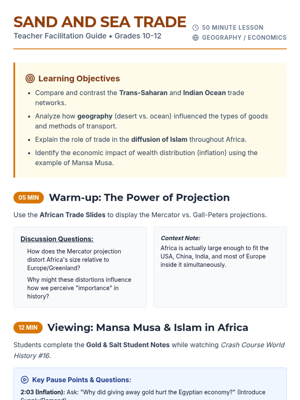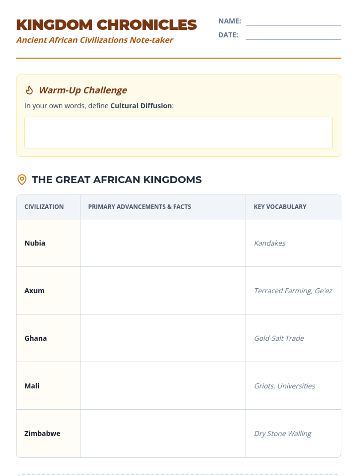African EmpiresTrans-Saharan trade networks, the rise of the Ghana and Mali empires, and the cultural impact of Mansa Musa. Examines the maritime power of Aksum and the architectural engineering of Great Zimbabwe.