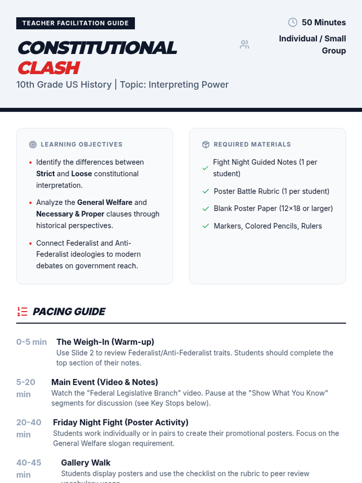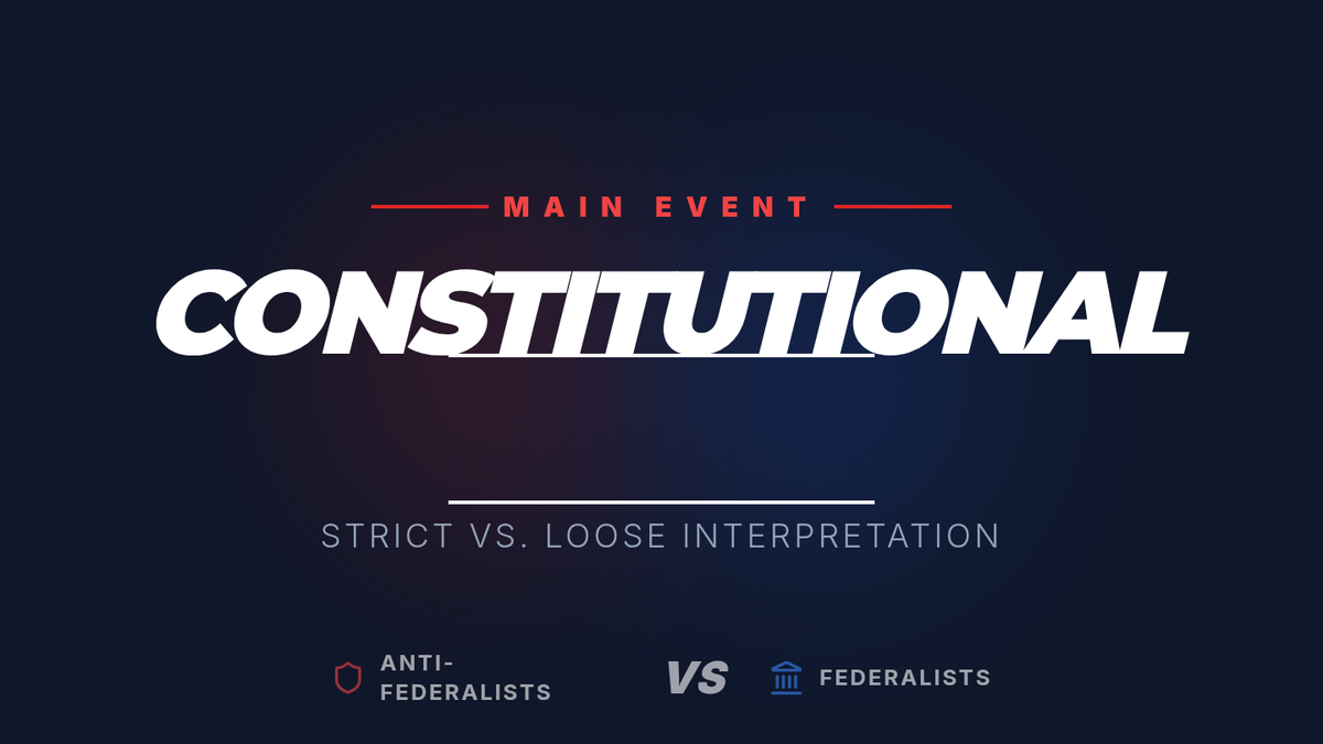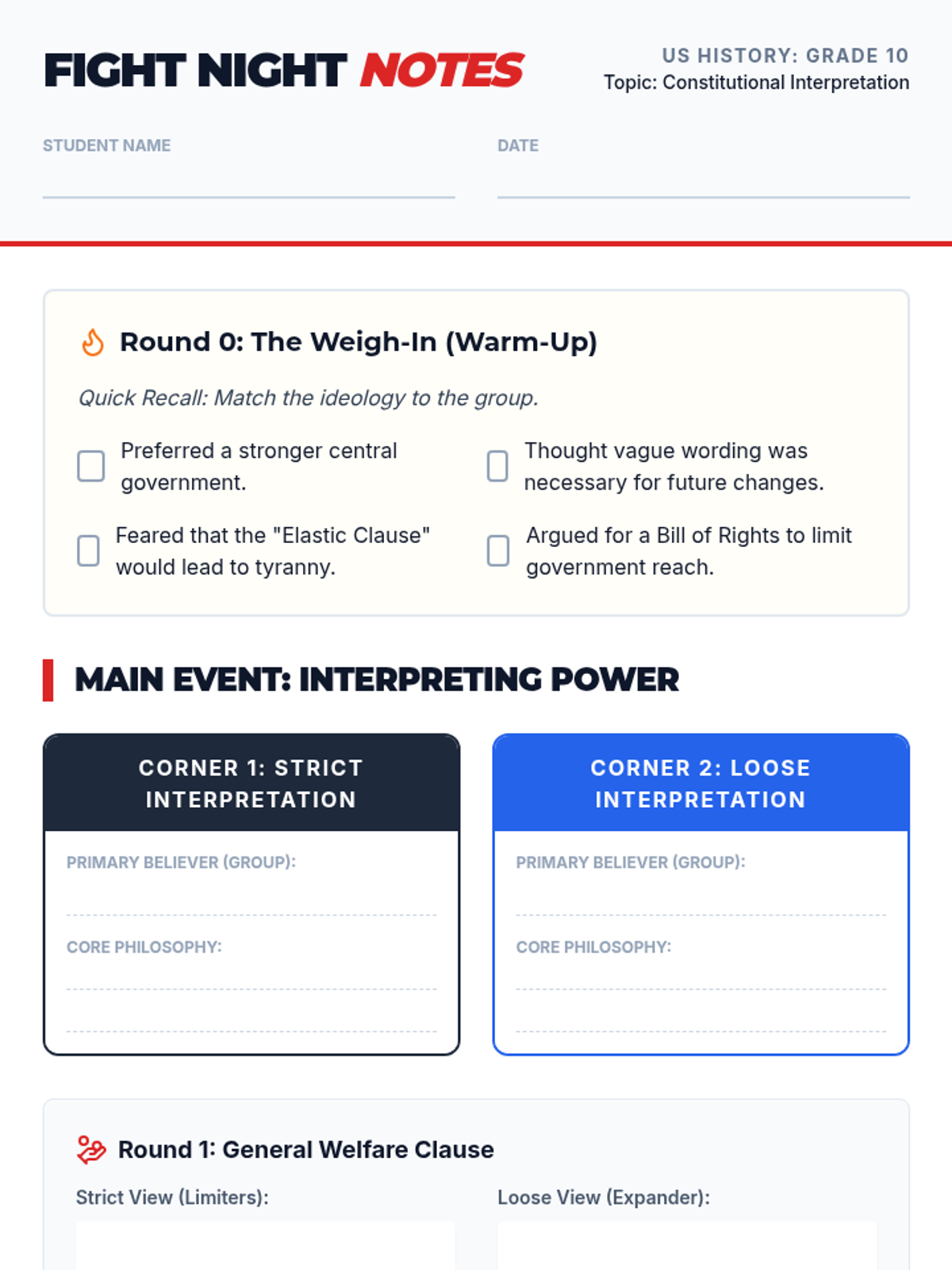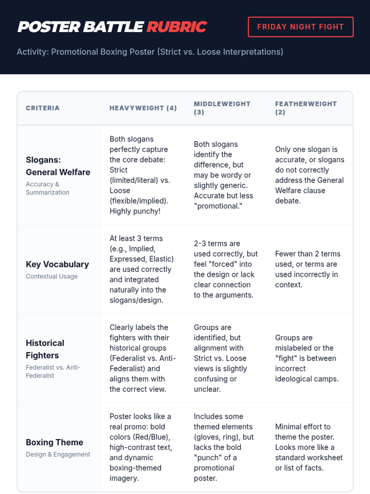 Students explore the debate between Federalists and Anti-Federalists regarding constitutional interpretation through a boxing-themed lesson. They analyze a video on strict versus loose interpretation and create promotional boxing posters to represent each side's view on the General Welfare and Necessary & Proper clauses.