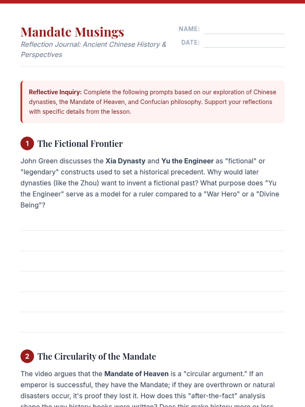 Early ChinaDevelopment of the Shang and Zhou dynasties alongside the core philosophies of Confucianism, Taoism, and Legalism. Examines agricultural societies along the Yellow River and the origins of the Mandate of Heaven.