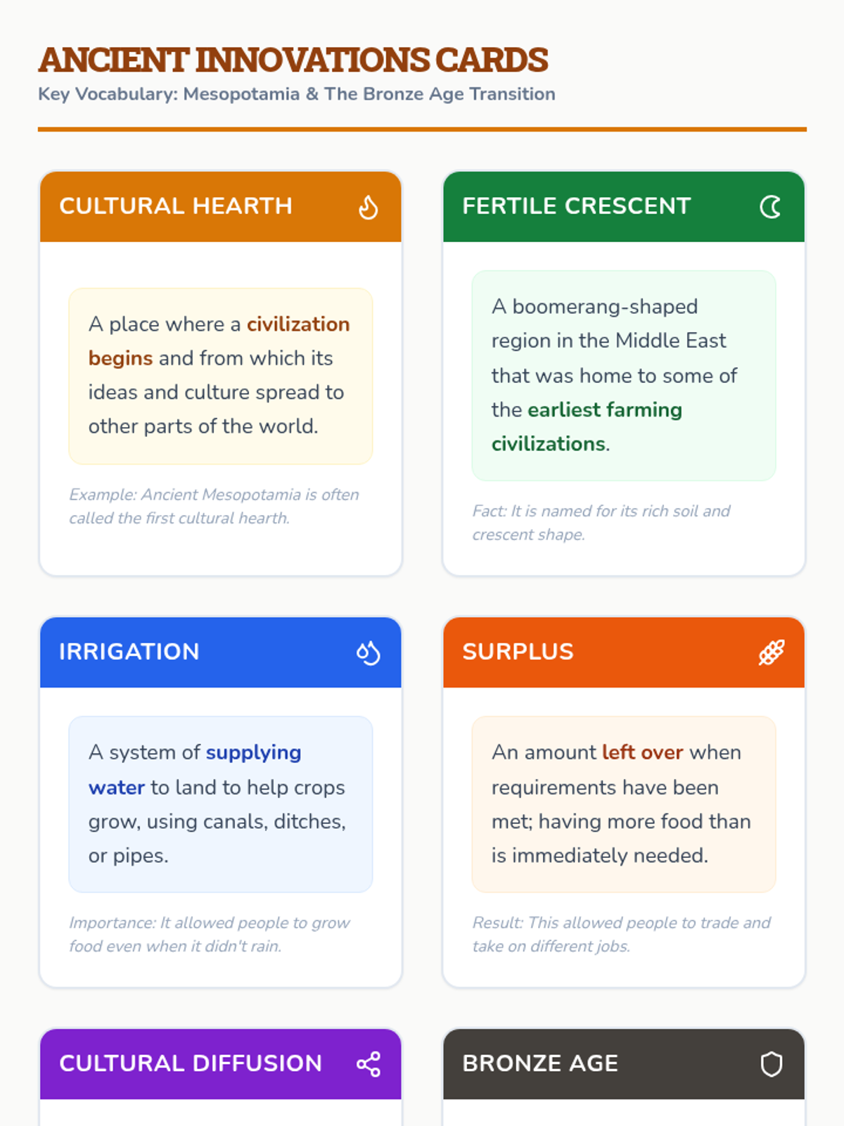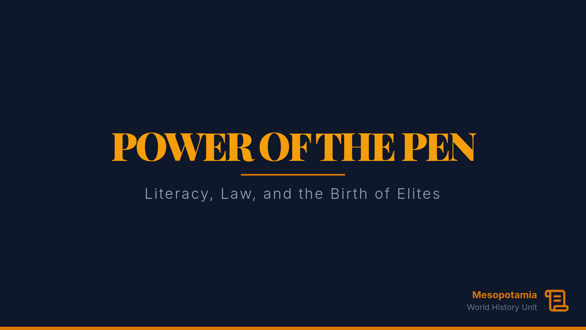 Ancient MesopotamiaDevelopment of city-states and agriculture in the Fertile Crescent. Examines cuneiform script, ziggurat construction, and early legal systems like the Code of Hammurabi.