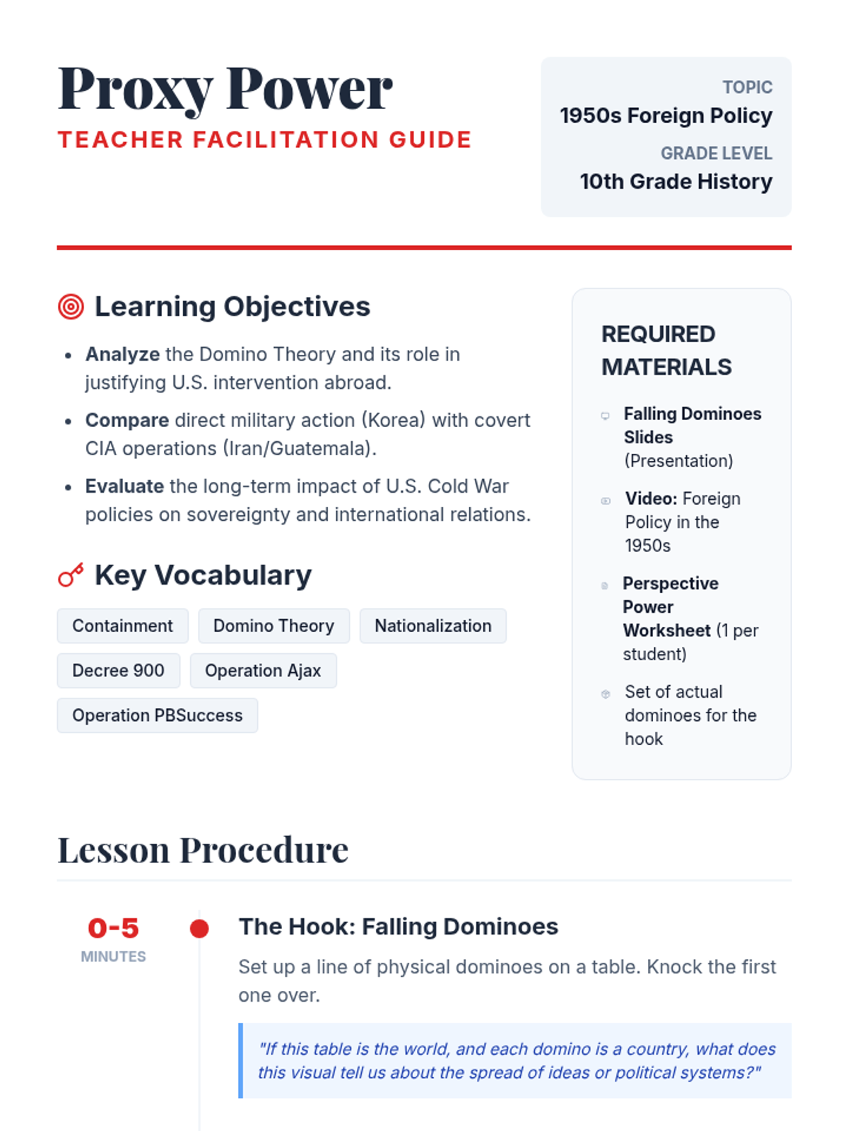 The Cold WarIdeological competition between capitalism and communism through nuclear deterrence, espionage, and proxy warfare. Examines the division of Europe, major proxy conflicts, and the eventual collapse of the Soviet Union.