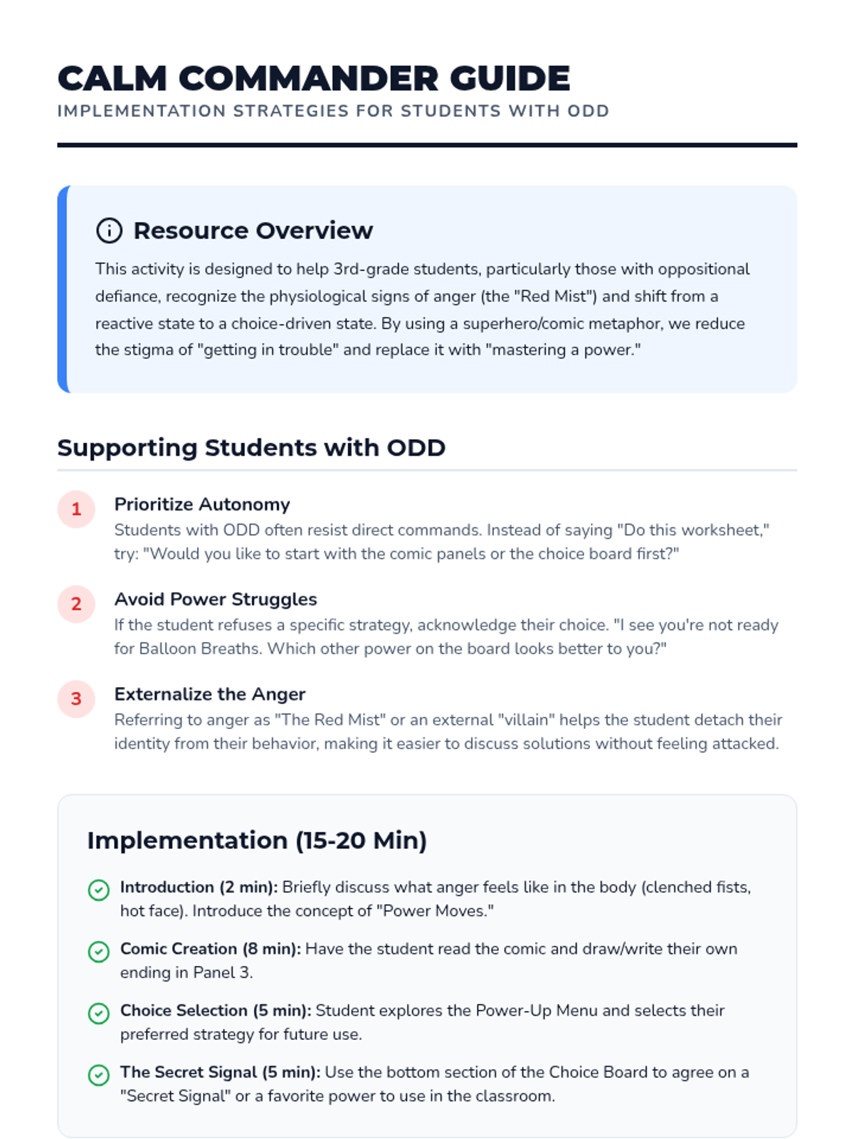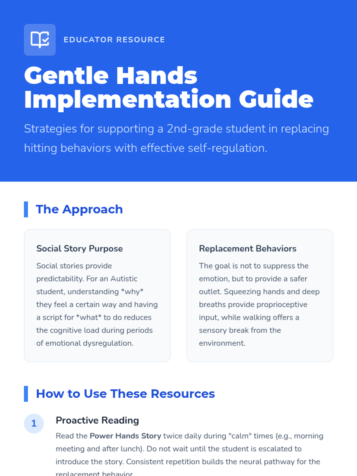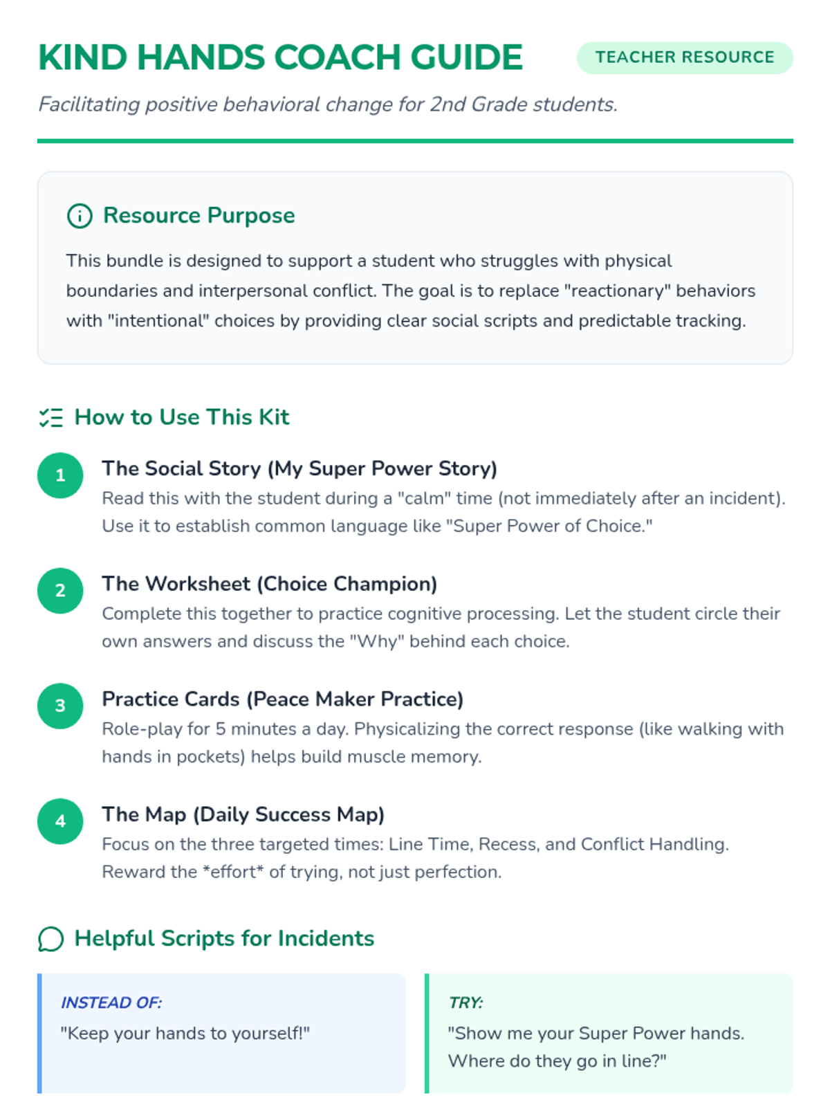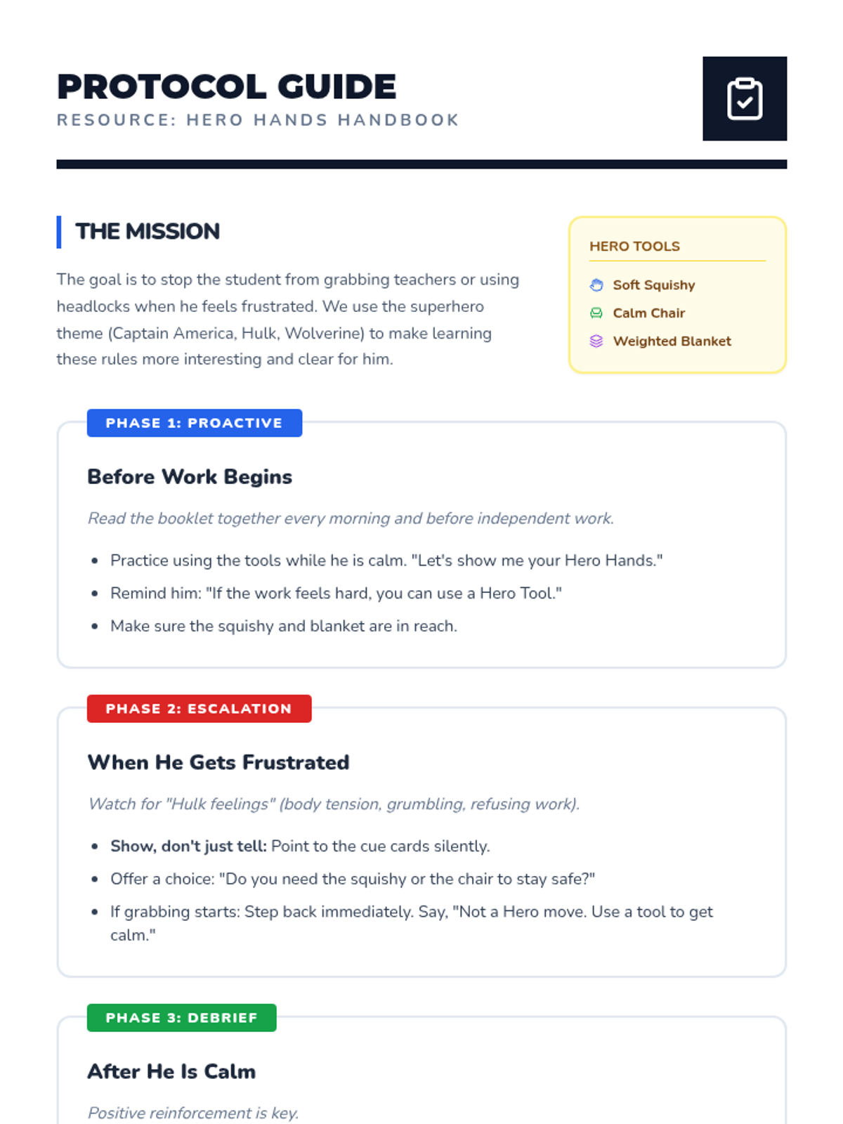 A comprehensive set of resources designed to help a student transition from aggressive physical behaviors to safe self-regulation strategies using a superhero theme. Includes a social story booklet, portable visual cue cards, and a teacher implementation guide.