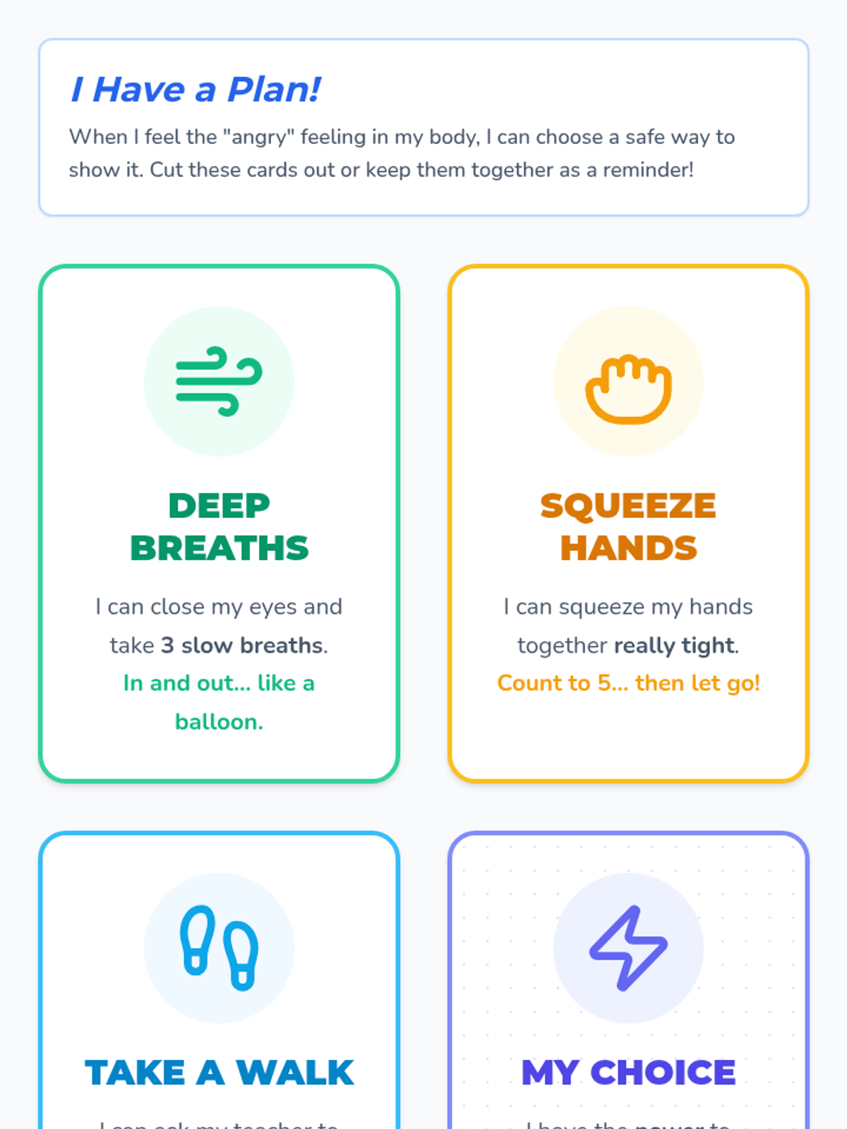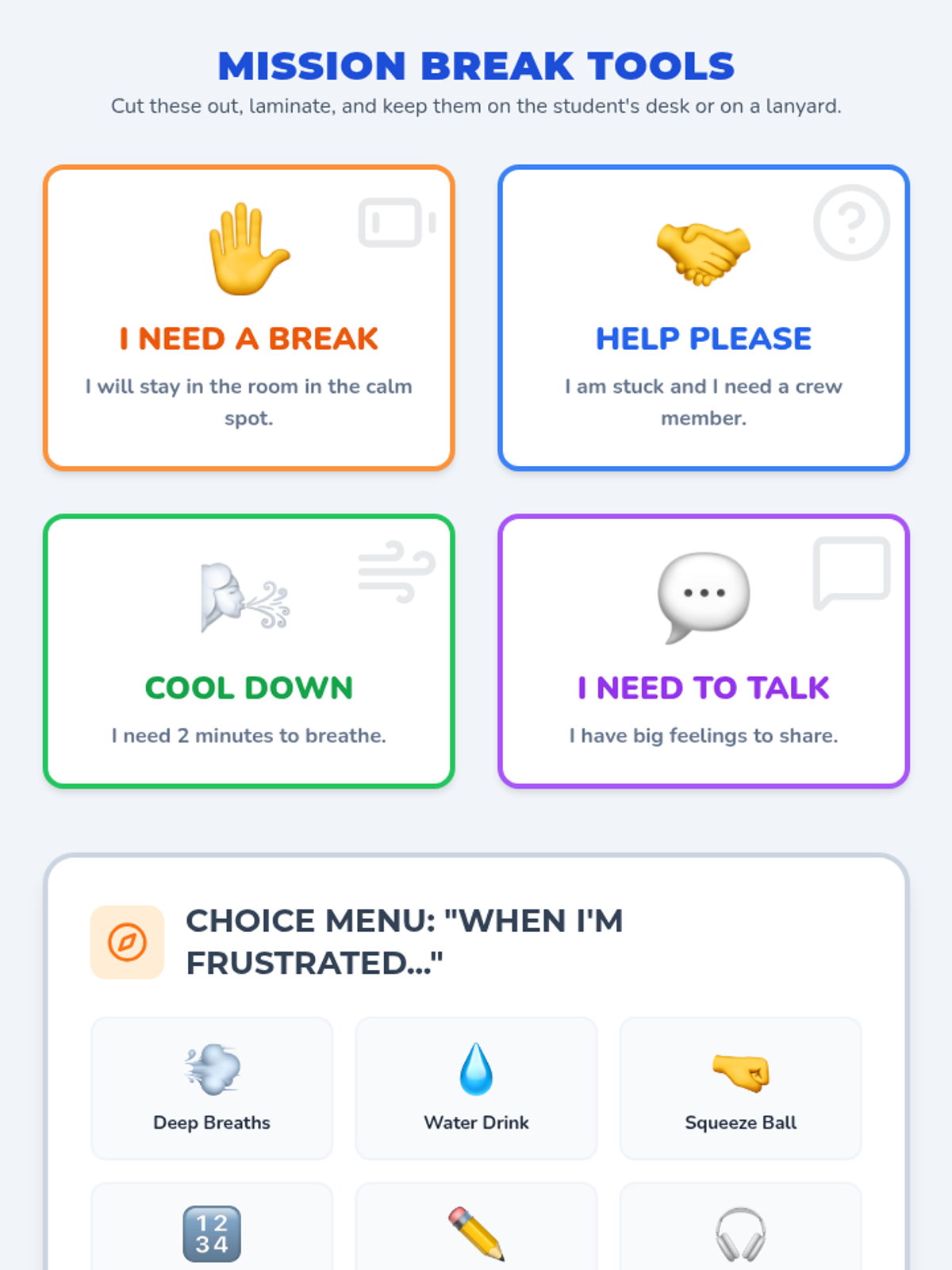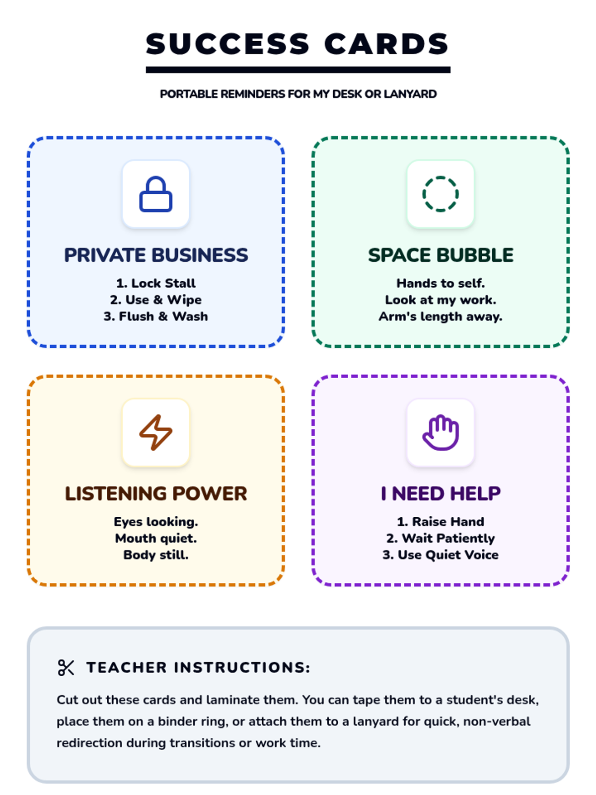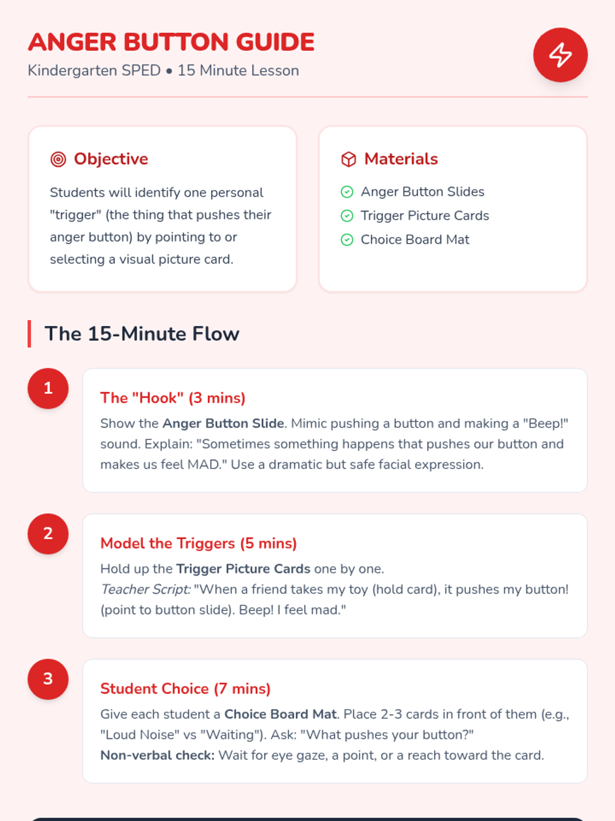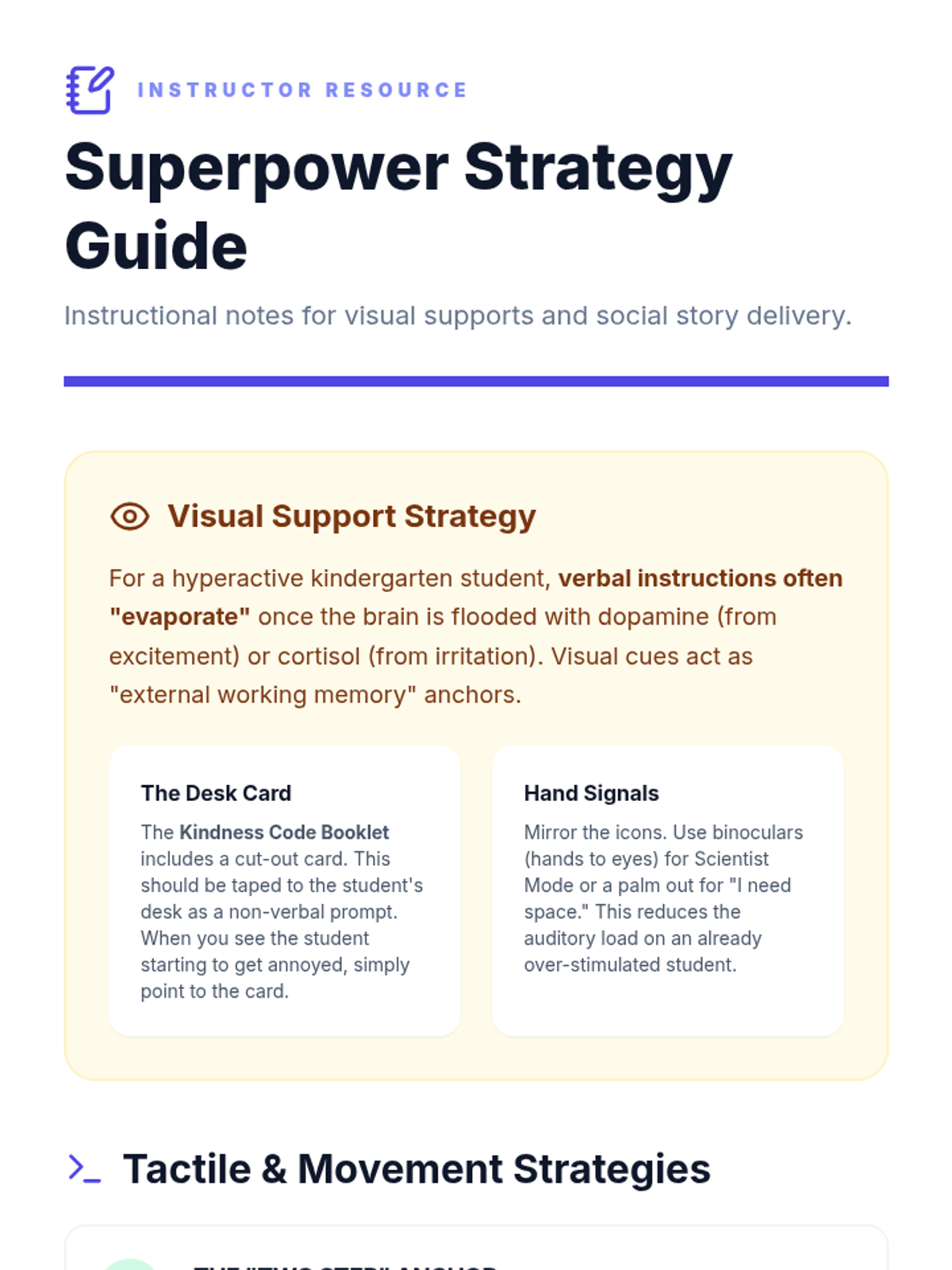 A comprehensive set of resources designed to help a student transition from aggressive physical behaviors to safe self-regulation strategies using a superhero theme. Includes a social story booklet, portable visual cue cards, and a teacher implementation guide.