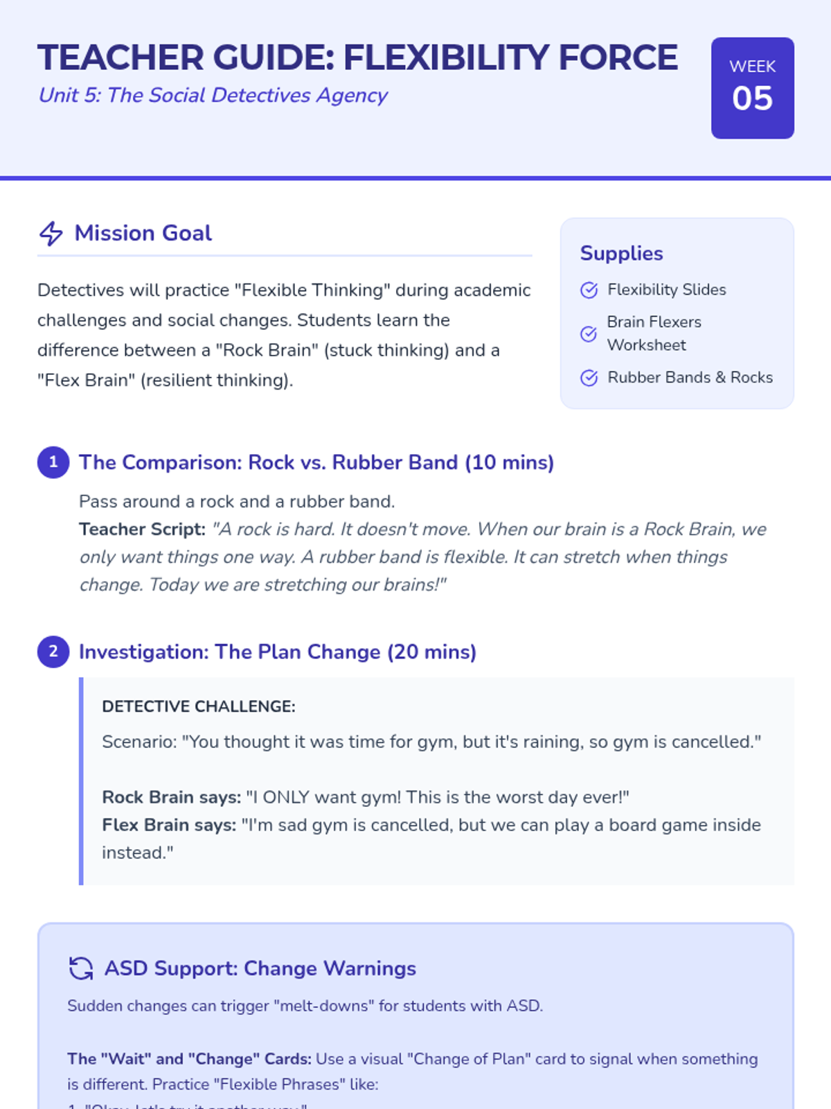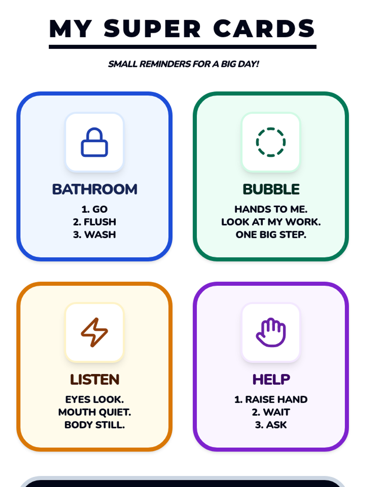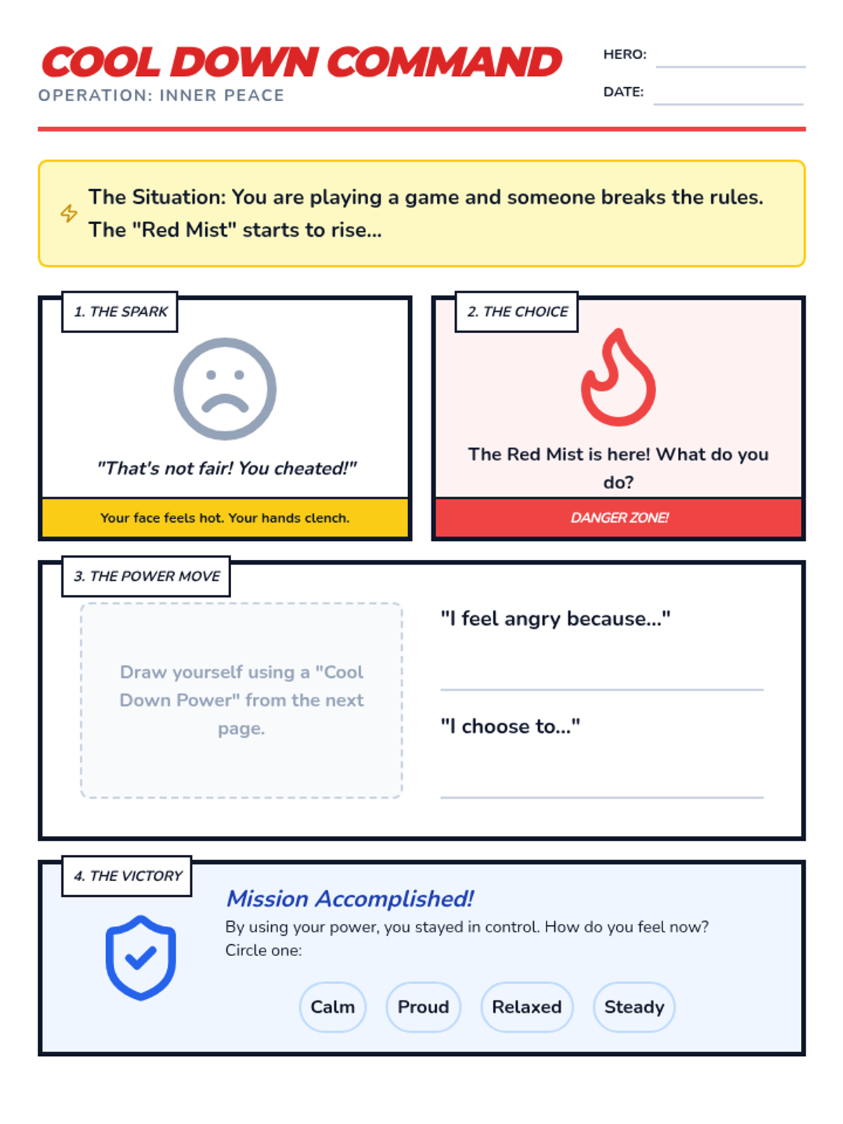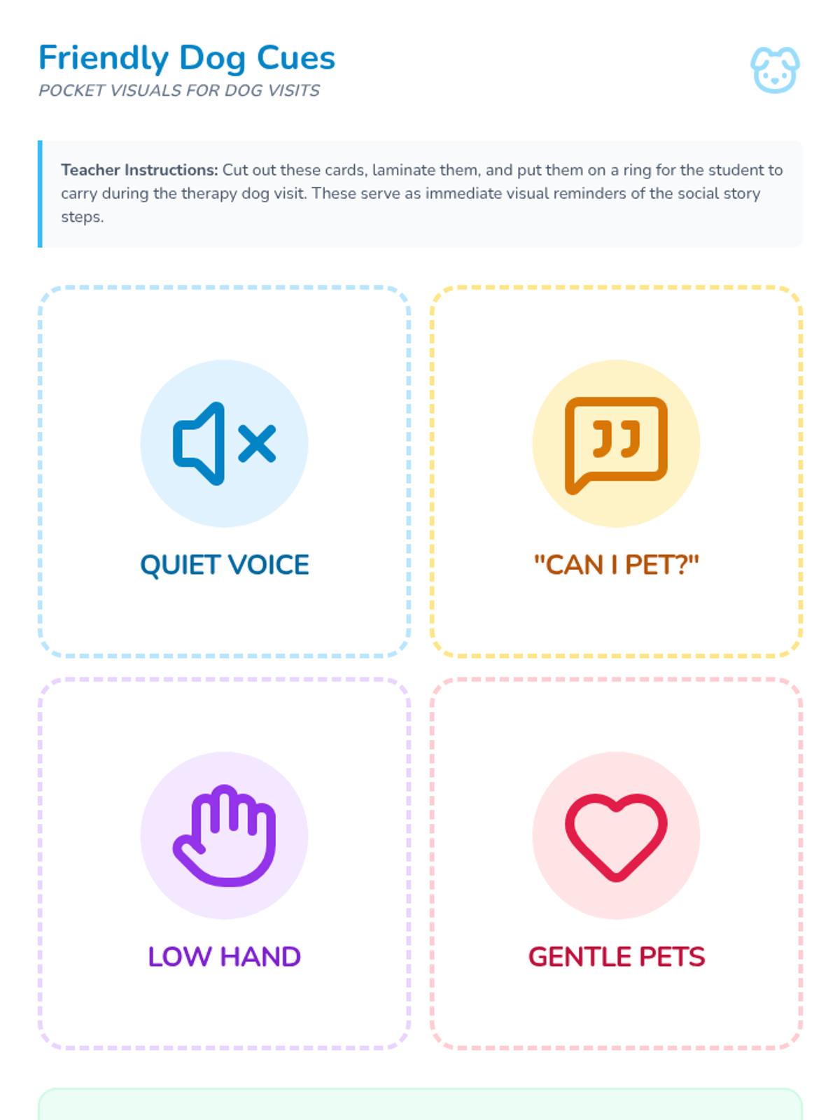 A comprehensive set of resources designed to help a student transition from aggressive physical behaviors to safe self-regulation strategies using a superhero theme. Includes a social story booklet, portable visual cue cards, and a teacher implementation guide.
