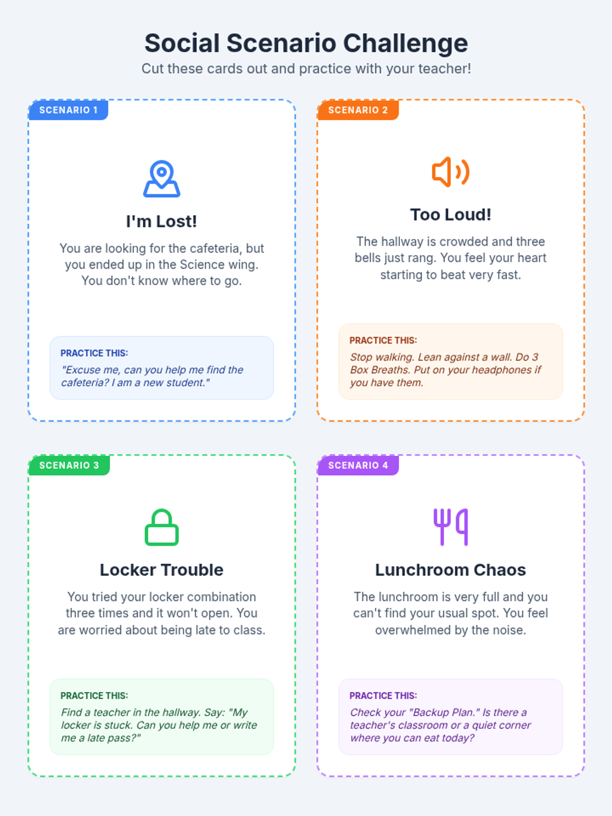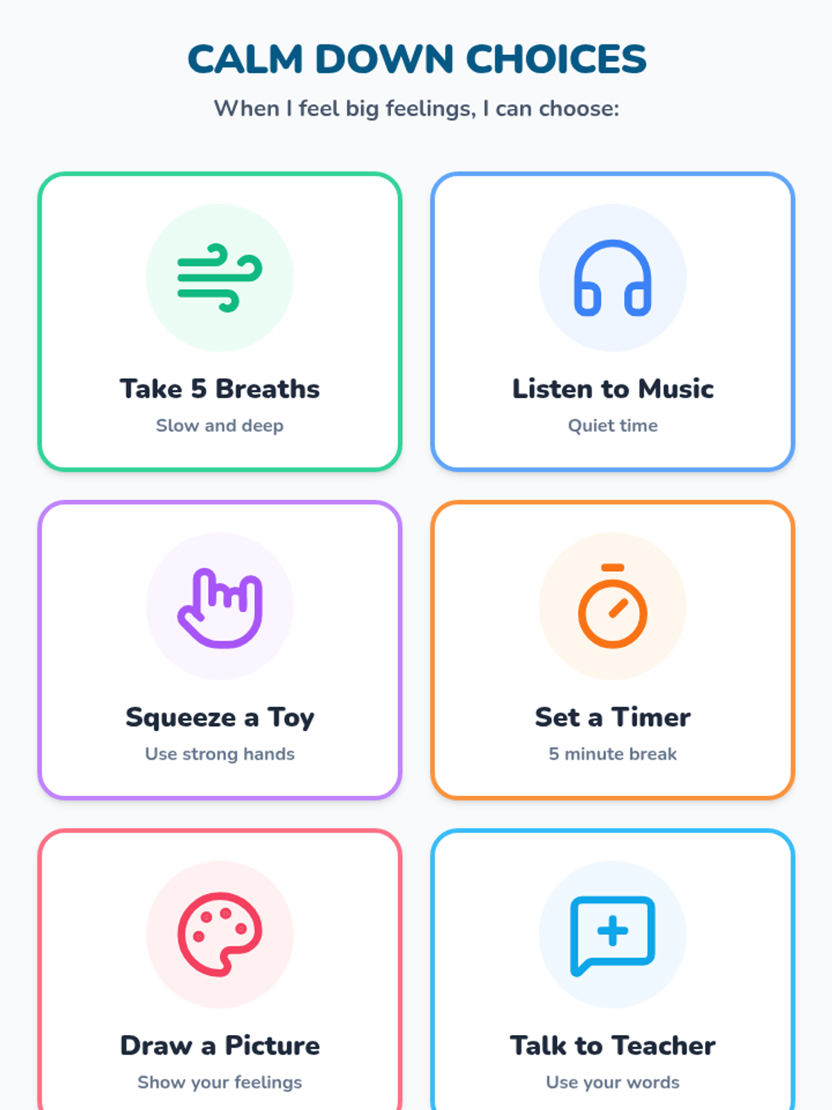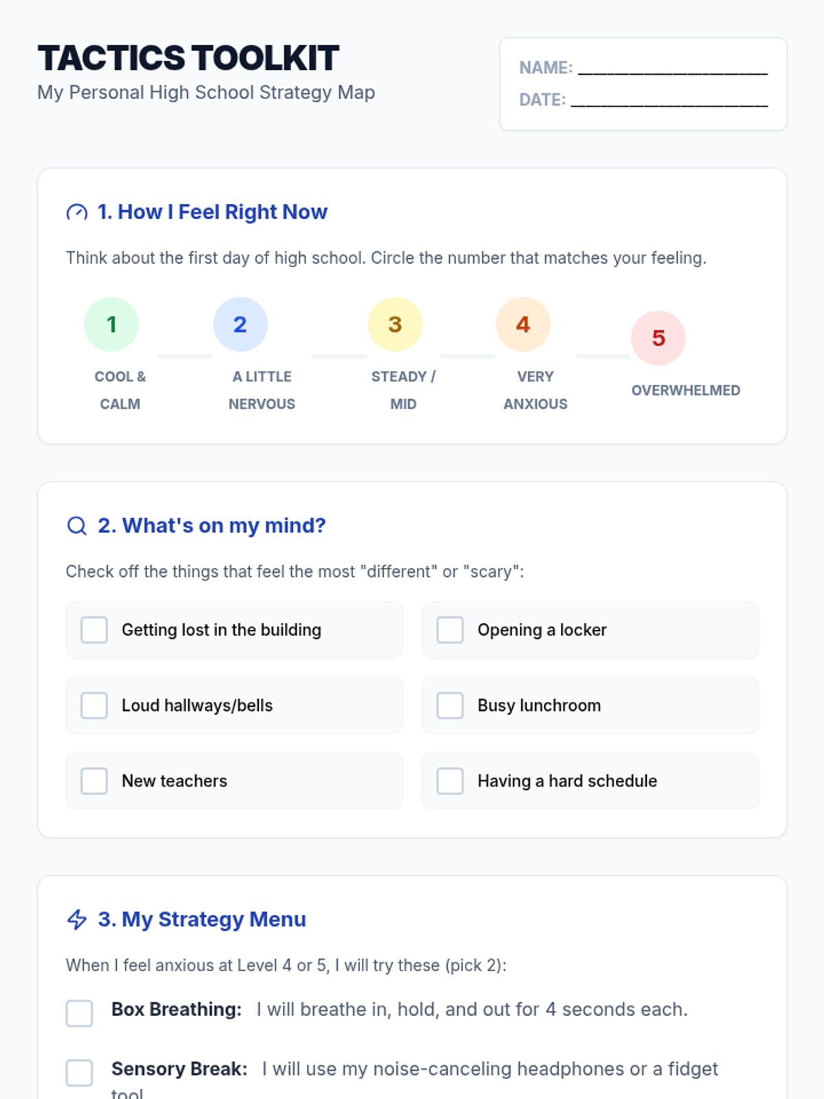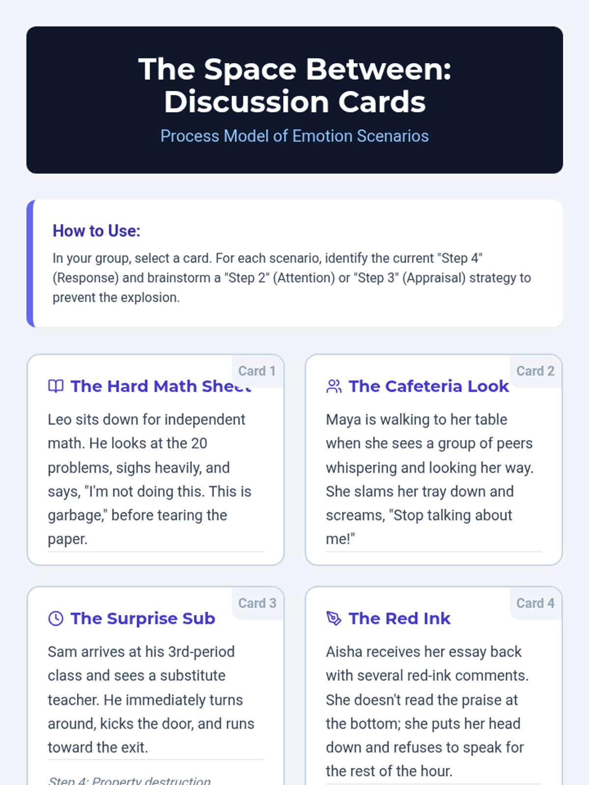 Selecting Regulation StrategiesMatching specific emotional triggers to appropriate sensory, cognitive, or physical coping mechanisms. Equips learners with a repertoire of tools for situational self-management and emotional balance.