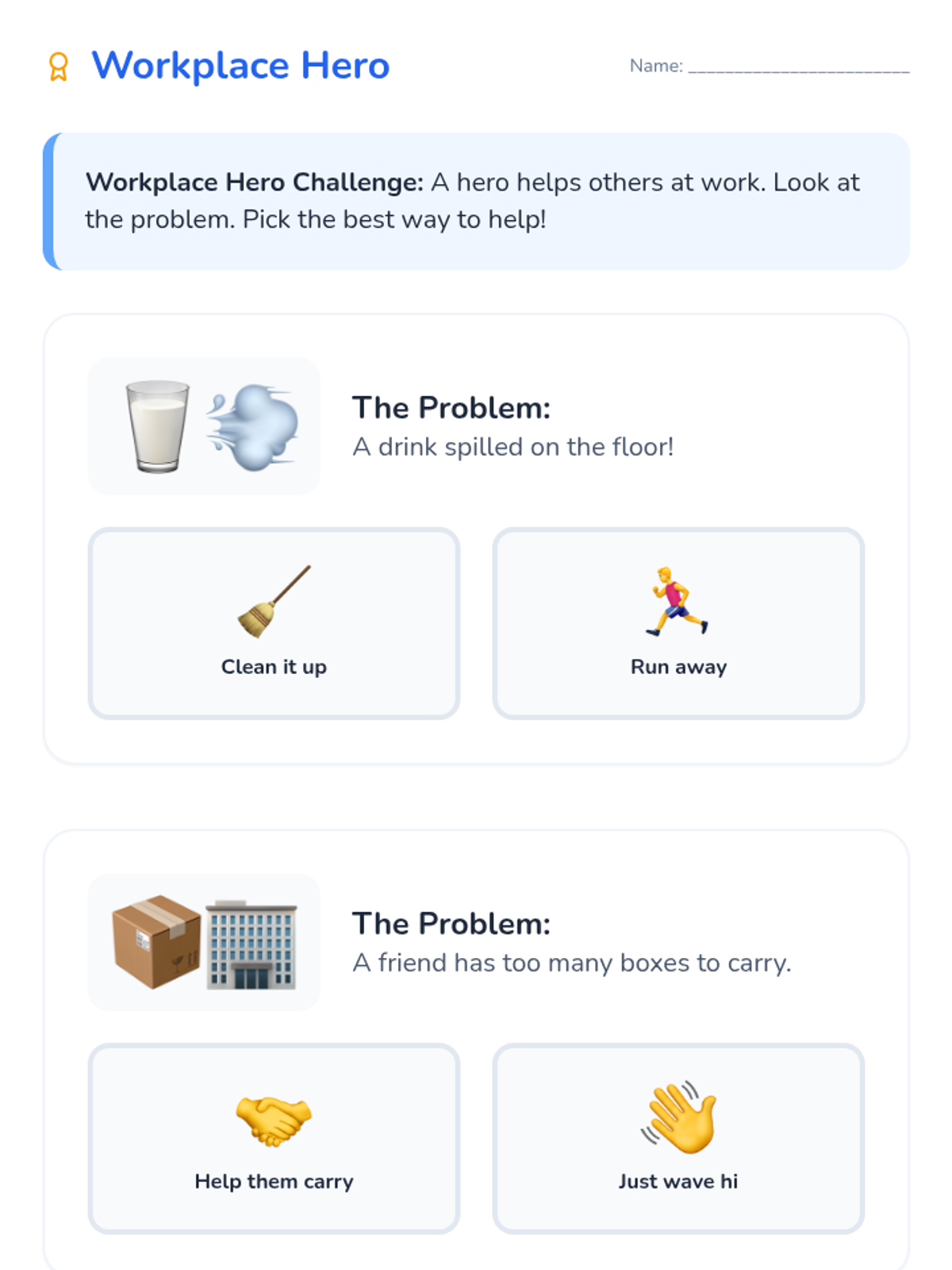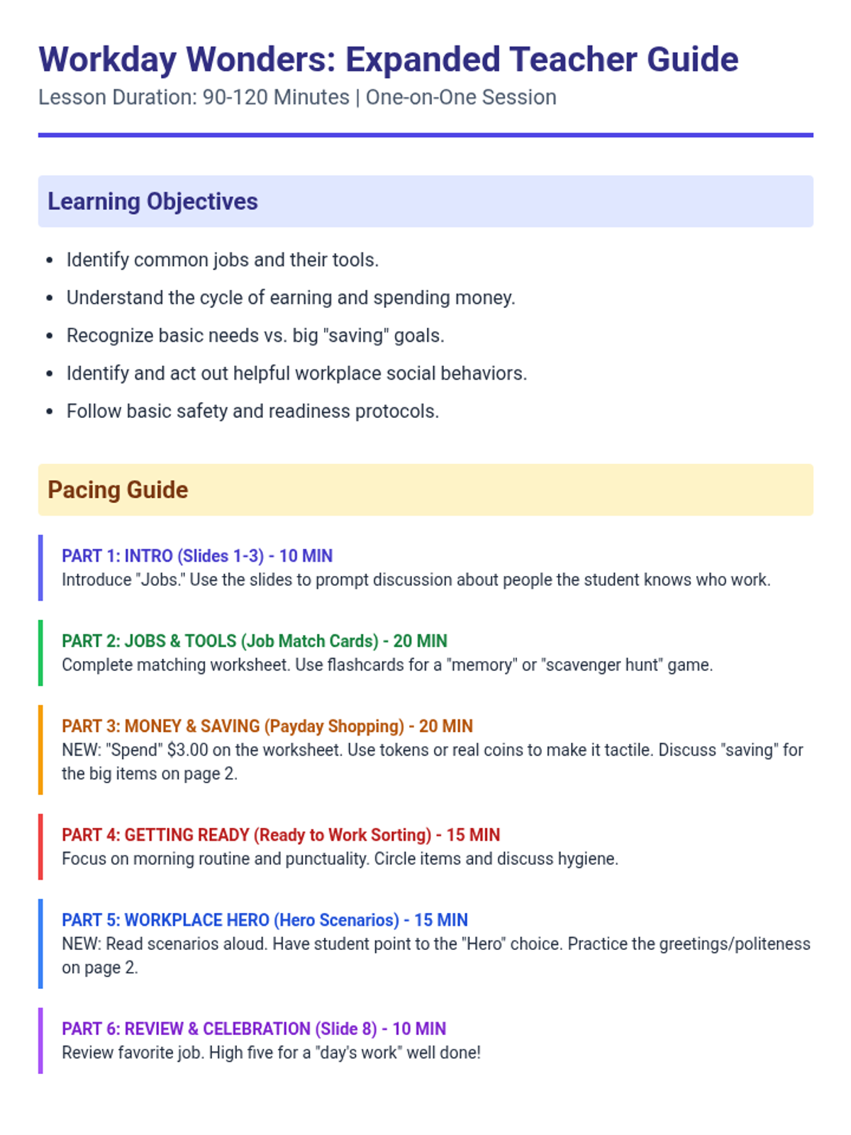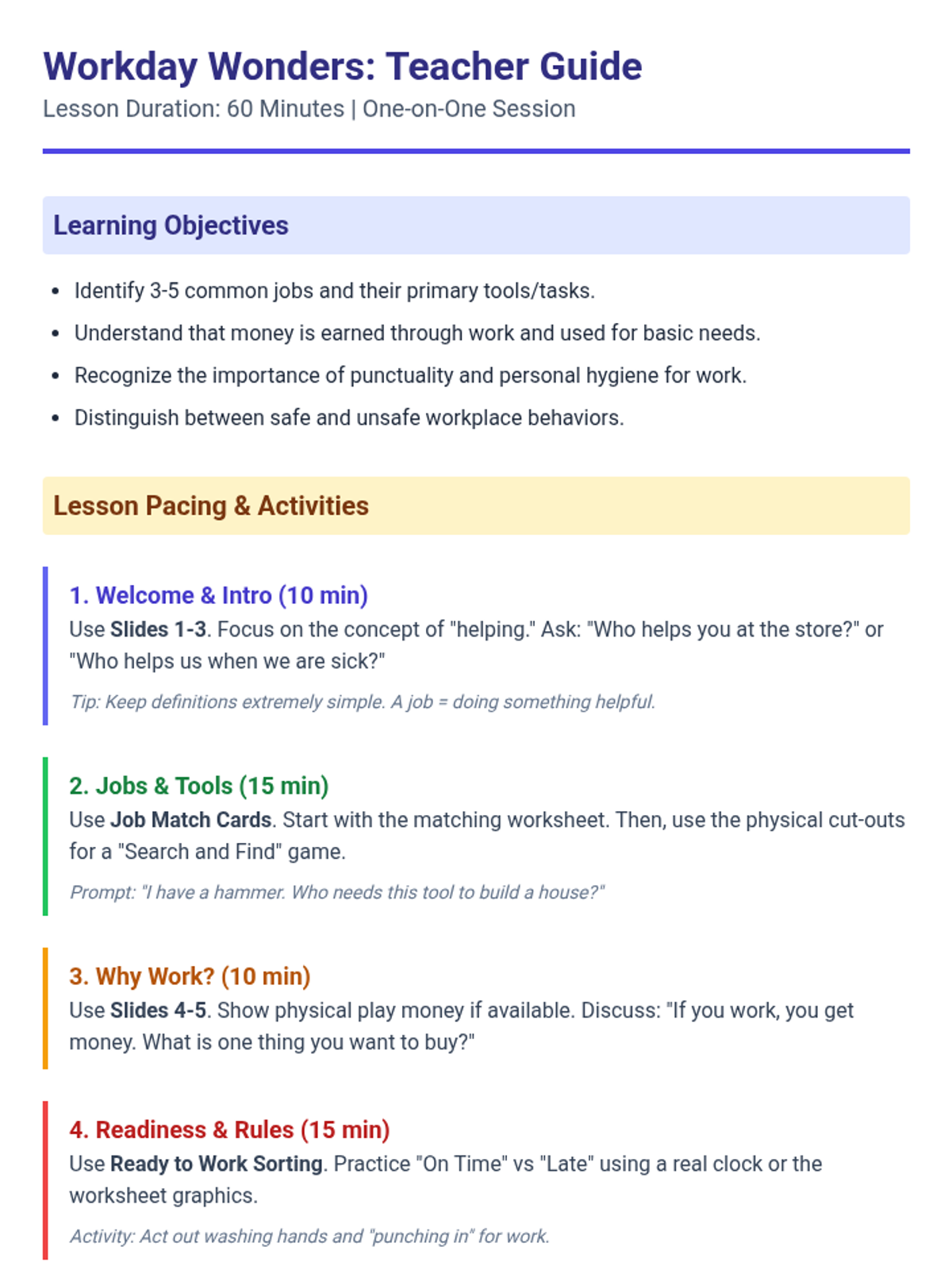 A comprehensive 120-minute one-on-one training session designed for individuals with intellectual disabilities. This lesson covers professional communication, teamwork, and problem-solving through scripted instruction, role-play, and practical activities.