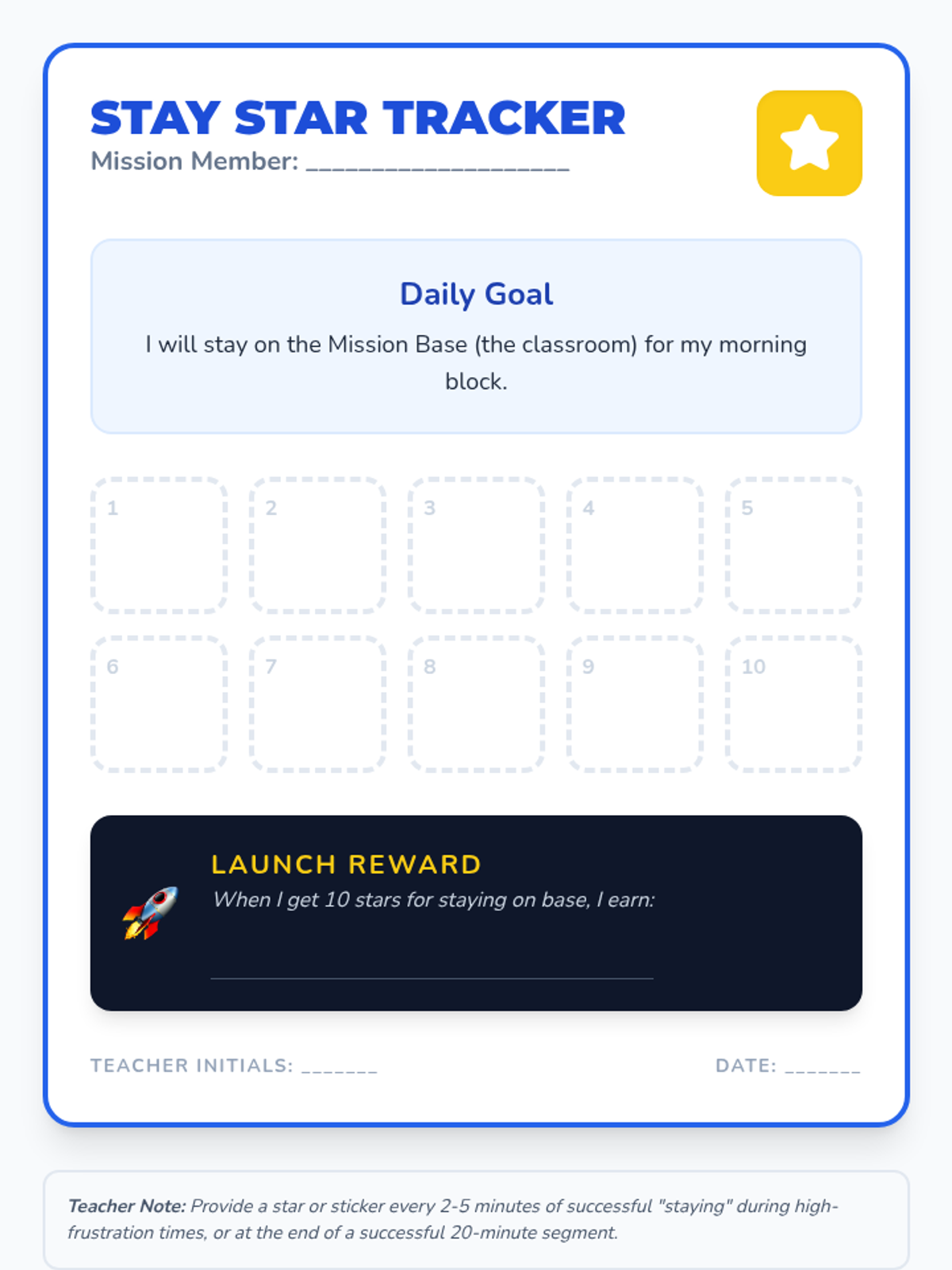 A positive reinforcement system designed to help students remain in the classroom through a themed 'Base Camp' tracking system. Includes a student-facing milestone chart and a teacher guide for implementation.