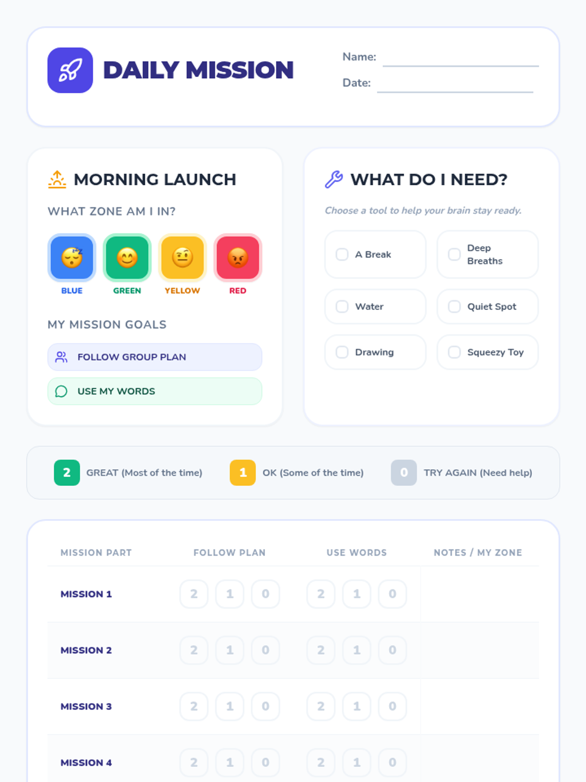 Emotional Regulation FrameworksEvidence-based models including the Zones of Regulation and RULER for identifying physiological triggers and emotional states. Develops specific coping strategies for impulse control and self-management across various environments.