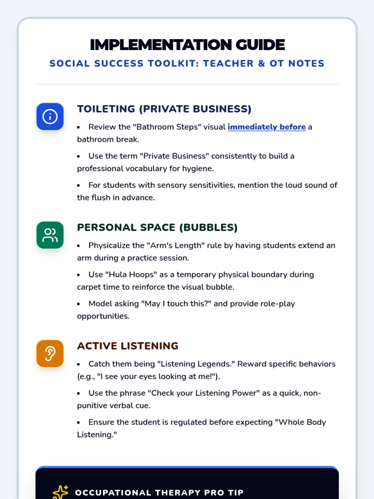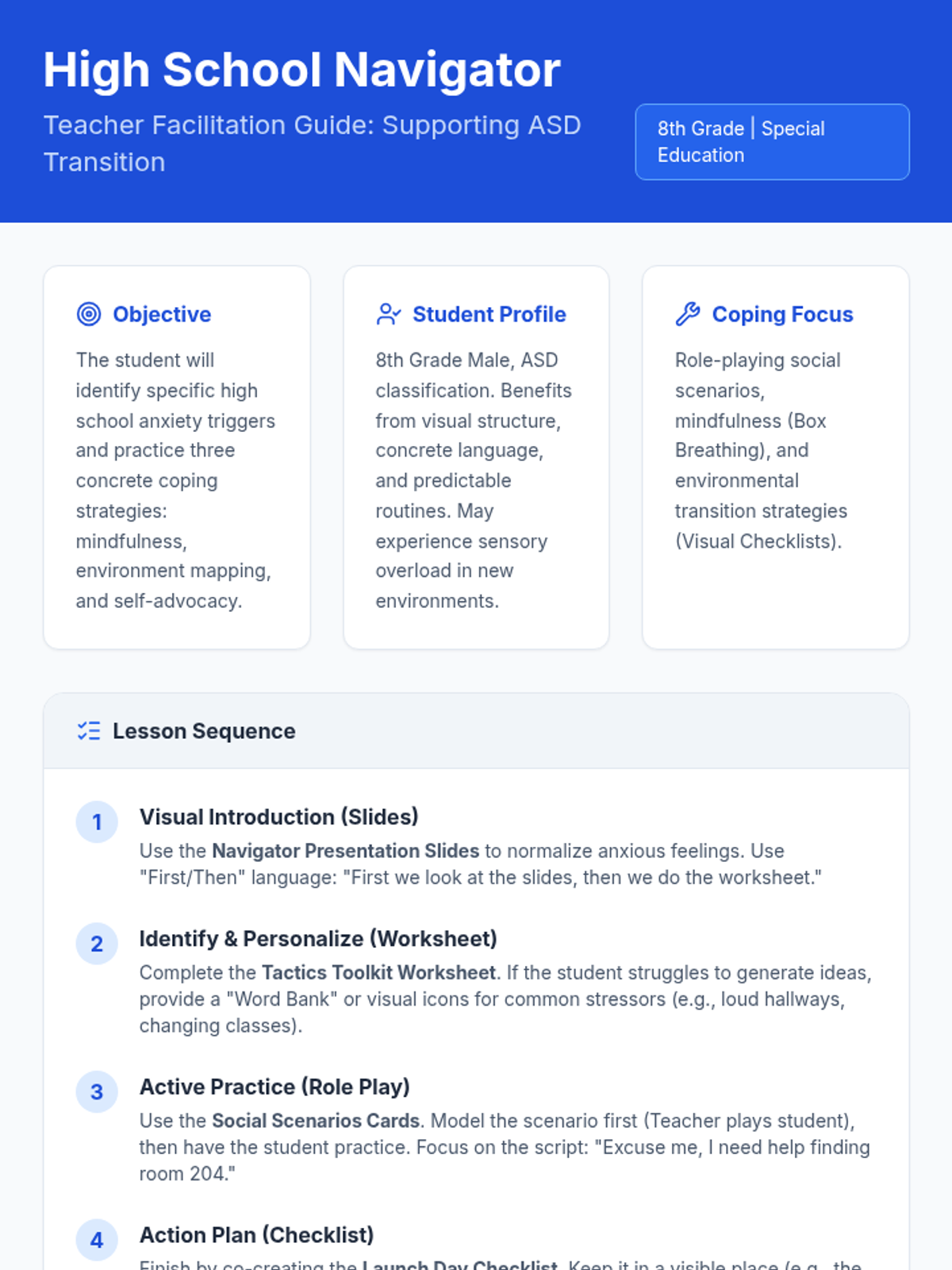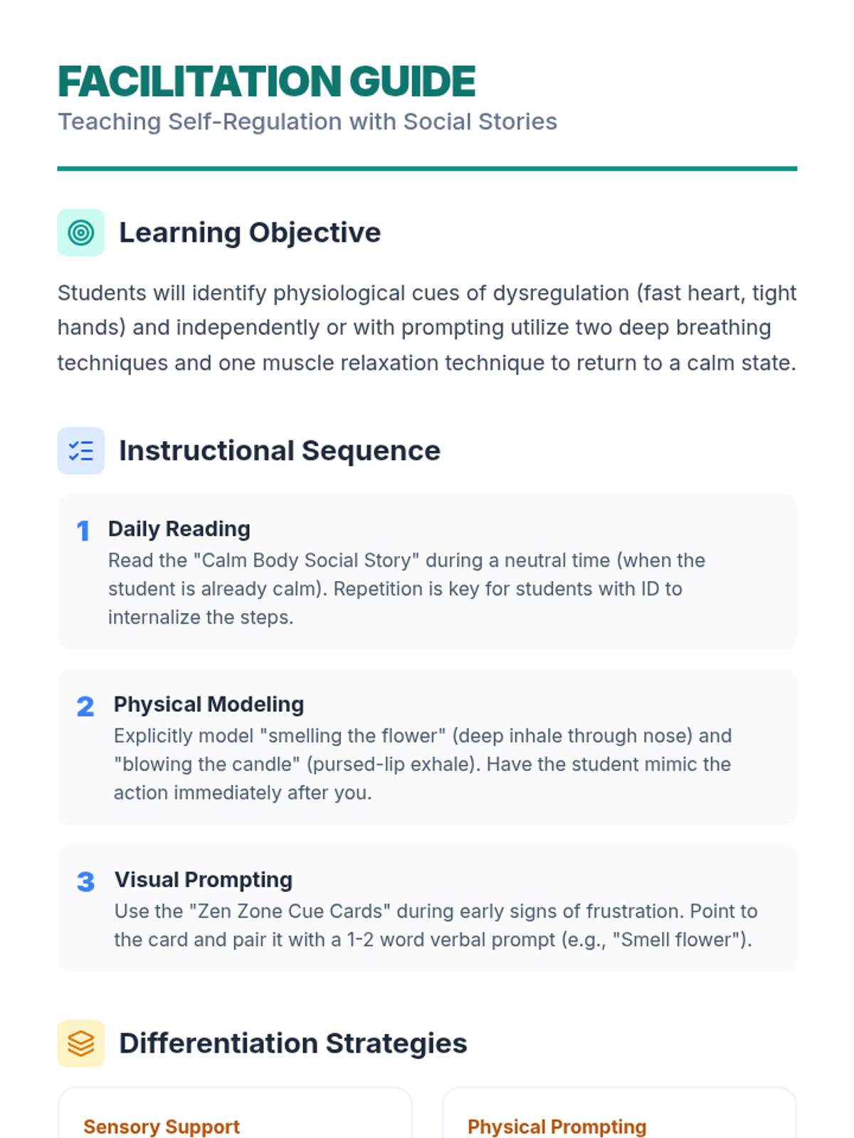 Special EducationSensory Processing & RegulationSensory Preferences IdentificationSensory Tool UseCommunicating Sensory NeedsSensory Overload RecognitionDeep Breathing PracticeMovement Break UtilizationIndependent Calming Strategy UsePersonalized Calming RoutinePersonal Sensory Diet CreationProactive Sensory BreaksEmotion Intensity RecognitionDysregulation RecoveryPositive Behavior SupportUnderstanding Social StoriesPersonal Social Story CreationEmotional Regulation FrameworksPersonal Trigger IdentificationSelecting Regulation StrategiesReinforcement System ResponseSelf-Monitoring & RewardsLearning Positive AlternativesCross-Setting Skill GeneralizationSocial CommunicationEye Contact & Personal SpaceContext-Appropriate GreetingsAppropriate Volume & ToneConversation Turn-TakingTopic Maintenance in DiscussionEffective Help-SeekingBody Language InterpretationFacial Expression RecognitionIdioms & Figurative LanguageSocial Problem IdentificationSocial Solution GenerationSocial Decision EvaluationTask ManagementMinimal Prompting Task StartSelf-Talk for StartingStarter Strategies for Difficult TasksAge-Appropriate Task PersistenceStrategic Break ManagementSmooth Task TransitionsAdapting to Plan ChangesObstacle Problem-SolvingMulti-Day Project CompletionPlanning & OrganizationPhysical Material OrganizationVisual Schedule & Timer UseSequential Task BreakingTime Estimation SkillsTask PrioritizationDigital & Physical Workspace ManagementPersonalized Organization StrategiesDetailed Project PlanningMultiple Commitment BalancingAcademic Support StrategiesMath Manipulative UseVisual Math Problem RepresentationComplex Math Problem BreakdownText Highlighting & AnnotationVisualization While ReadingPredictions & Inferences from TextText Structure Graphic OrganizersWriting Graphic OrganizersSentence Frames & TemplatesStudy Guide CreationSpaced Repetition for MemoryAssistive Writing TechnologyWorking Memory SupportSingle-Step Direction FocusMulti-Step Direction FollowingInformation Chunking PracticeVisual Support Memory AidsMnemonic Device ApplicationEfficient Note-Taking SystemsGraphic Organizer Note-TakingNote Review & OrganizationSustained Complex Task AttentionAssistive TechnologySymbol-Word CommunicationAAC Device NavigationSpeech Recognition DictationDictation Text EditingText-to-Speech for ReadingDigital Calendar UseKeyboard Shortcuts NavigationProductivity App ManagementSelf-Advocacy SkillsCommunicating Learning NeedsRequesting AccommodationsAdvocating for Appropriate SupportsIEP & Student RightsUnderstanding IEP ComponentsMeaningful IEP Meeting ParticipationIDEA & Section 504 RightsProgress MonitoringTracking IEP Goal ProgressReflecting on AchievementData-Informed Instructional AdjustmentTransition PlanningCareer & Vocational Goal SettingExploring Post-Secondary OptionsIndependent Living Skills Planning